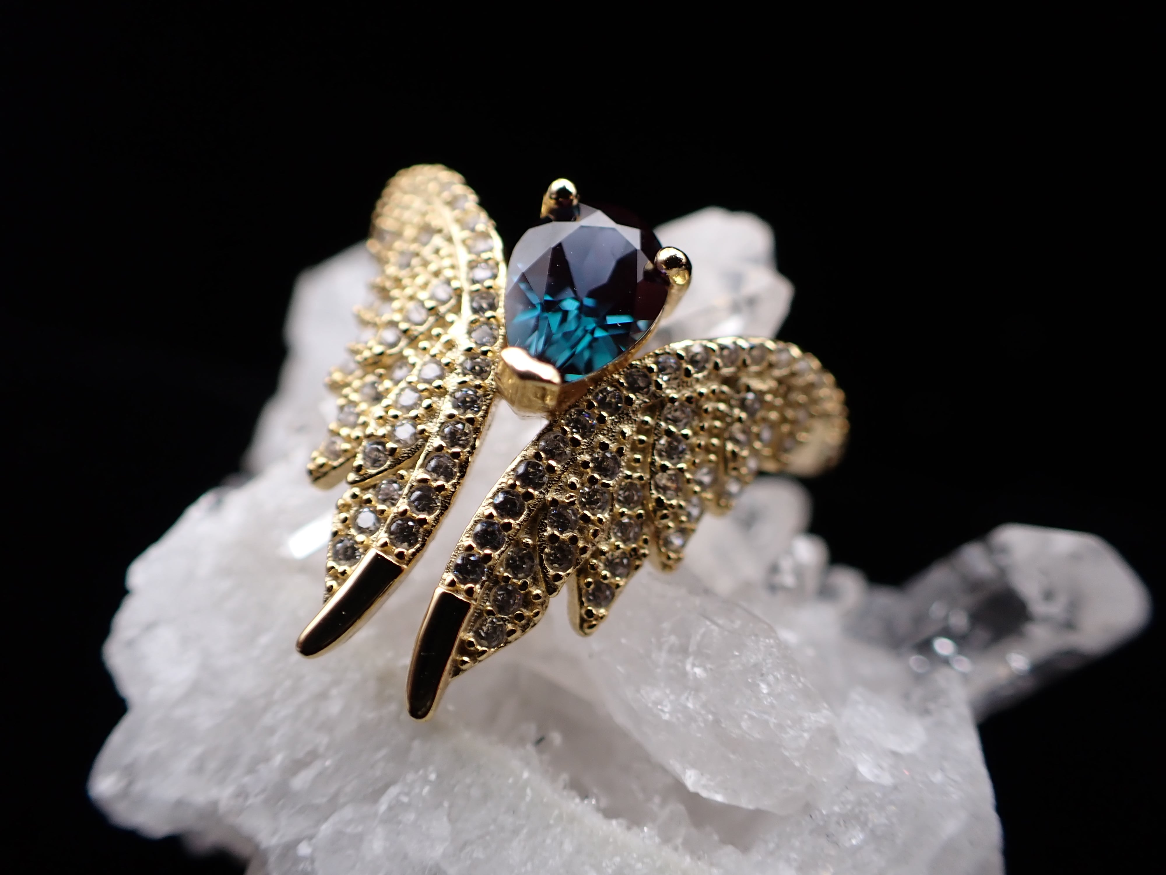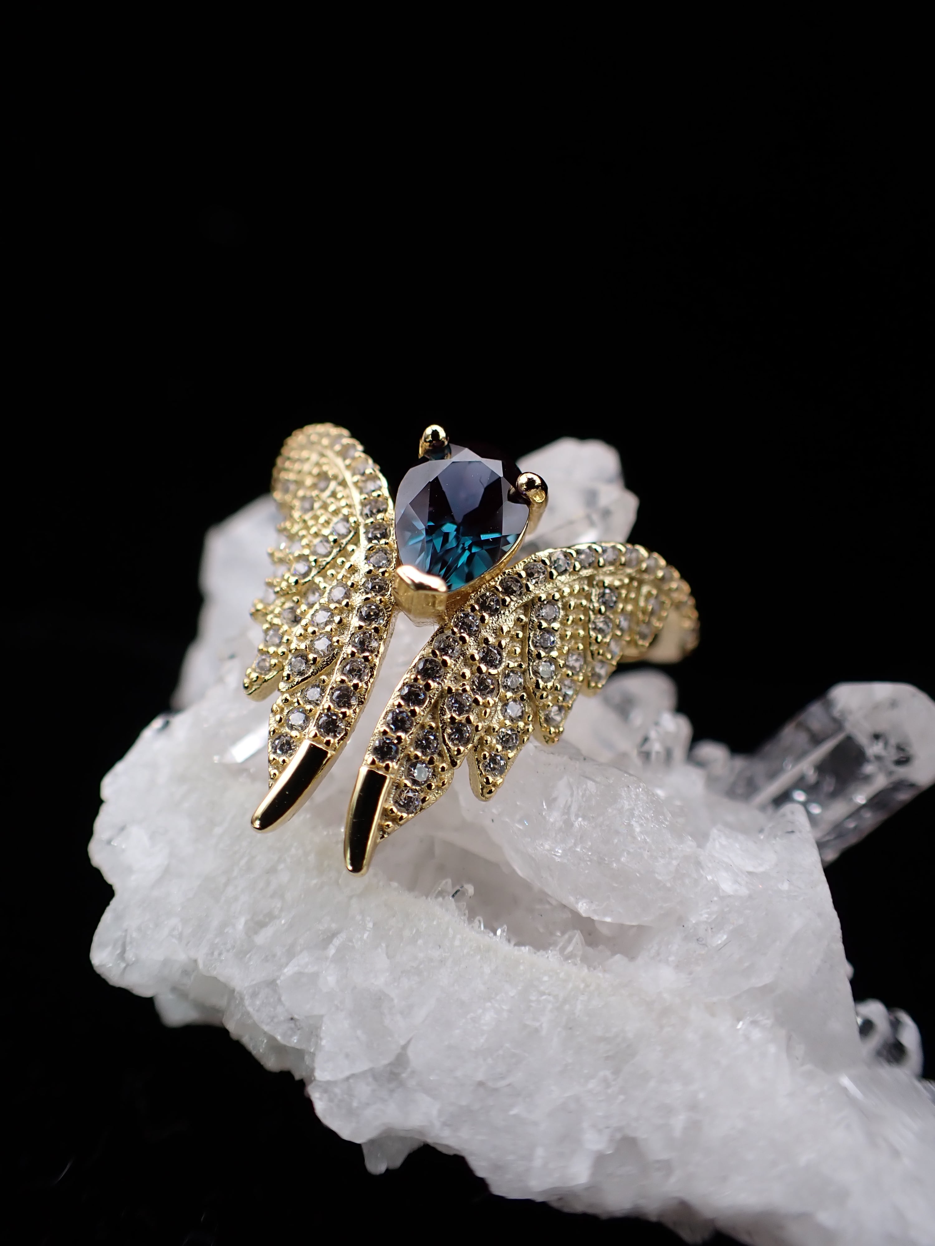 今にも飛び立ちそうな大きな翼のデザインに、カラーチェンジと蛍光の美しい合成アレキサンドライトを添えたリングです。