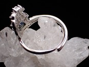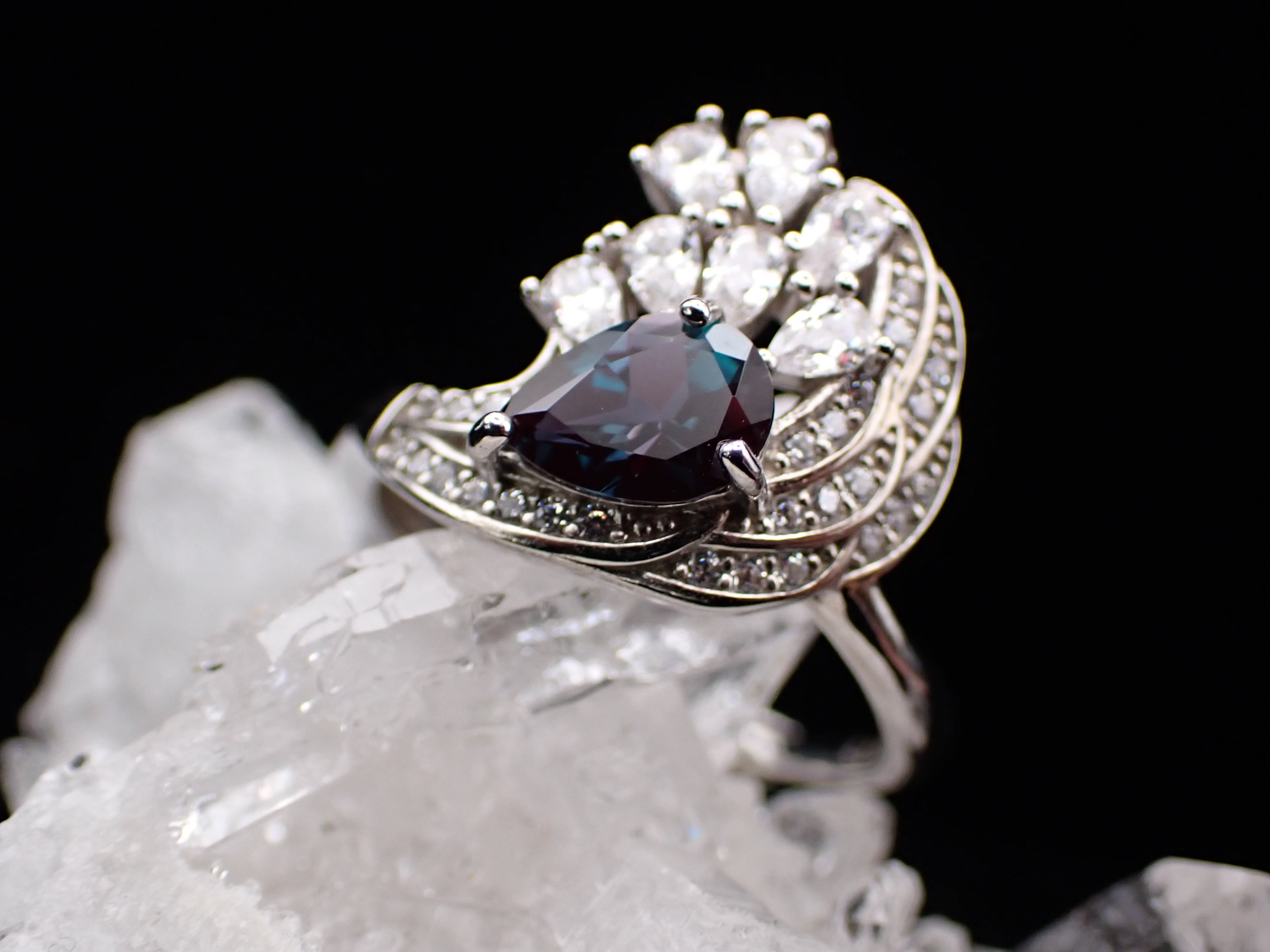 仮面舞踏会に出てきそうな美しい孔雀が羽根を翻したようデザインに、カラーチェンジと蛍光の美しい合成アレキサンドライトを添えたリングです。