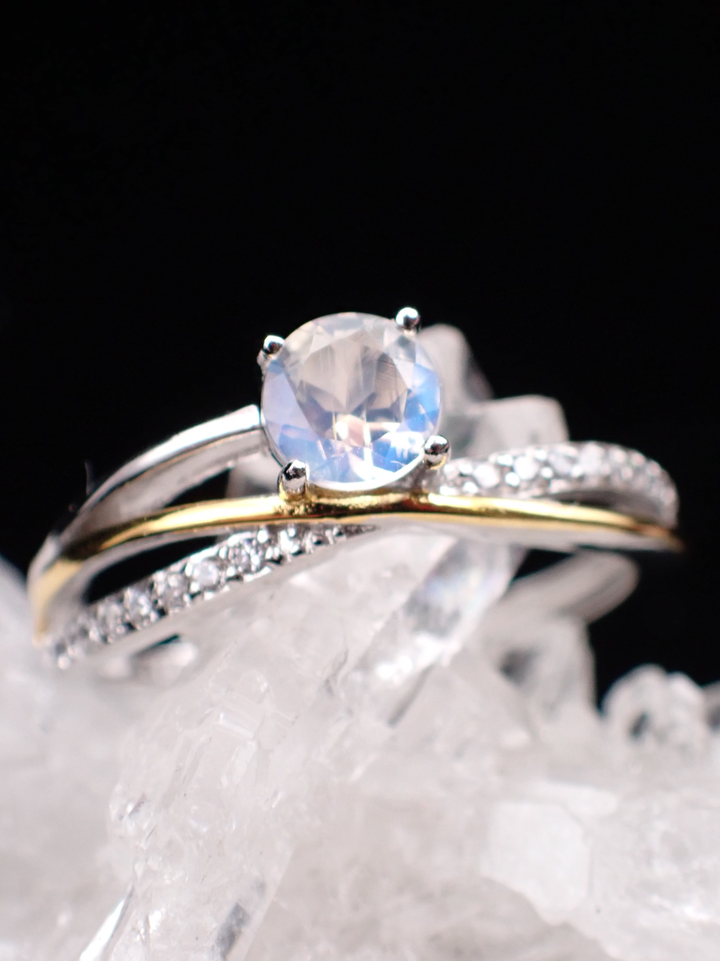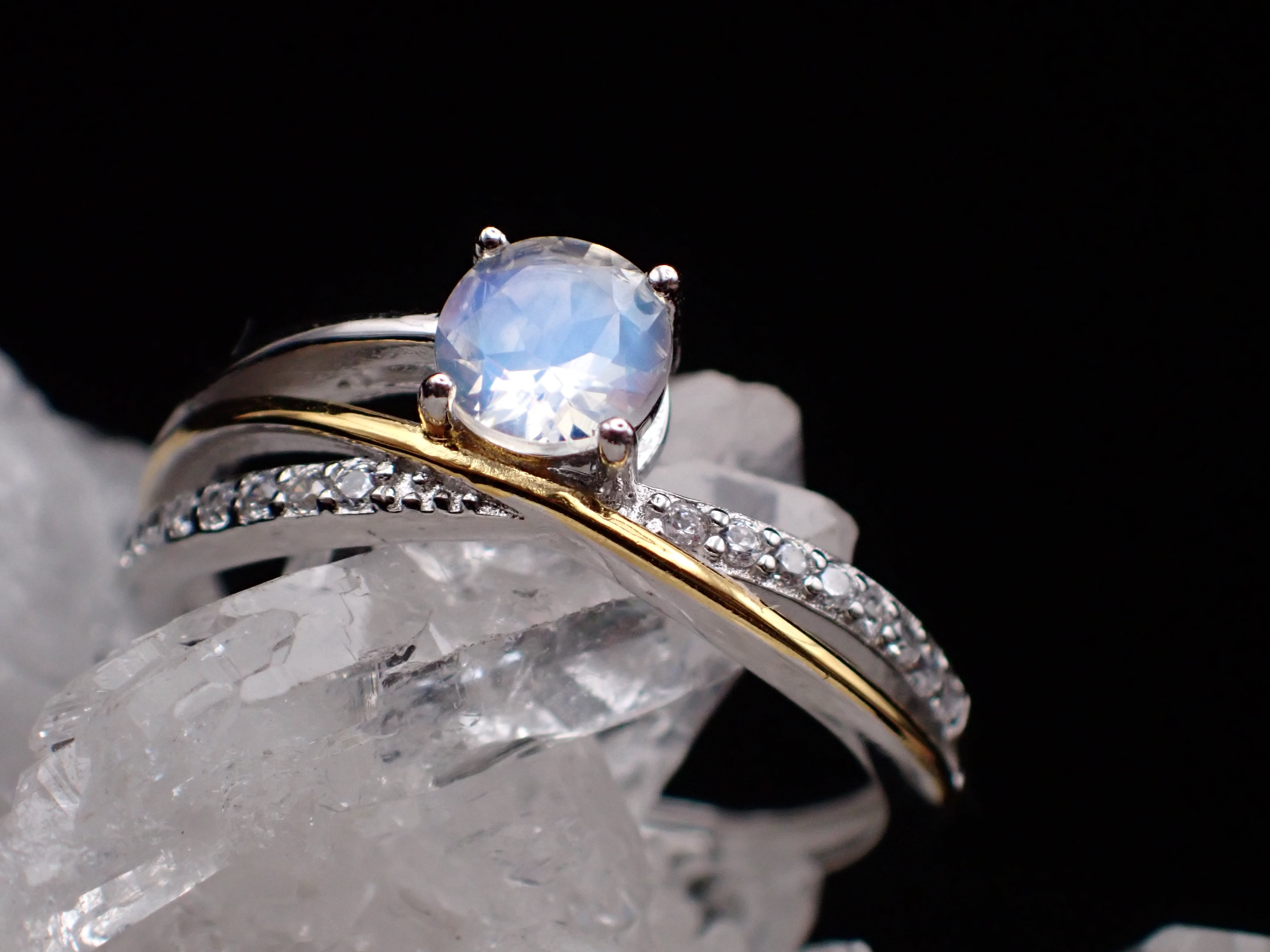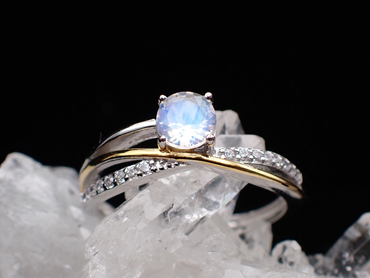 流れるようなゴールドとシルバーが交差する中央に、ふわりとしたシラーが輝く、美しいアンデシンラブラドライトが鎮座します。