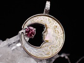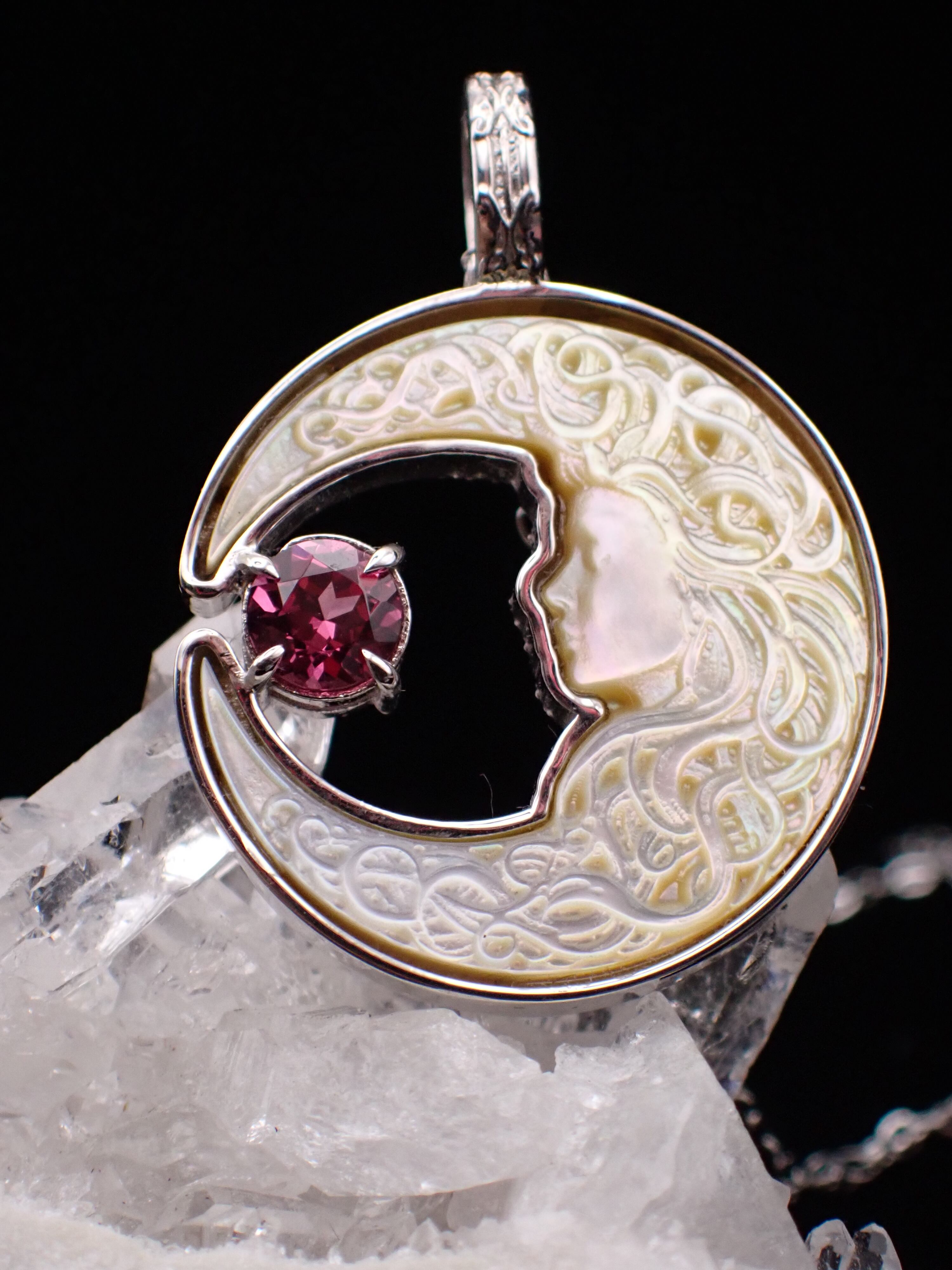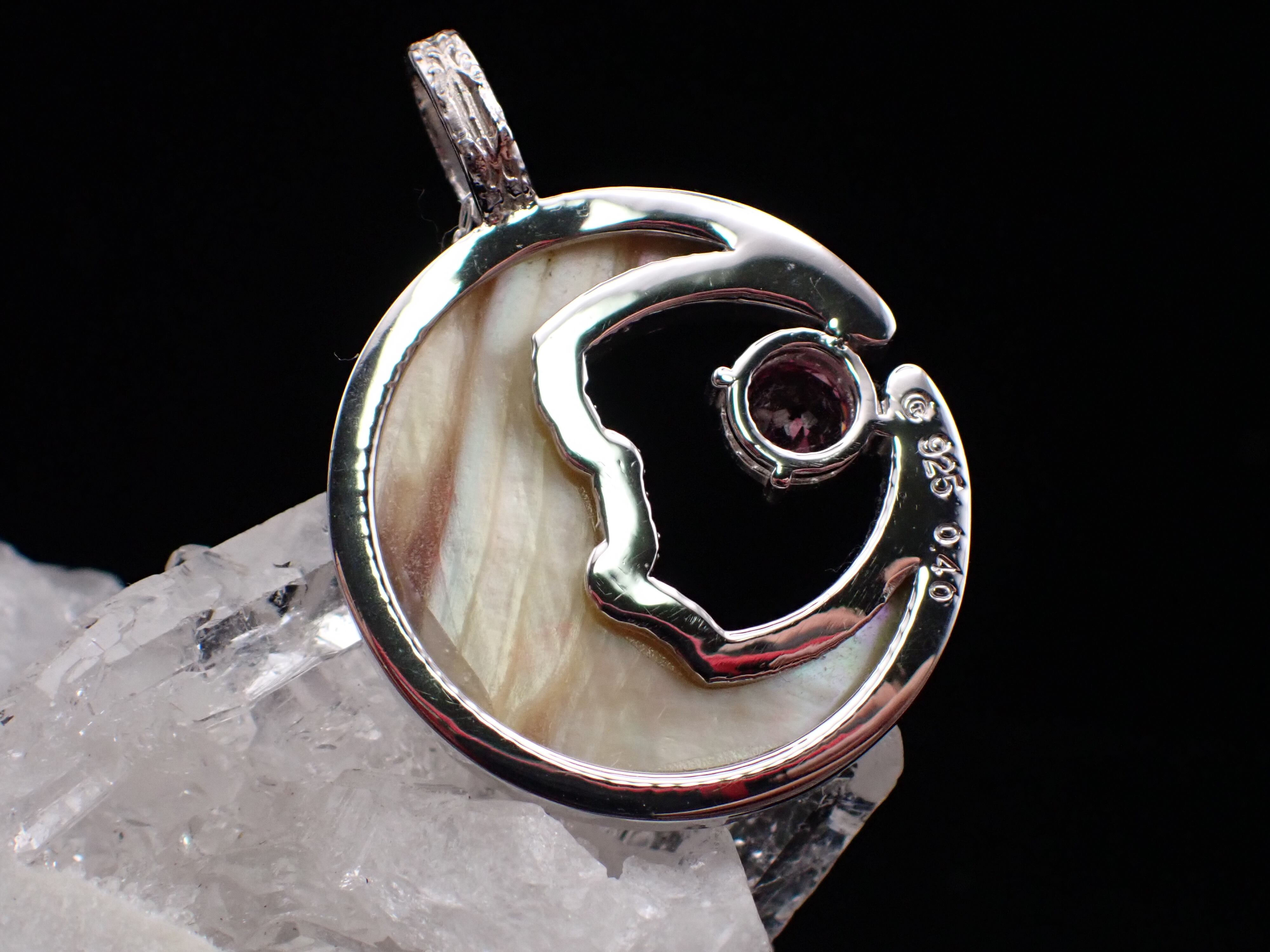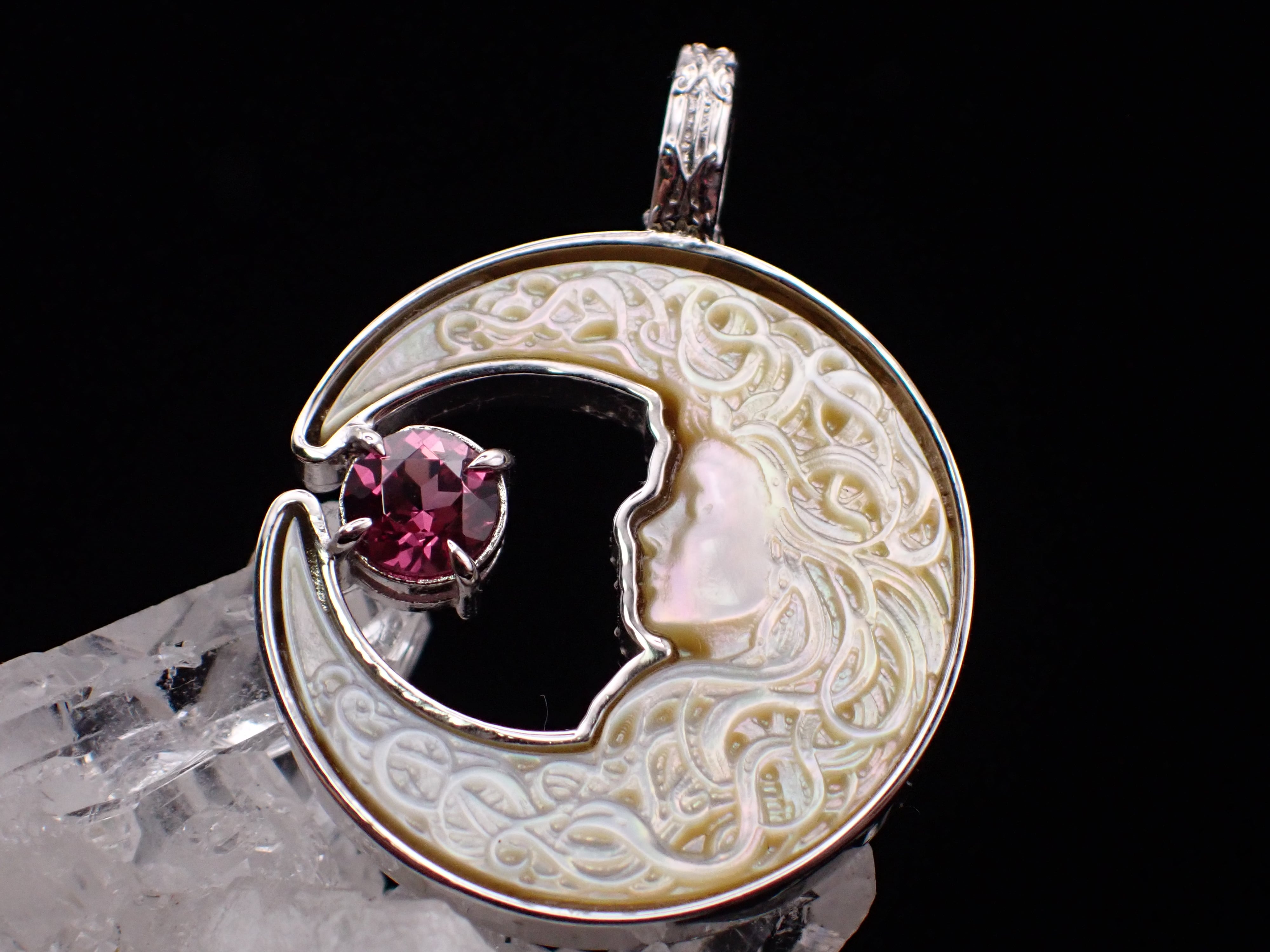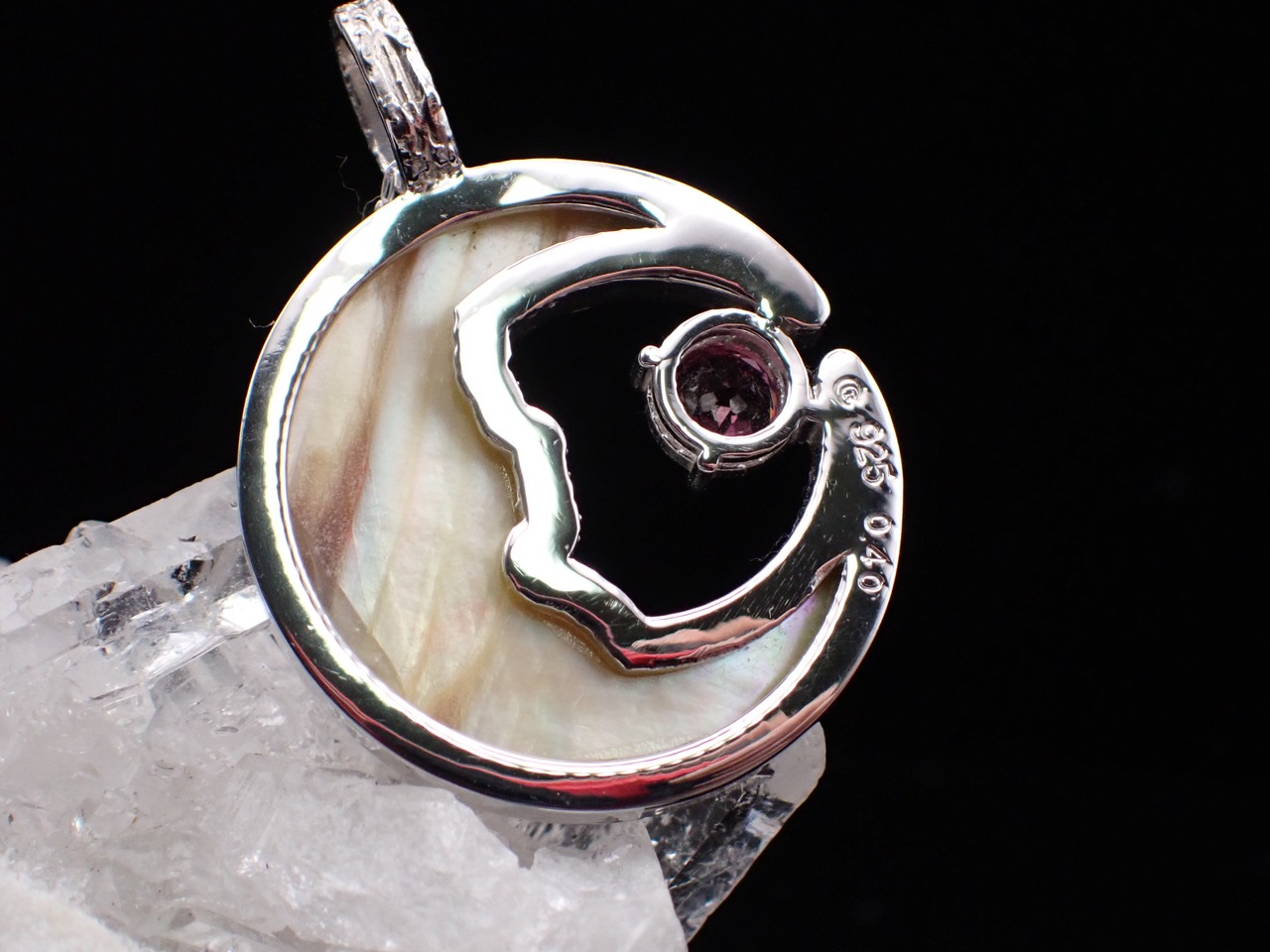 美しく描かれた白蝶貝の月の中に、優しく輝くロードライトガーネットのペンダントです。