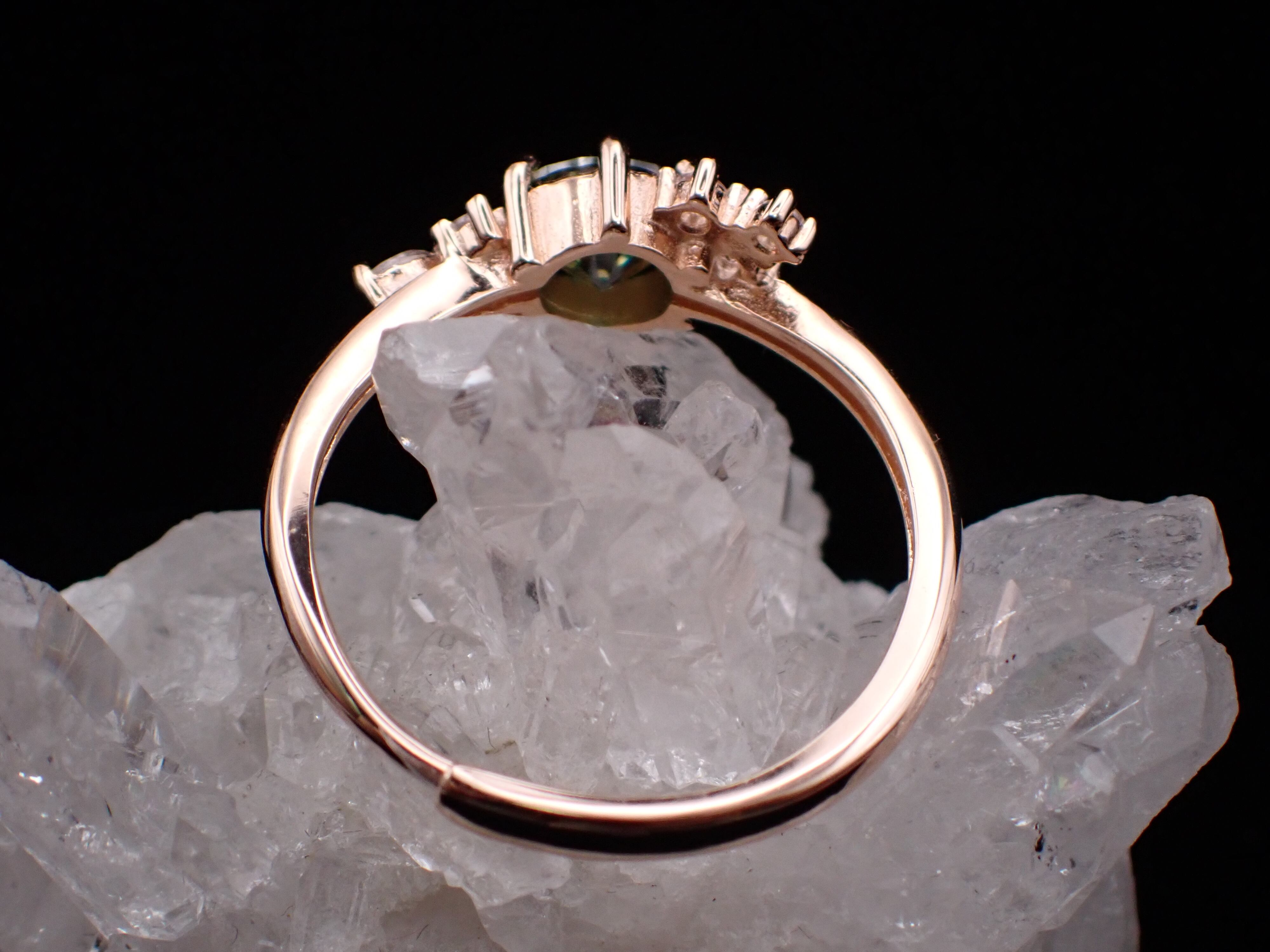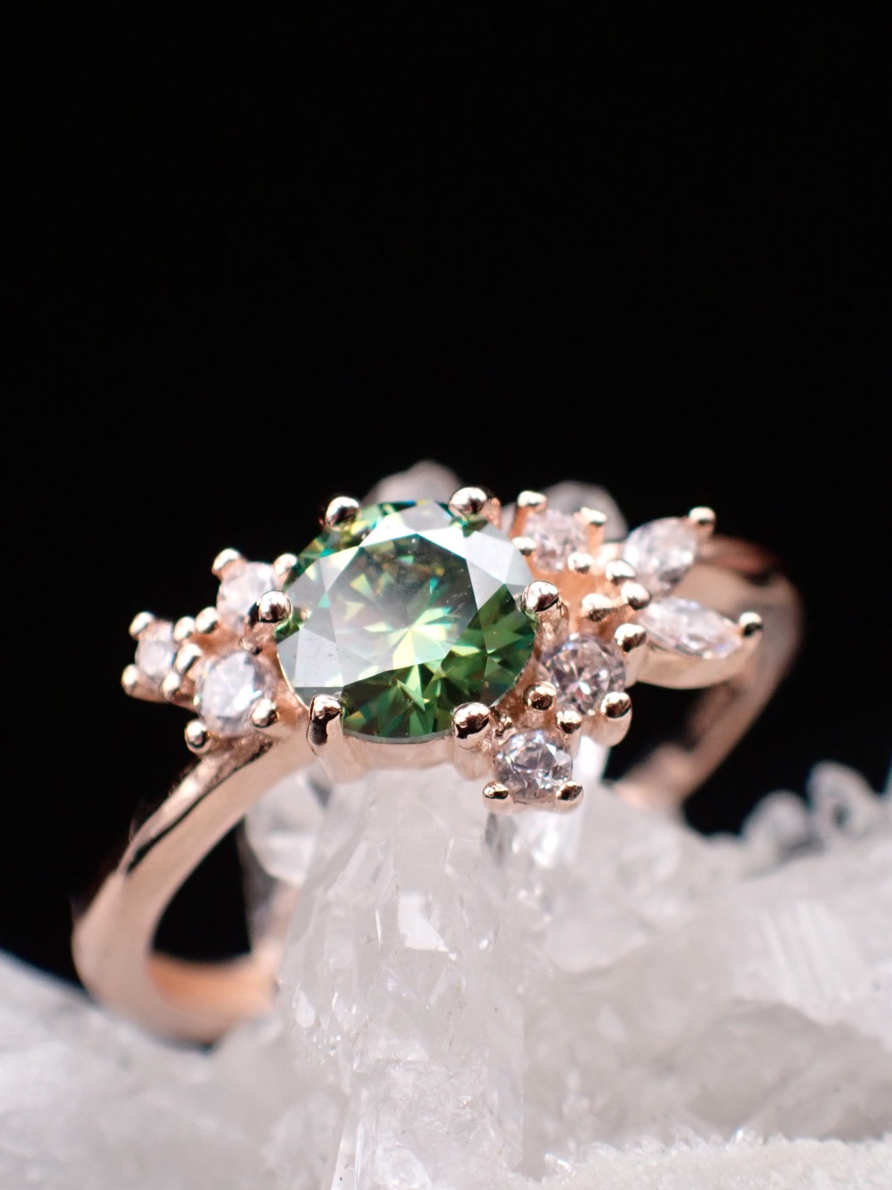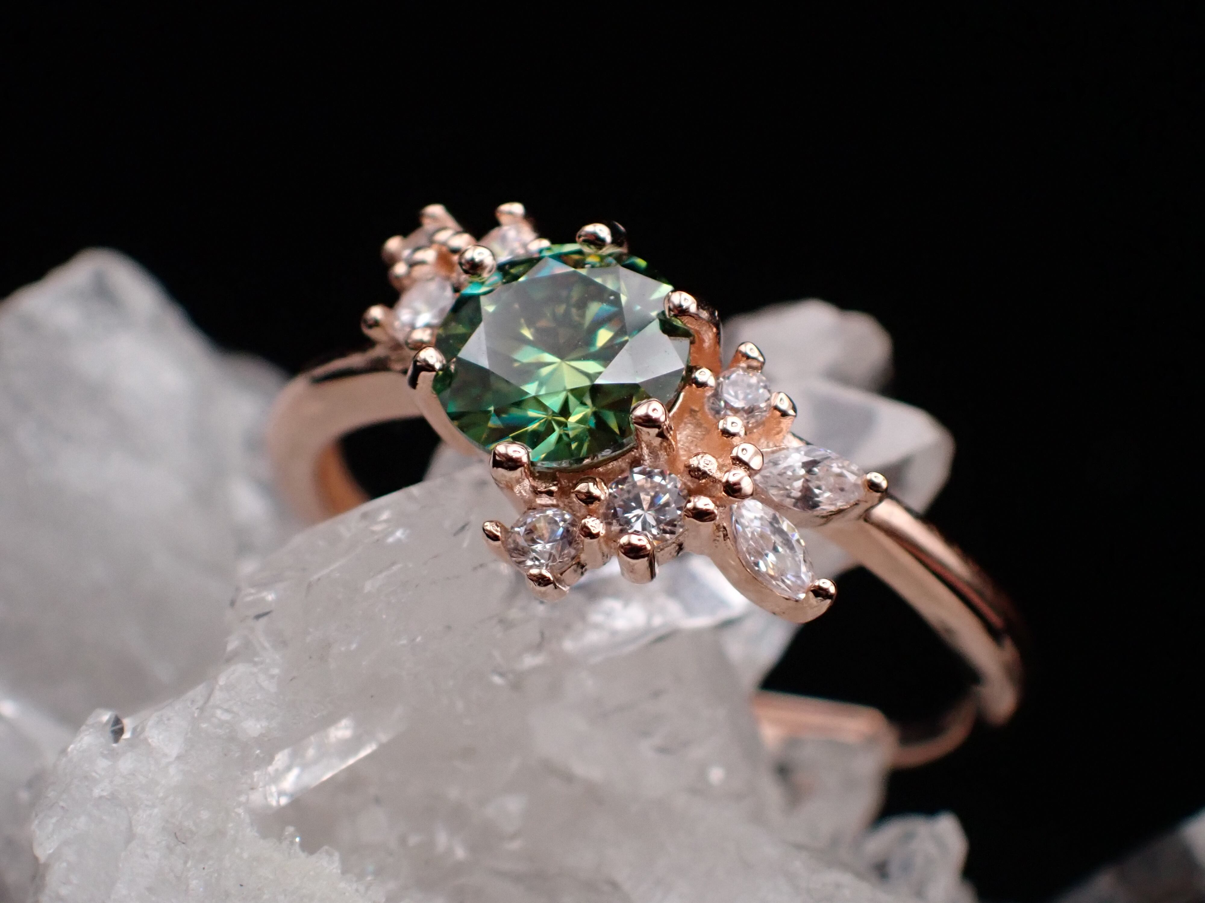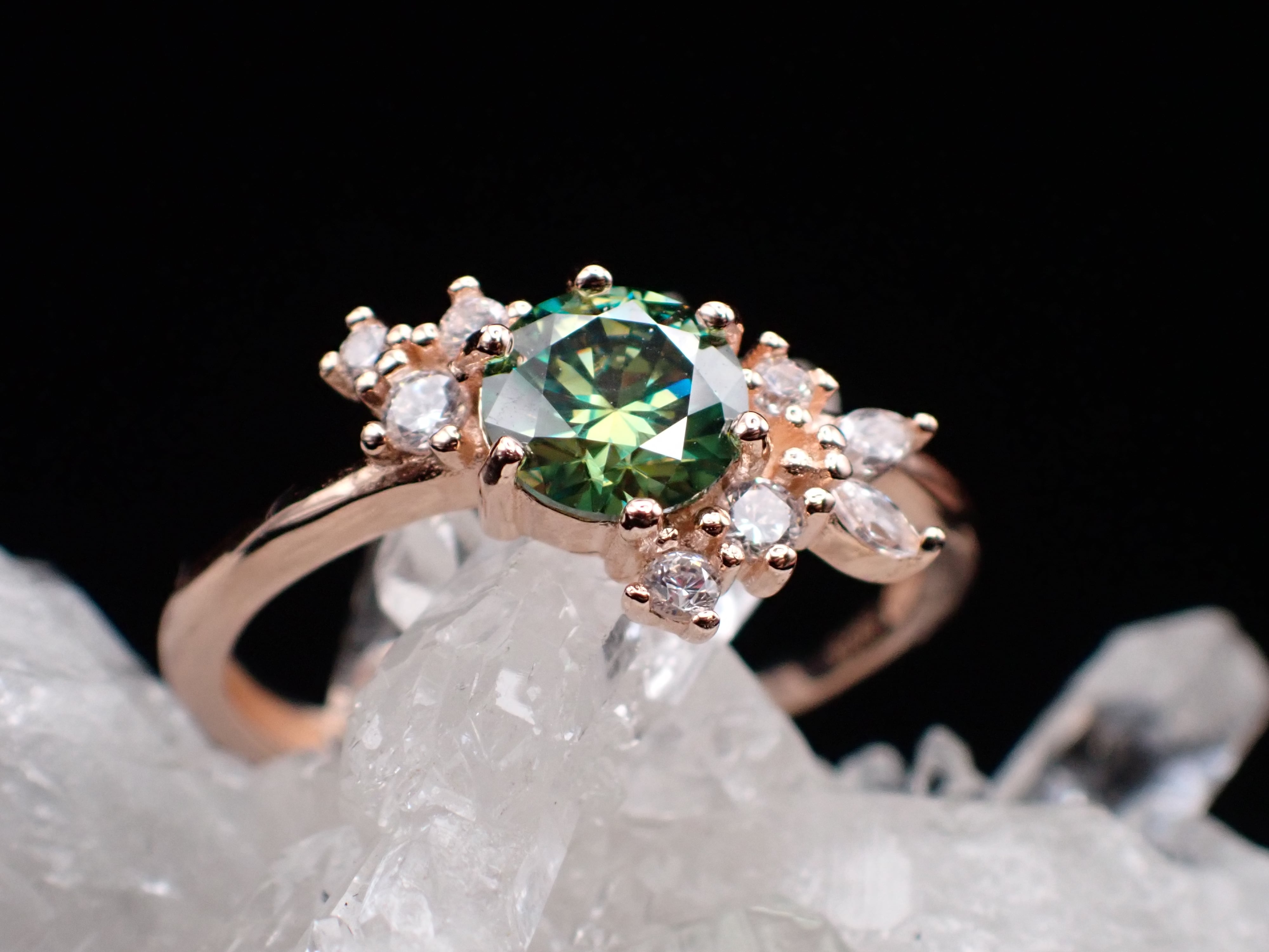 花束のように並んだ小さなジルコニアたちが、カットが美しいグリーンモアッサナイトをさらに輝かせる繊細なリングです。