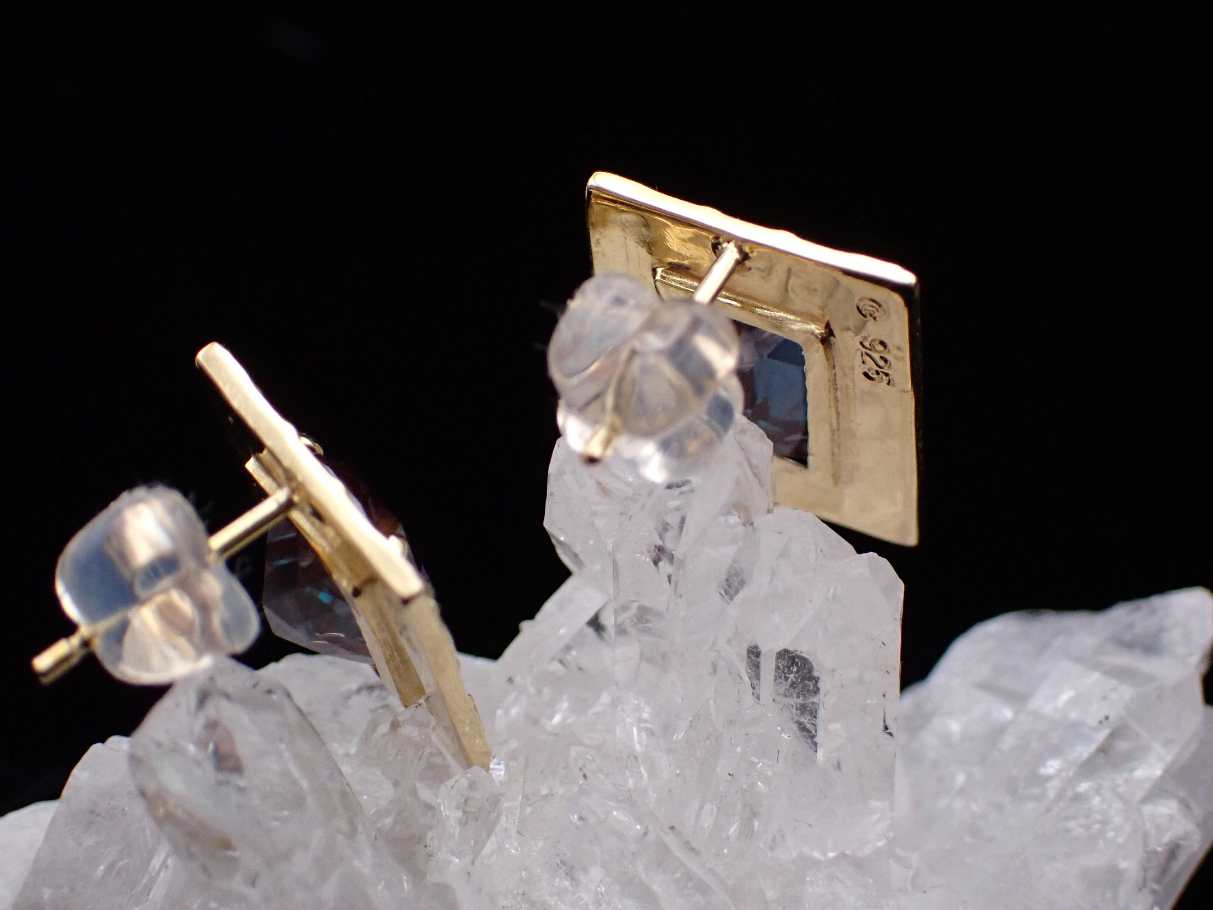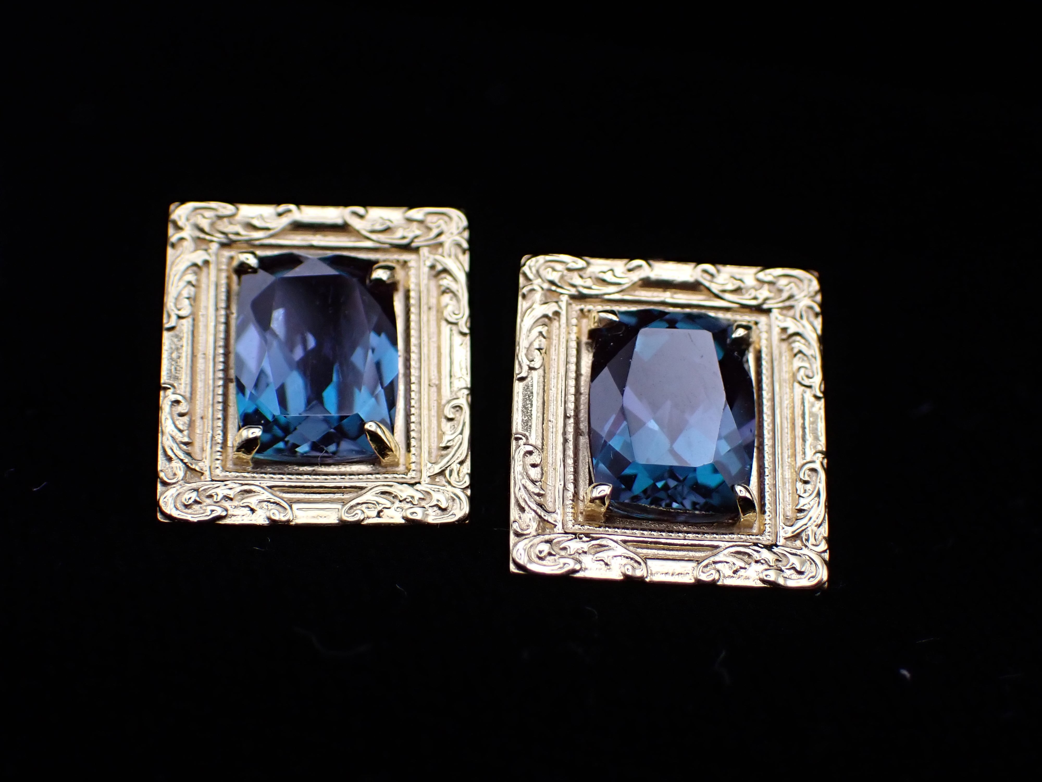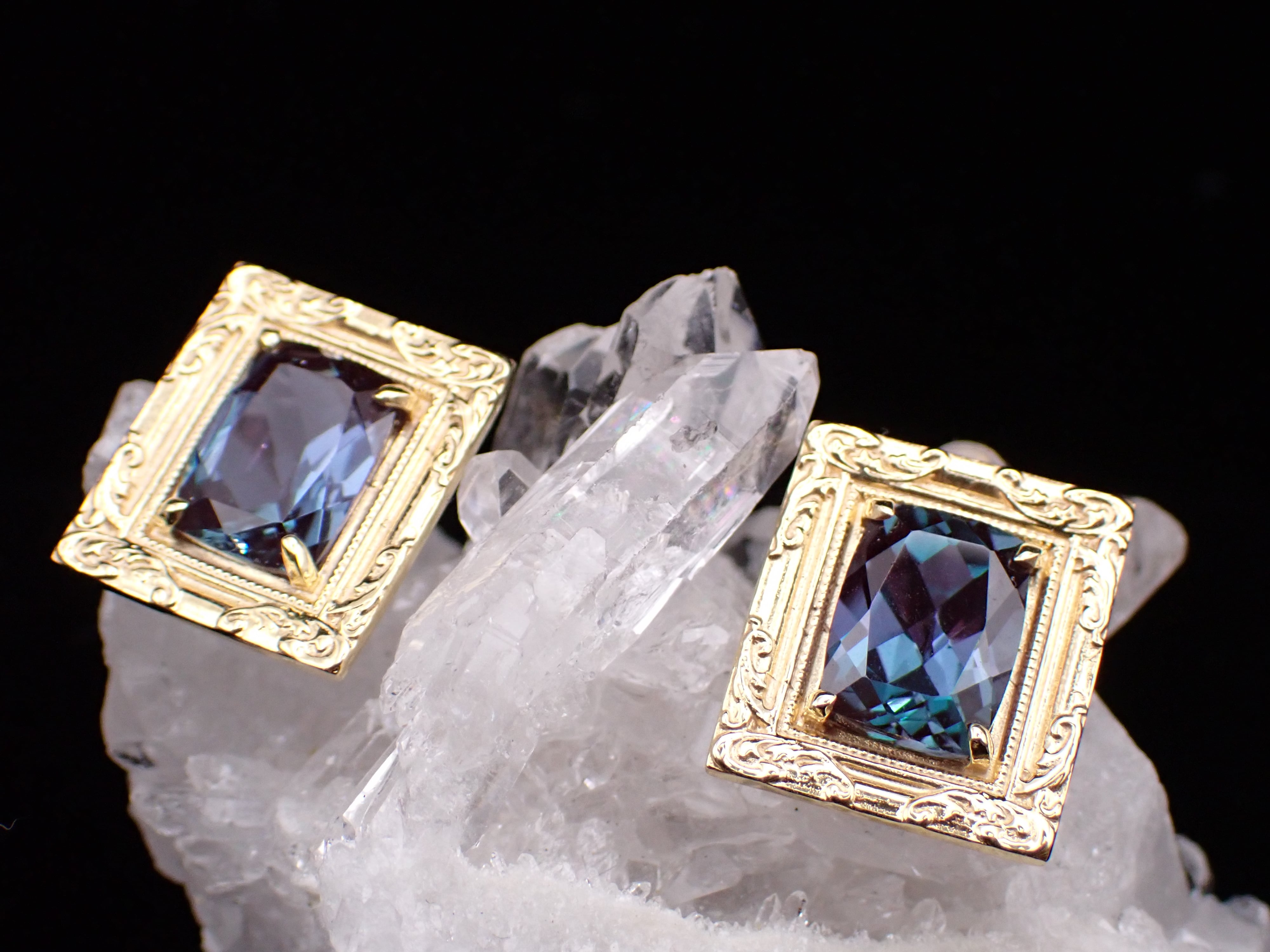 カラーチェンジと蛍光の美しい合成アレキサンドライトを絵画のように、美しい額縁の中へ納めました。