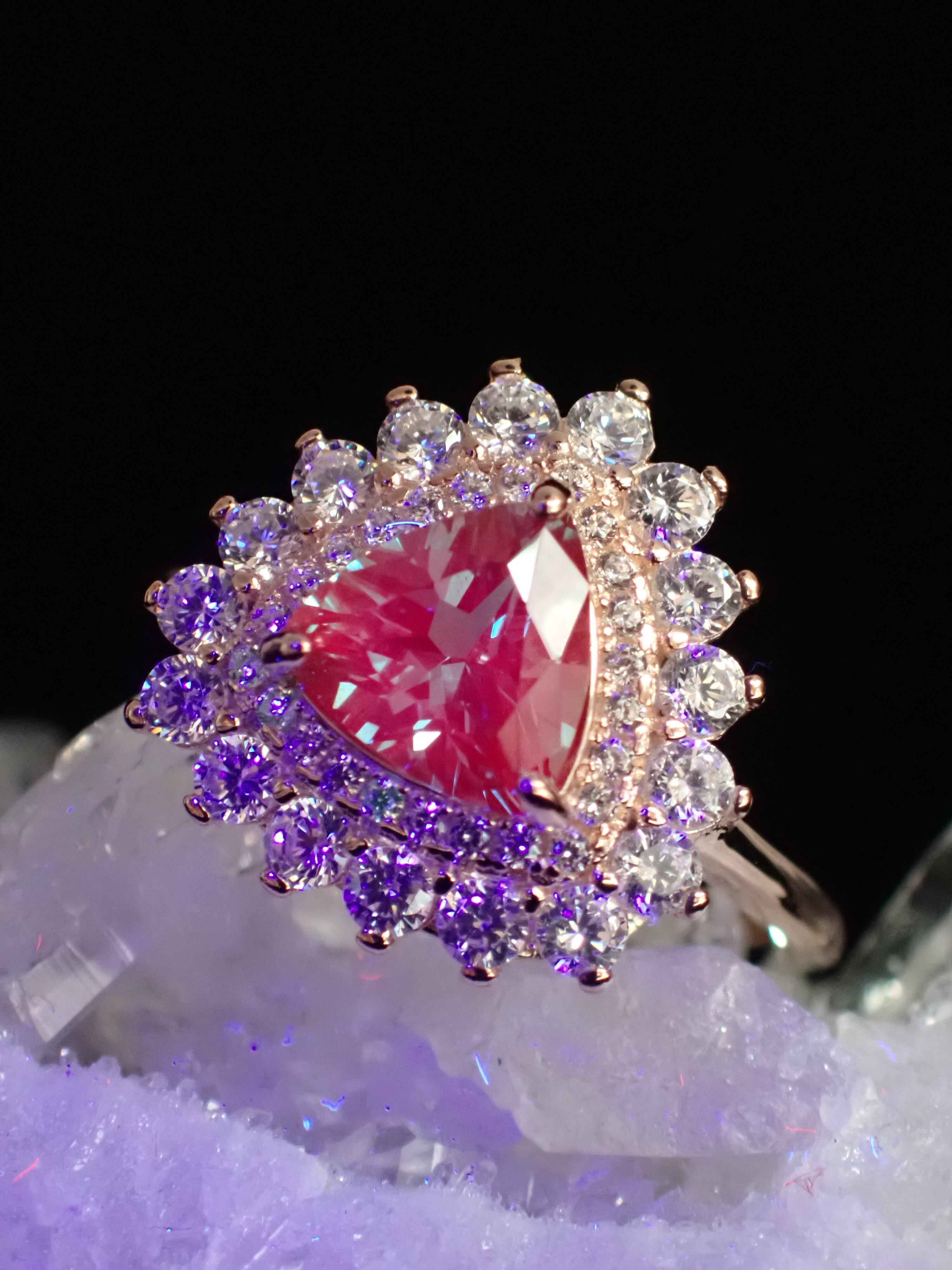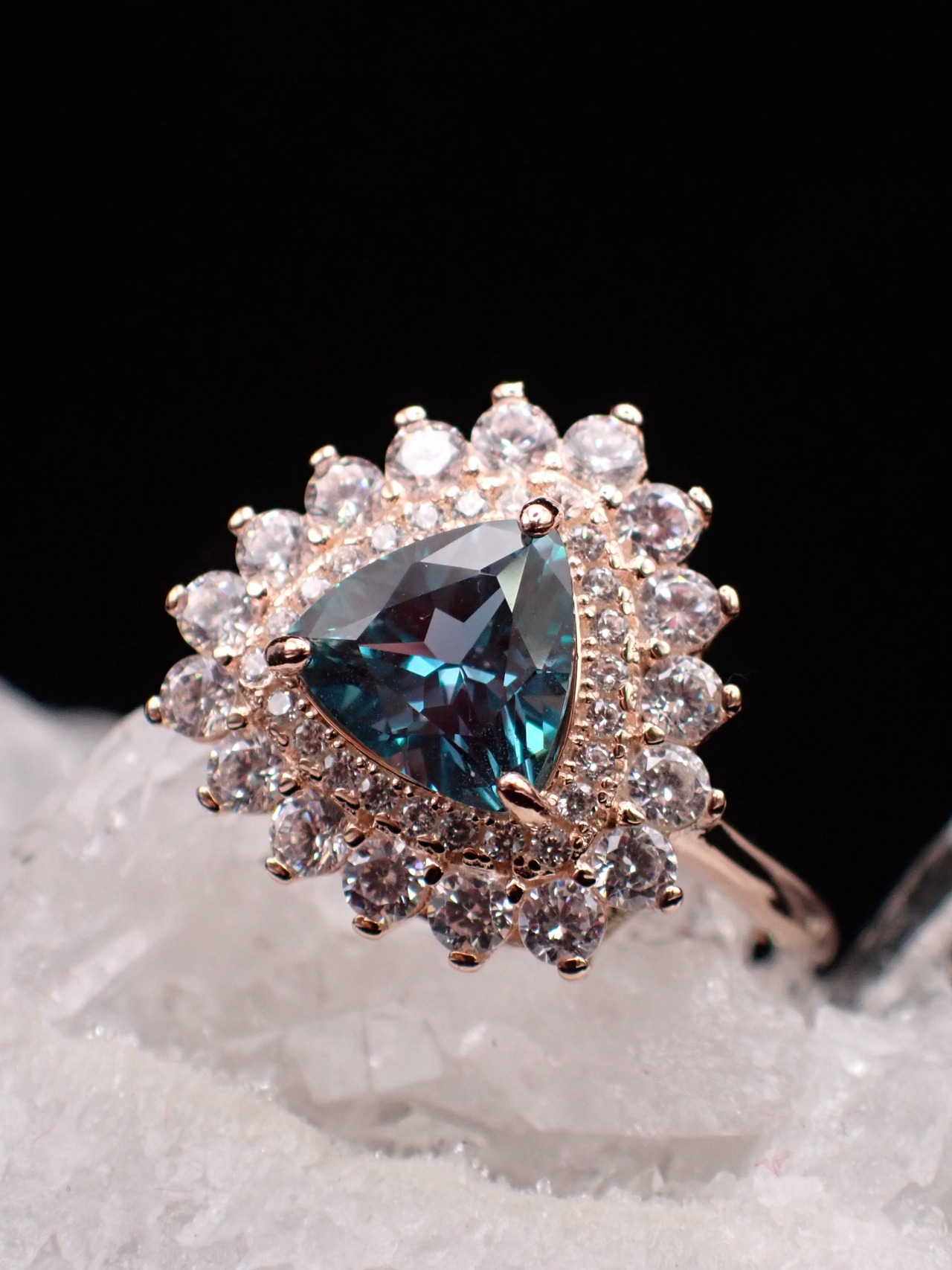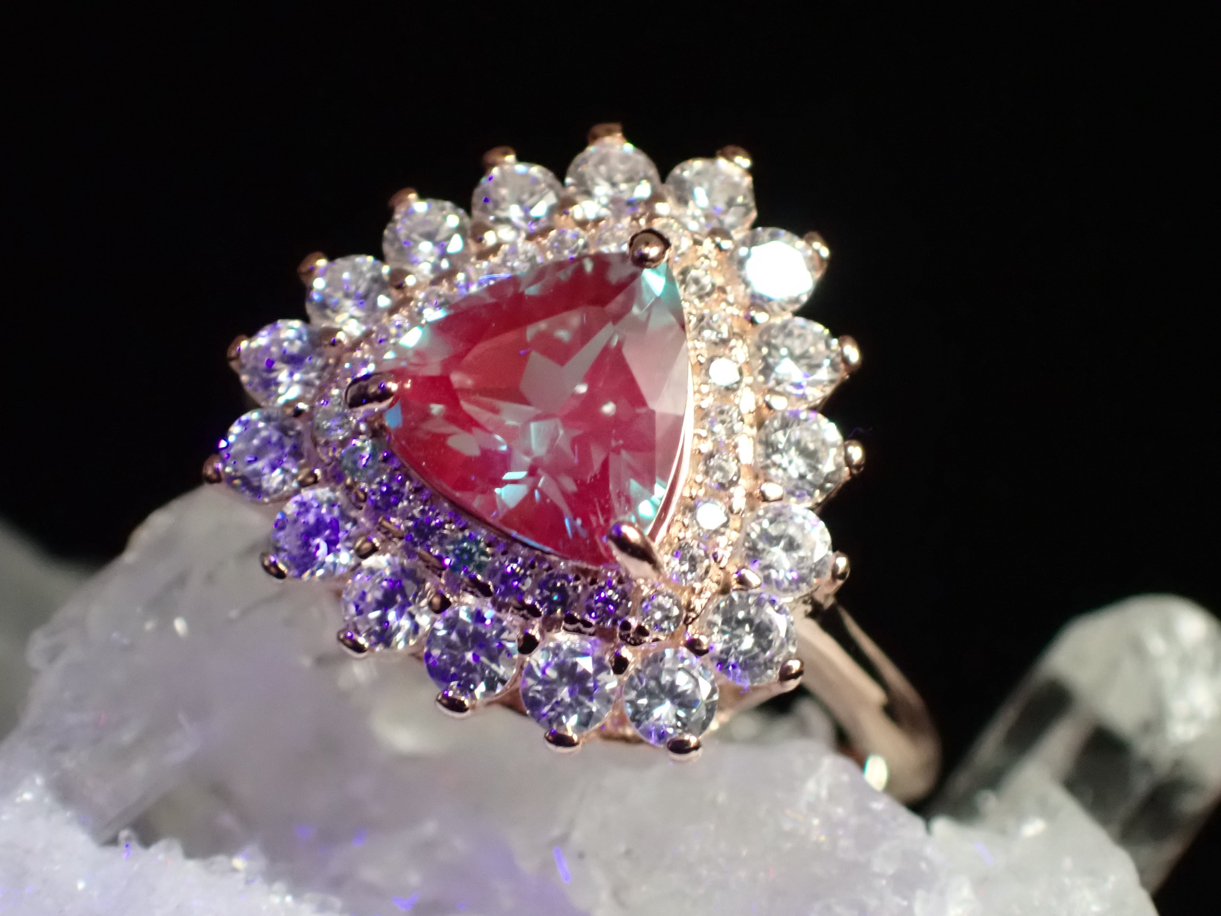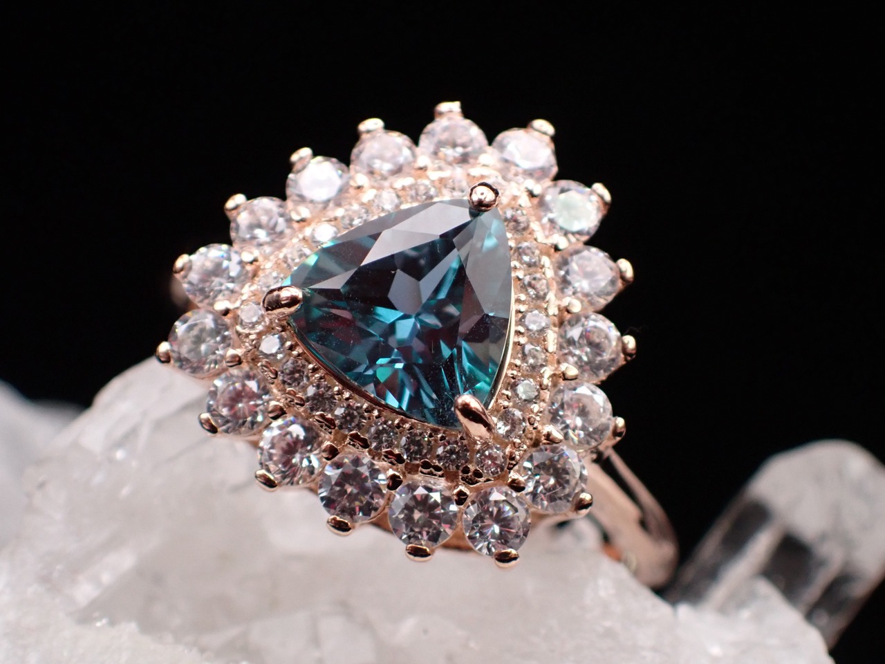 煌びやかに散るジルコニアの中央に佇む、美しい合成アレキサンドライトのリングです。