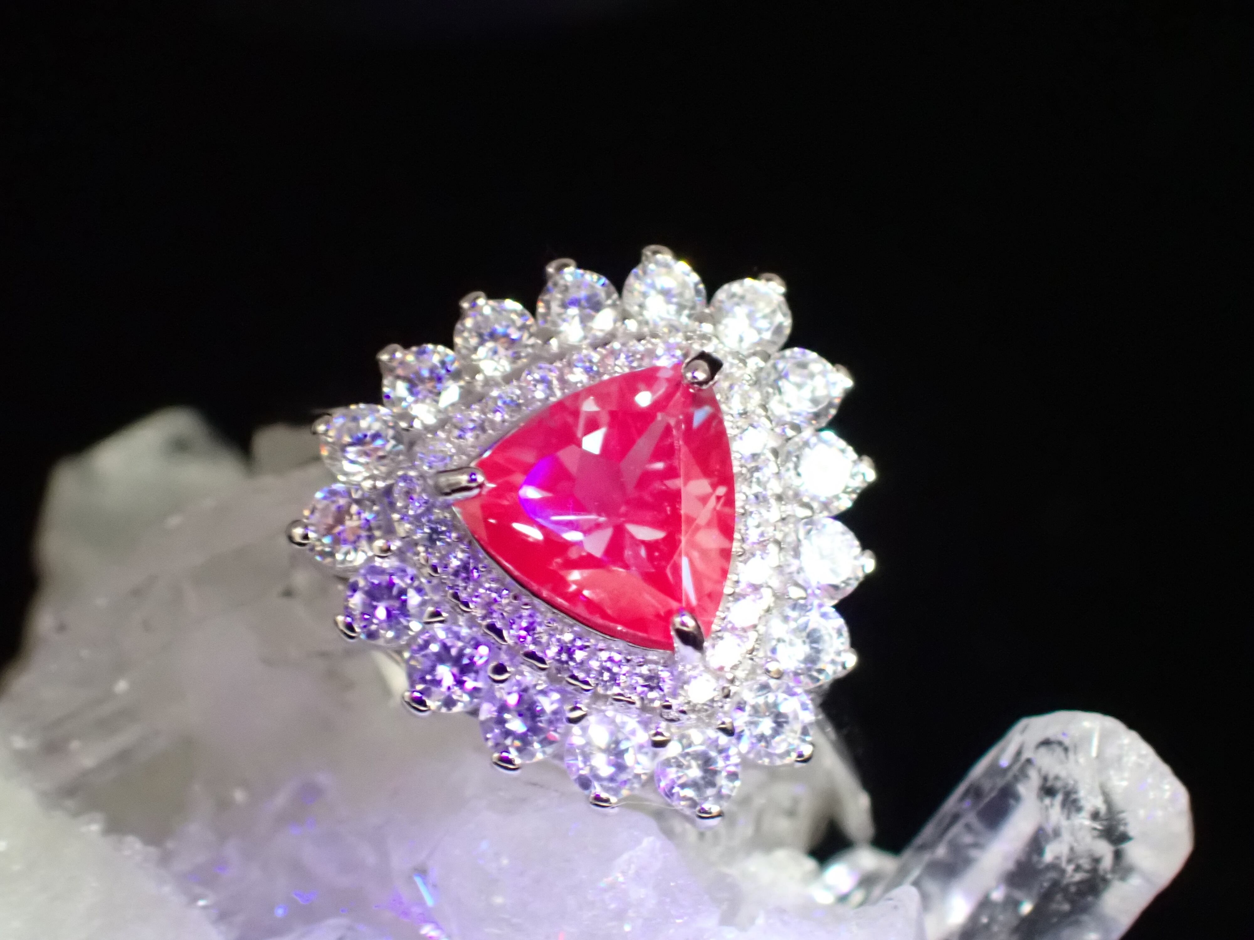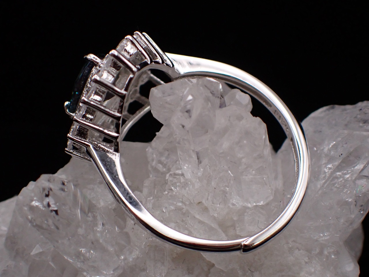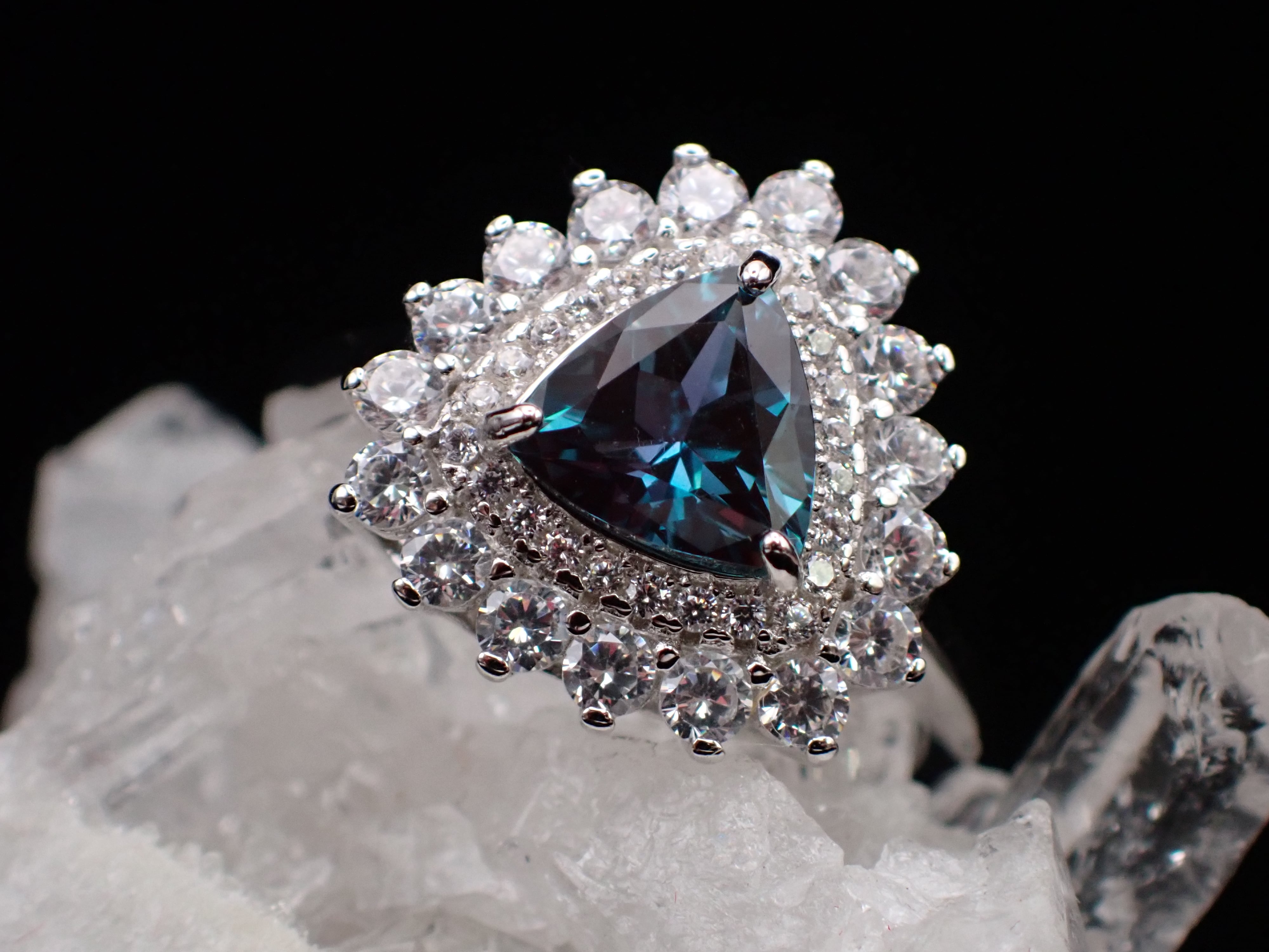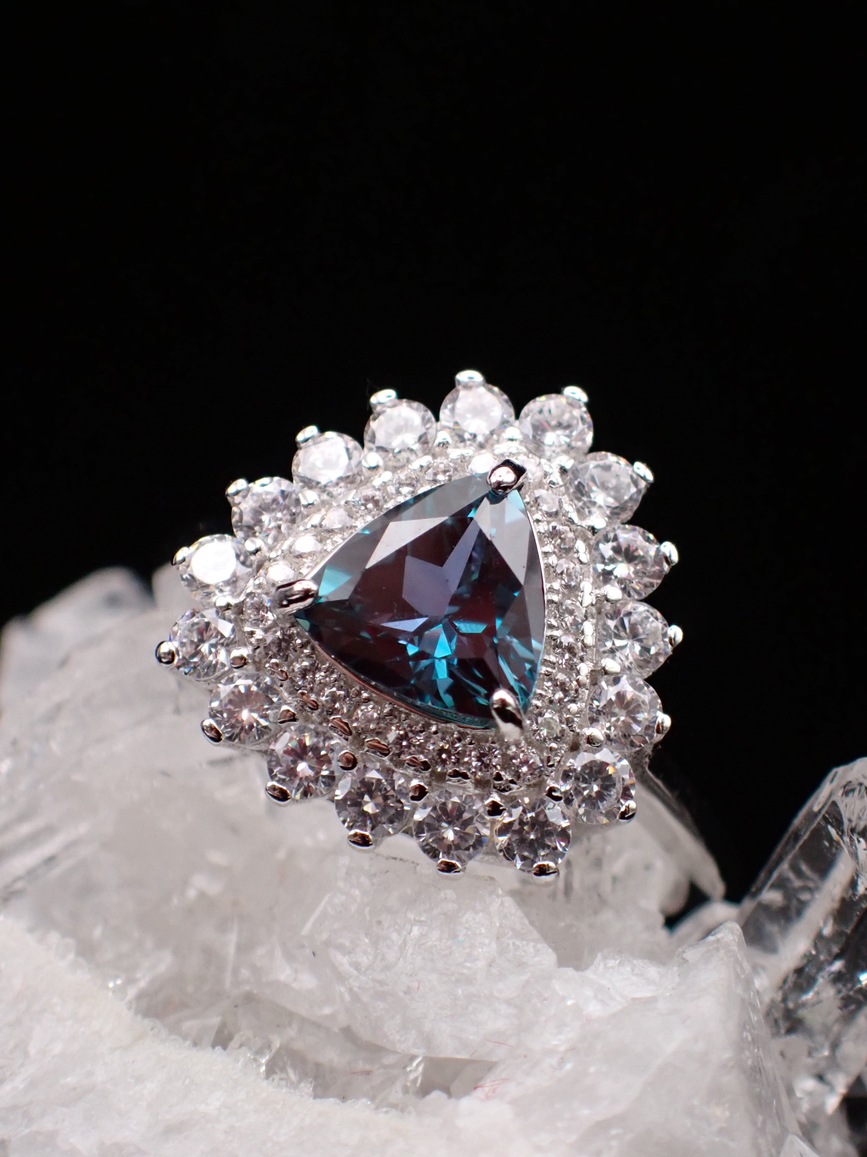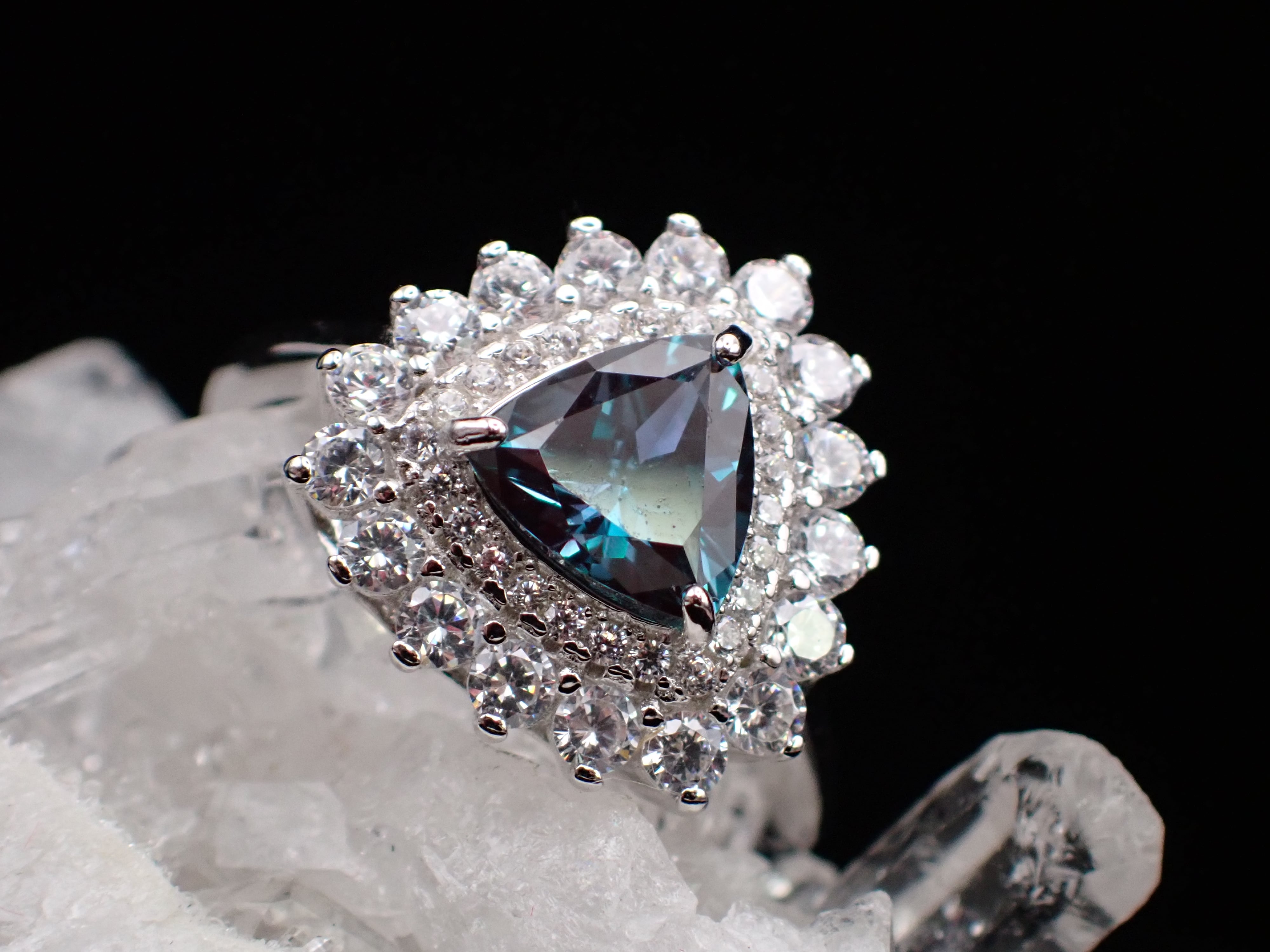 煌びやかに散るジルコニアの中央に佇む、美しい合成アレキサンドライトのリングです。