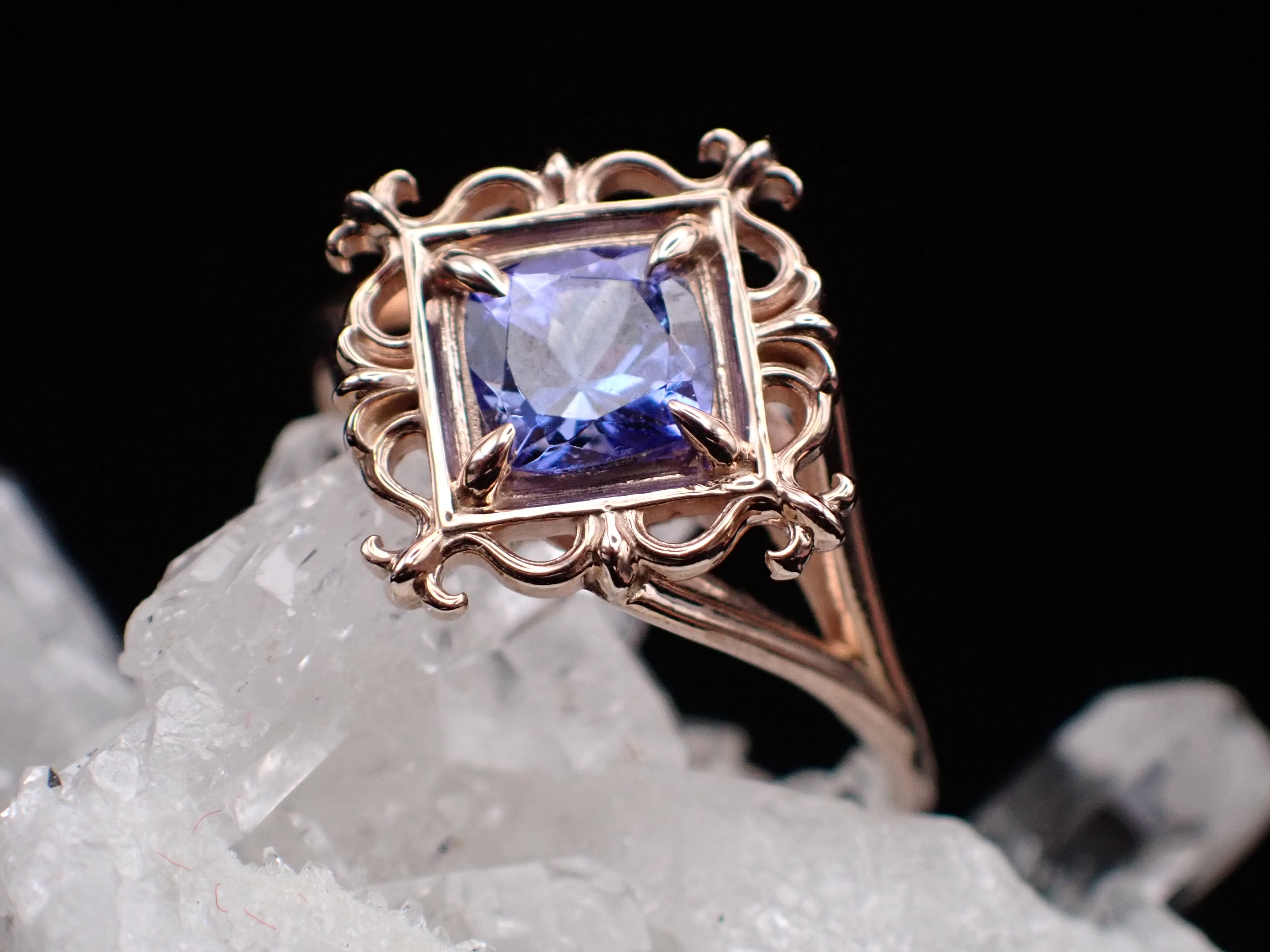 まるで石を絵画のように、美しい額縁の中へタンザナイト を納めました。