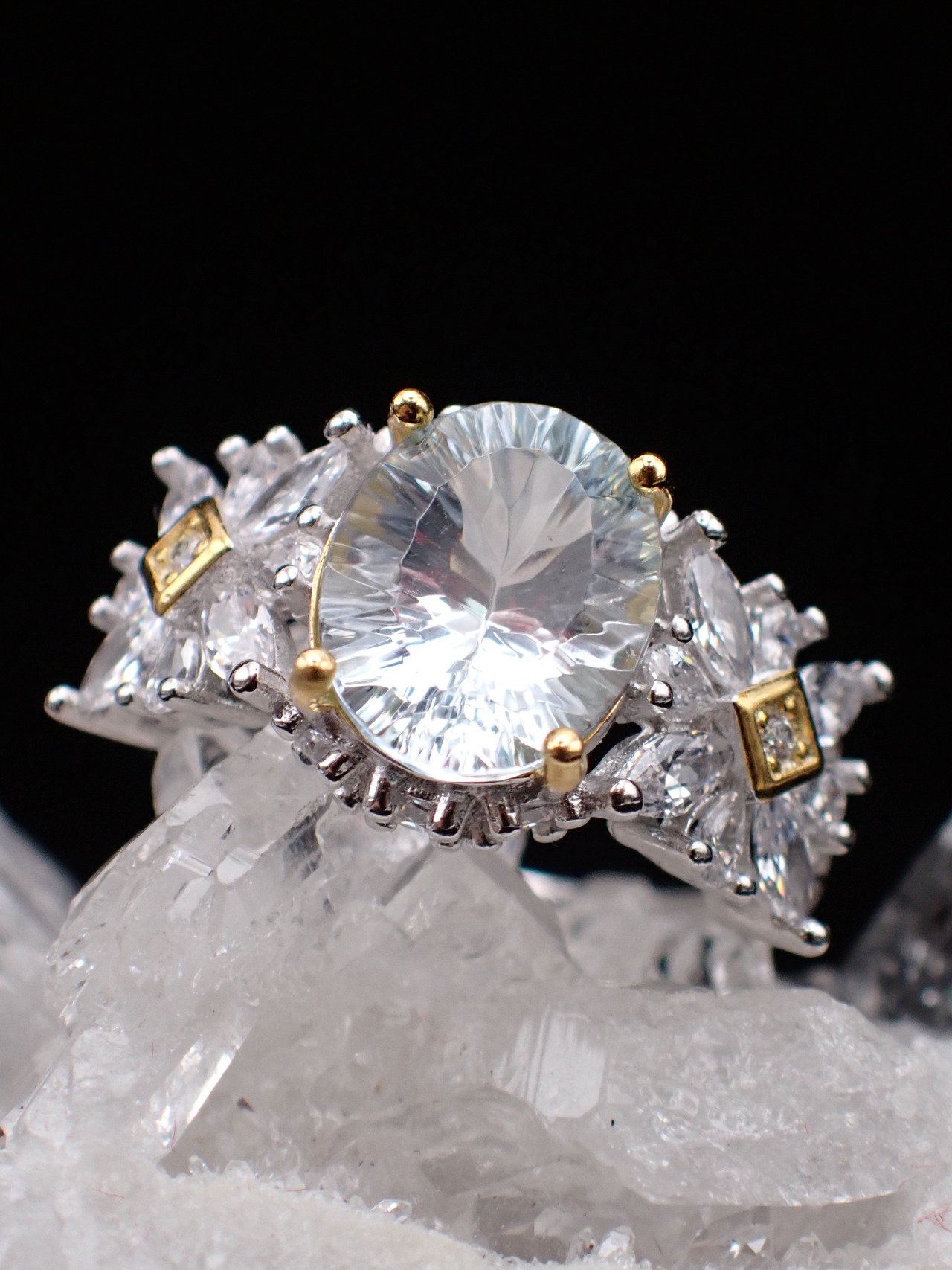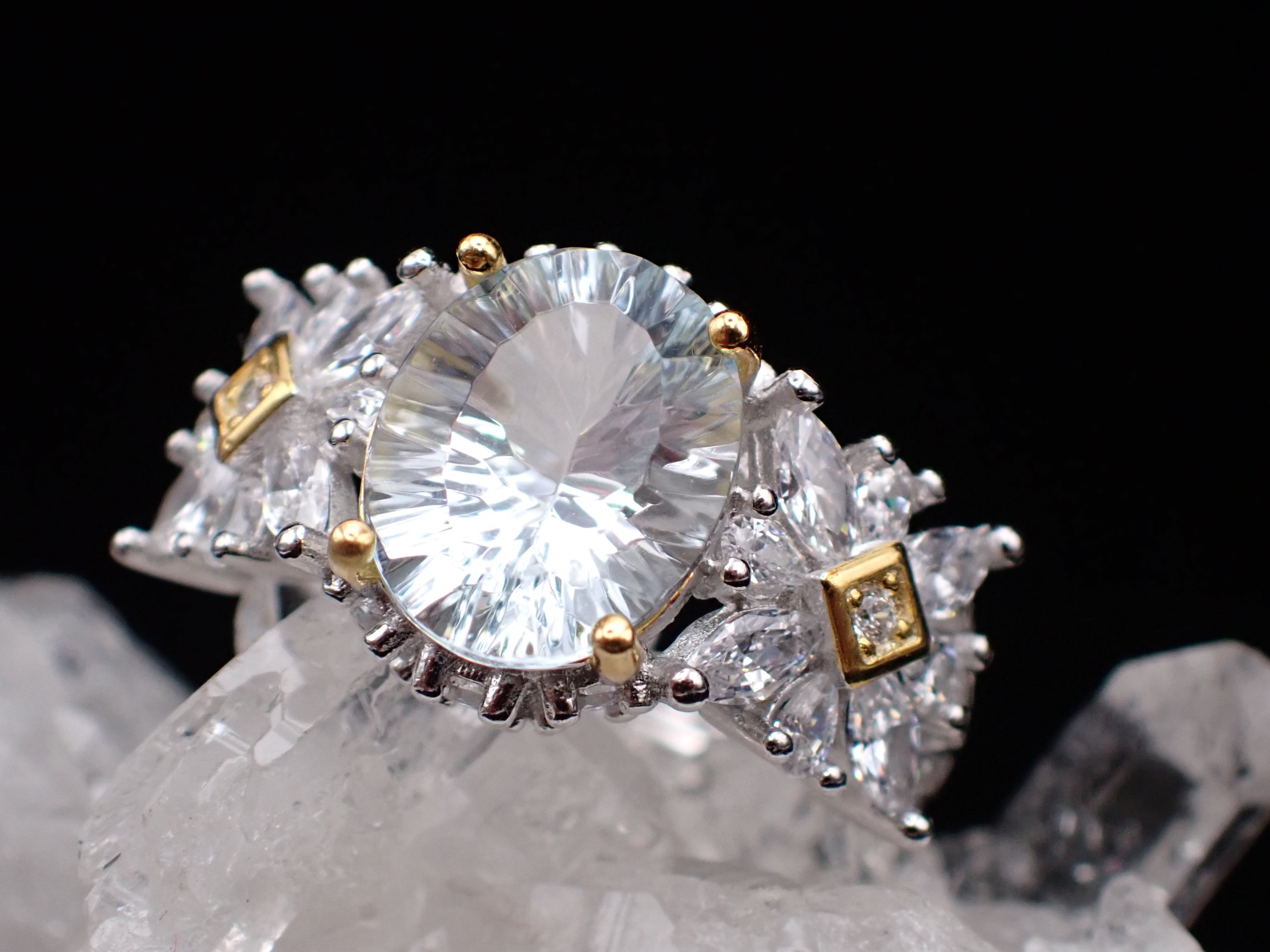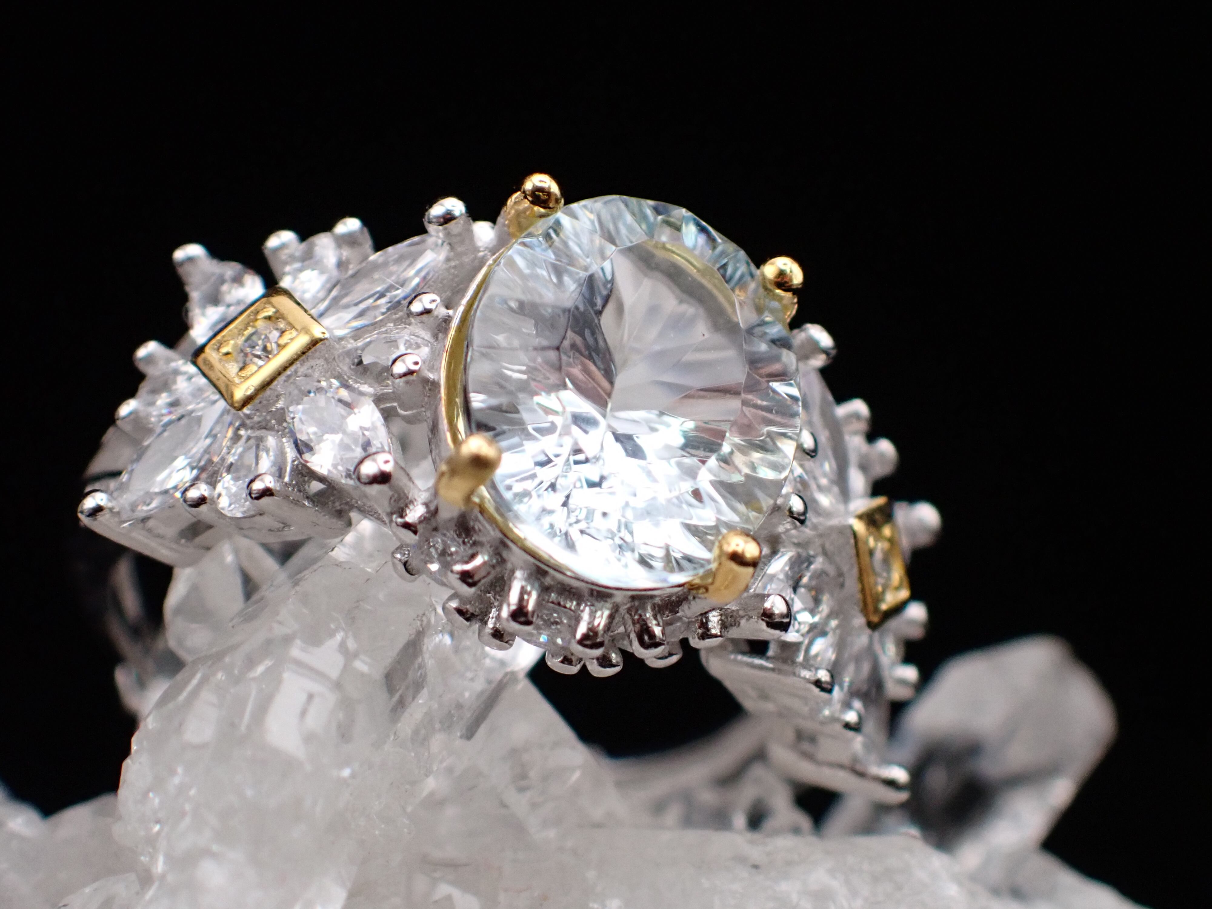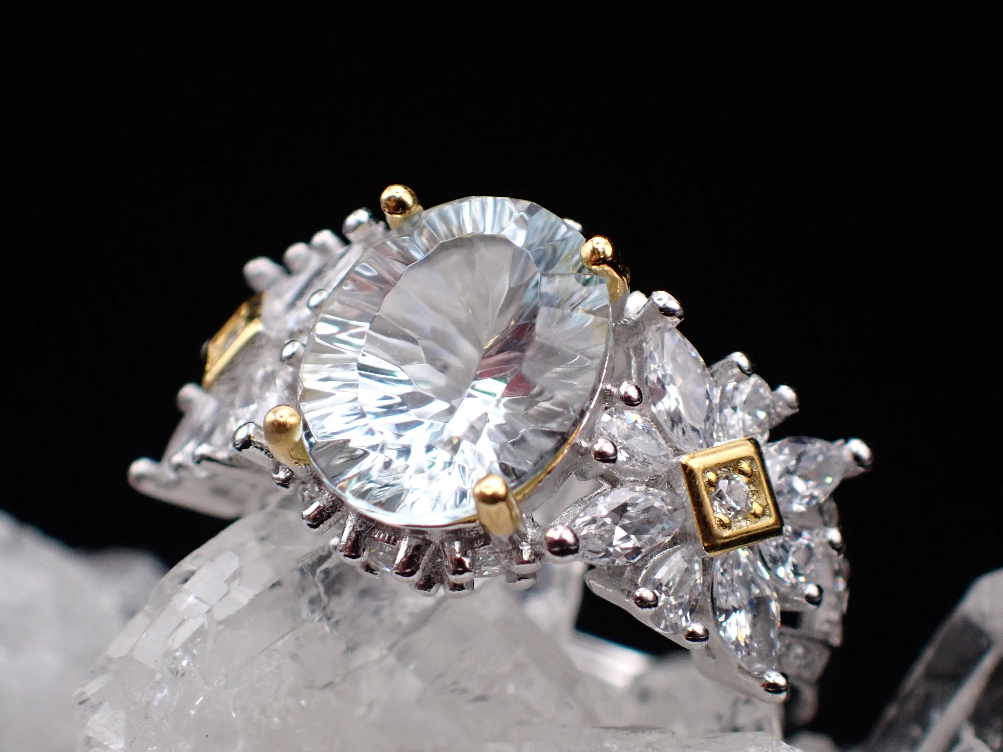 コンケーブカットが美しいアクアマリンを包み込んだリングです。
