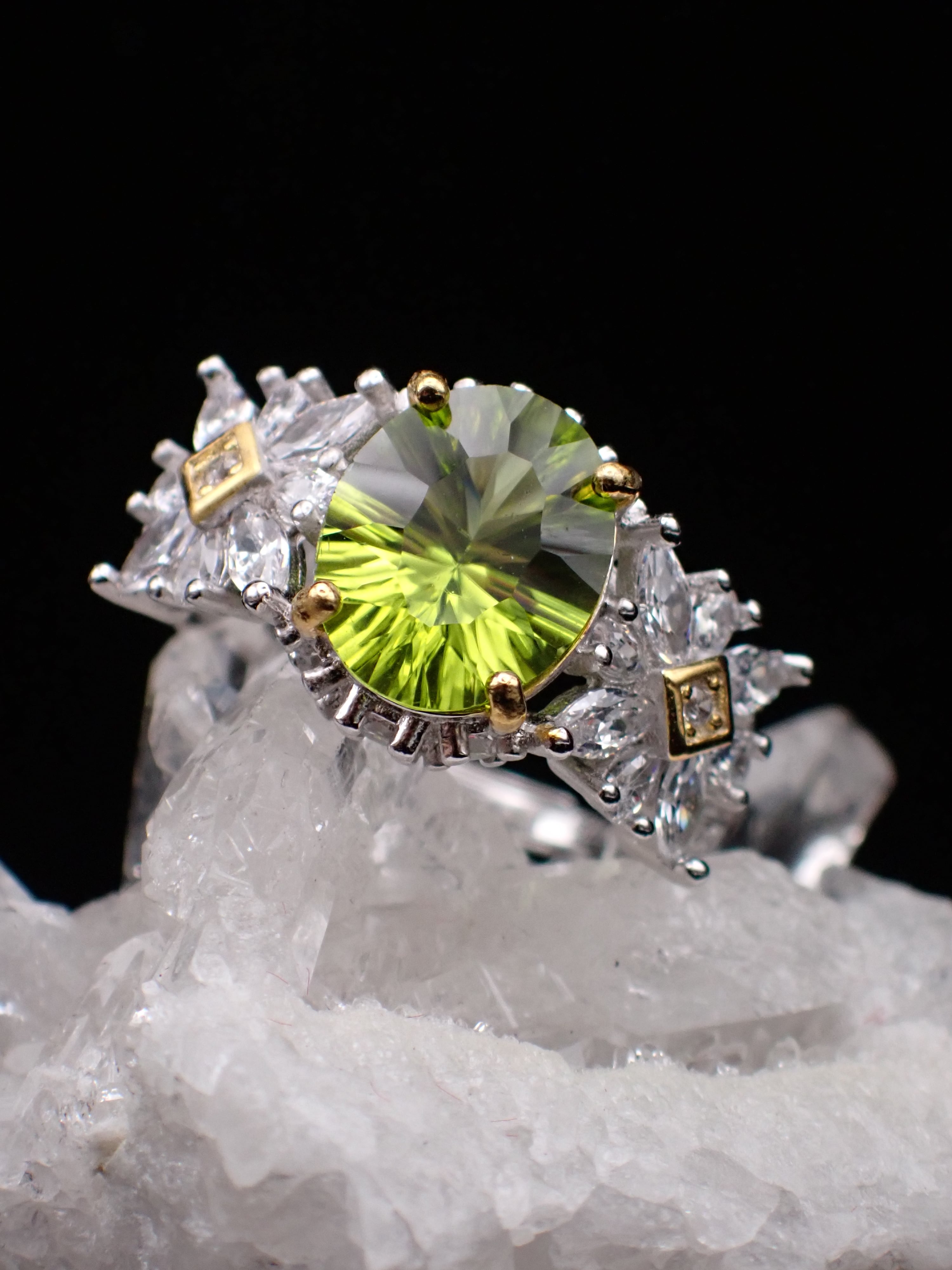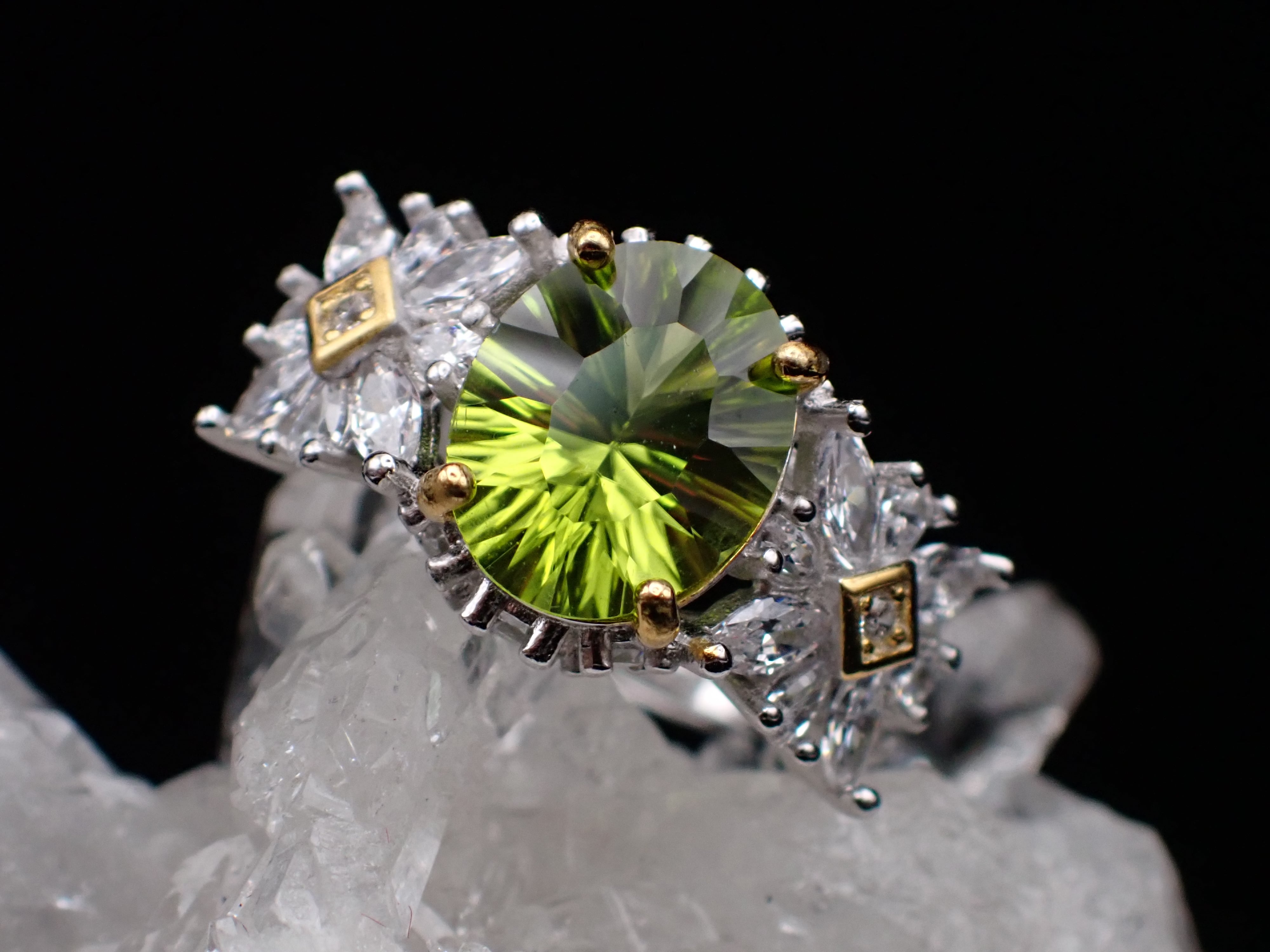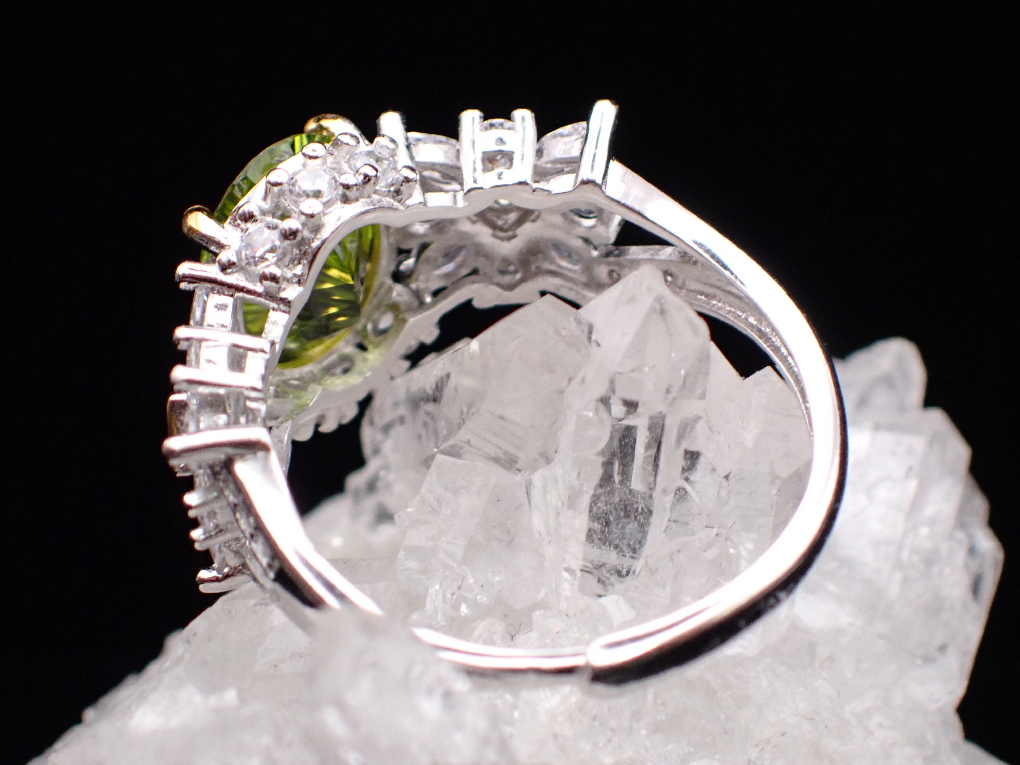 コンケーブカットが美しいペリドットを包み込んだリングです。
