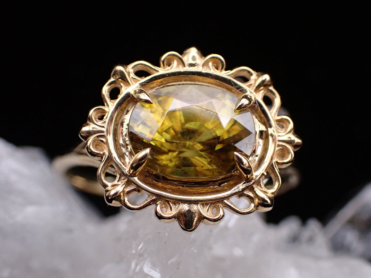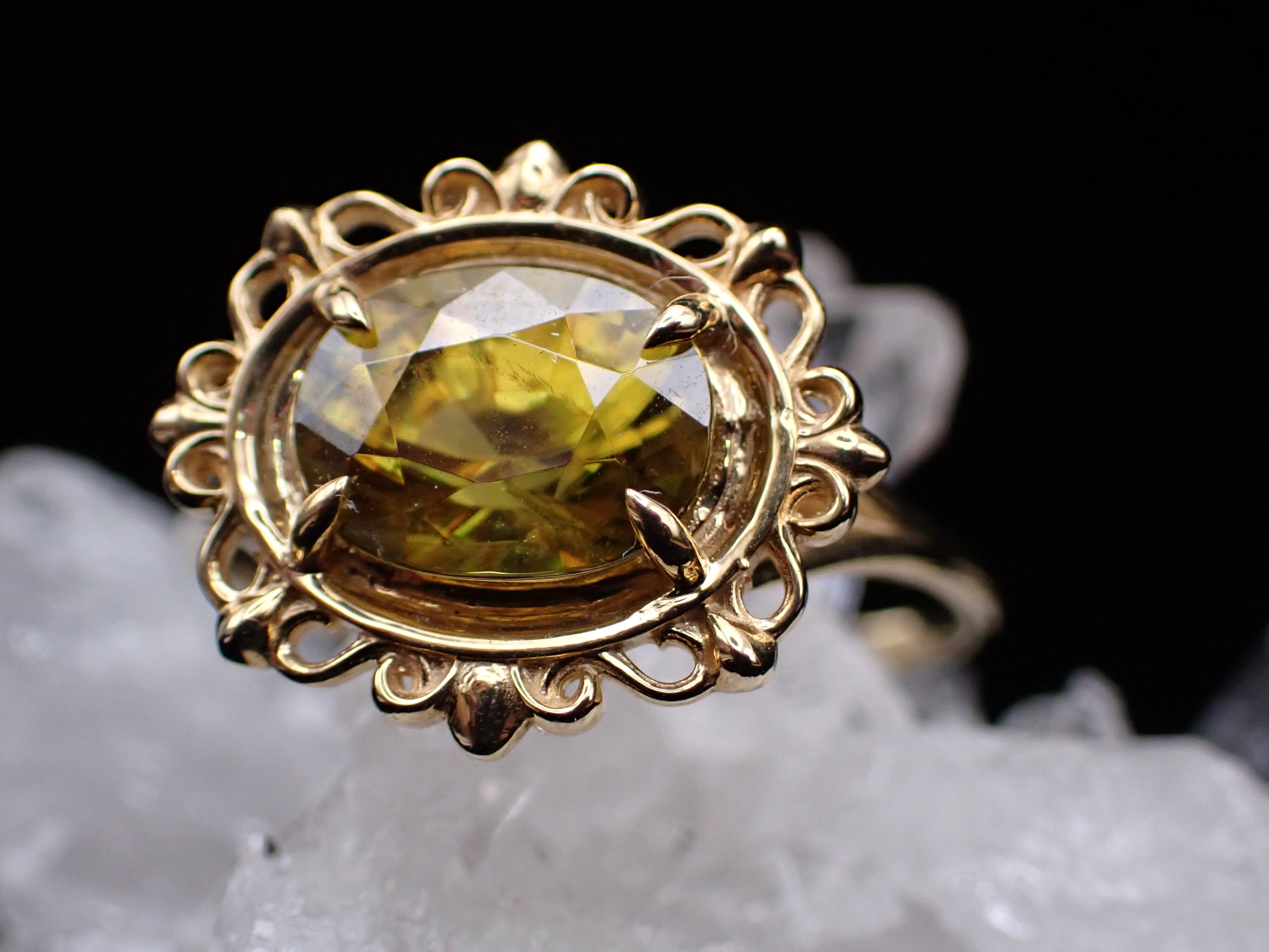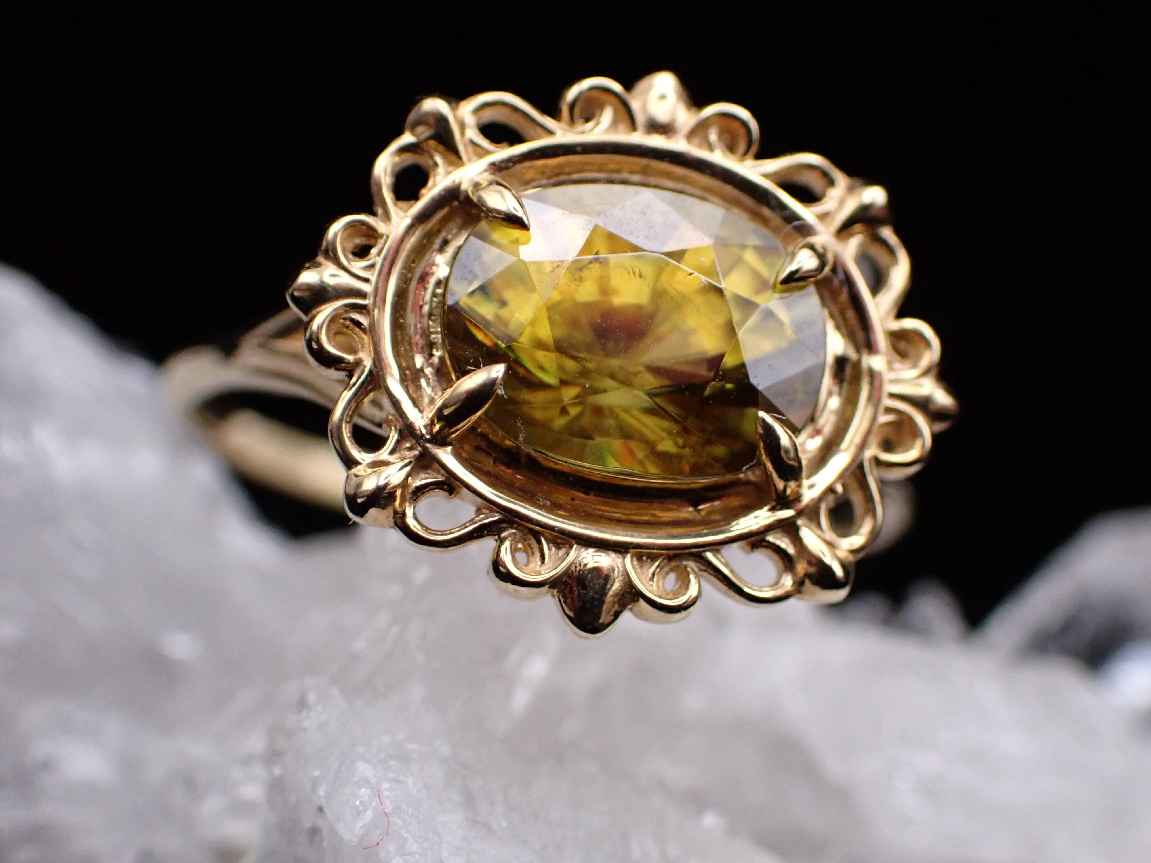 まるで石を絵画のように、美しい額縁の中へ鮮やかなファイアの輝くスフェーンを納めました。