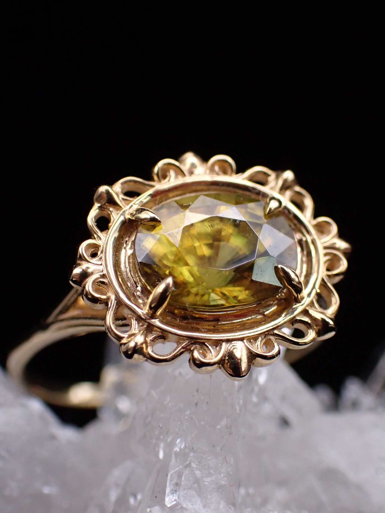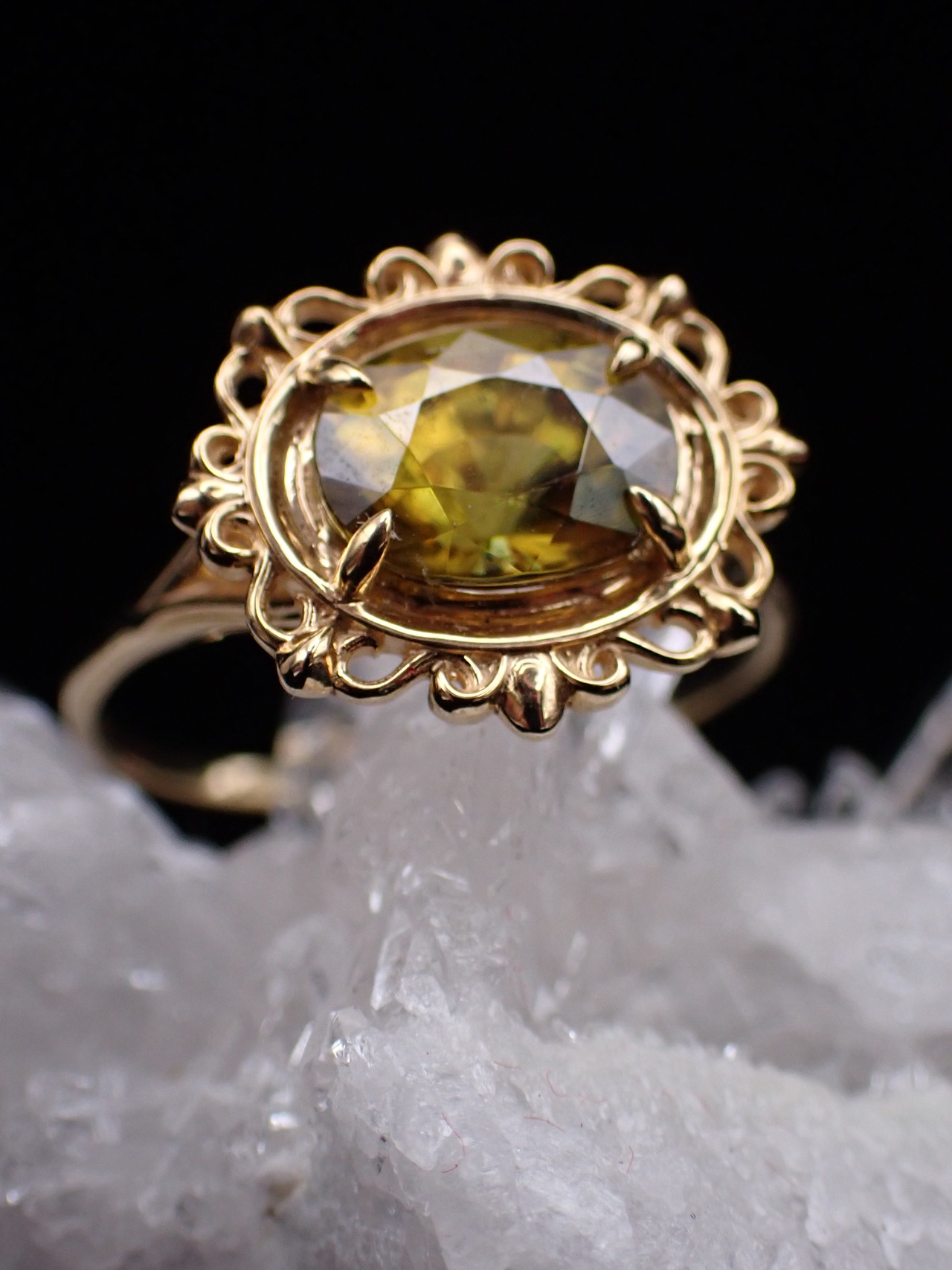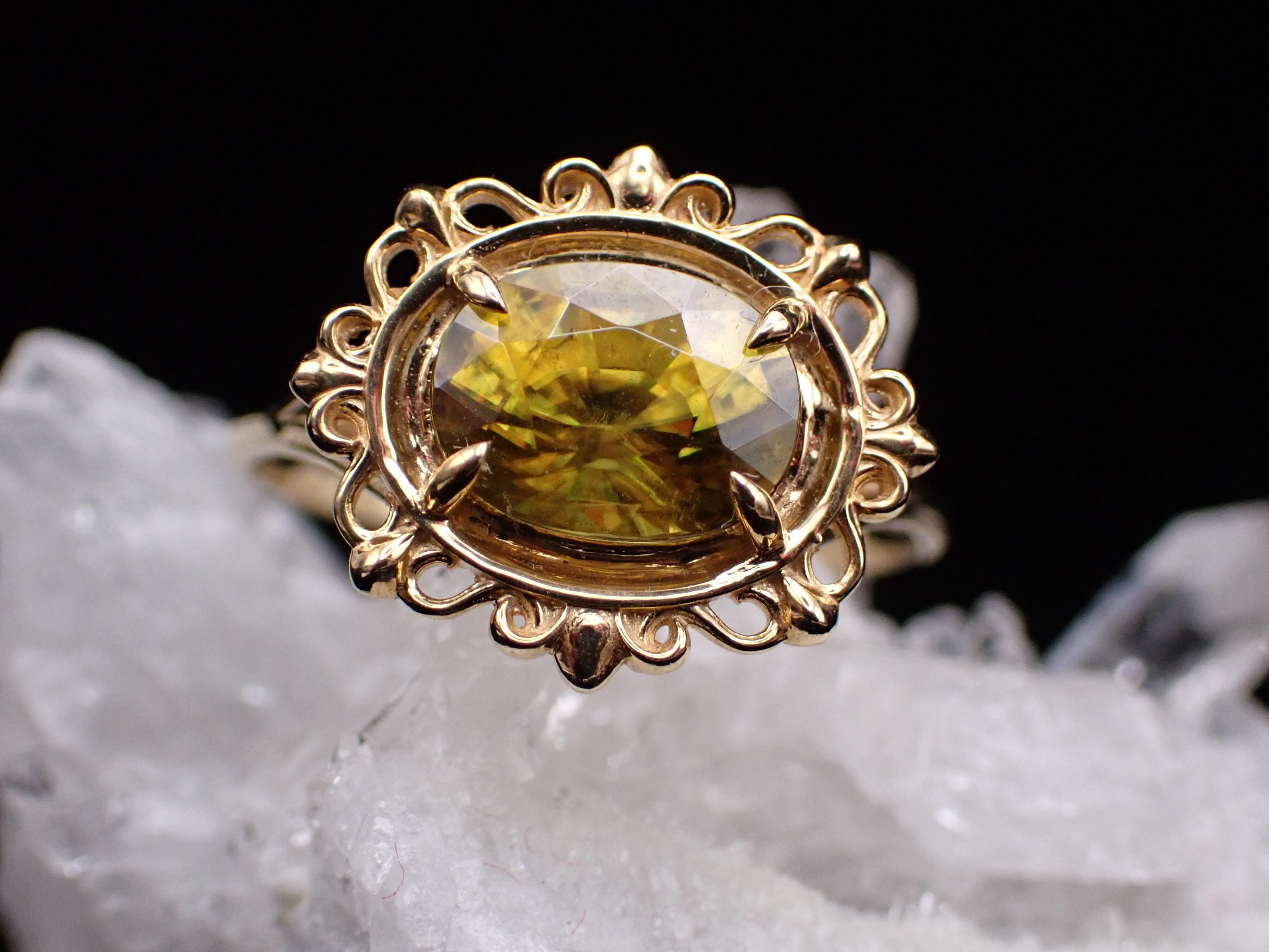 まるで石を絵画のように、美しい額縁の中へ鮮やかなファイアの輝くスフェーンを納めました。
