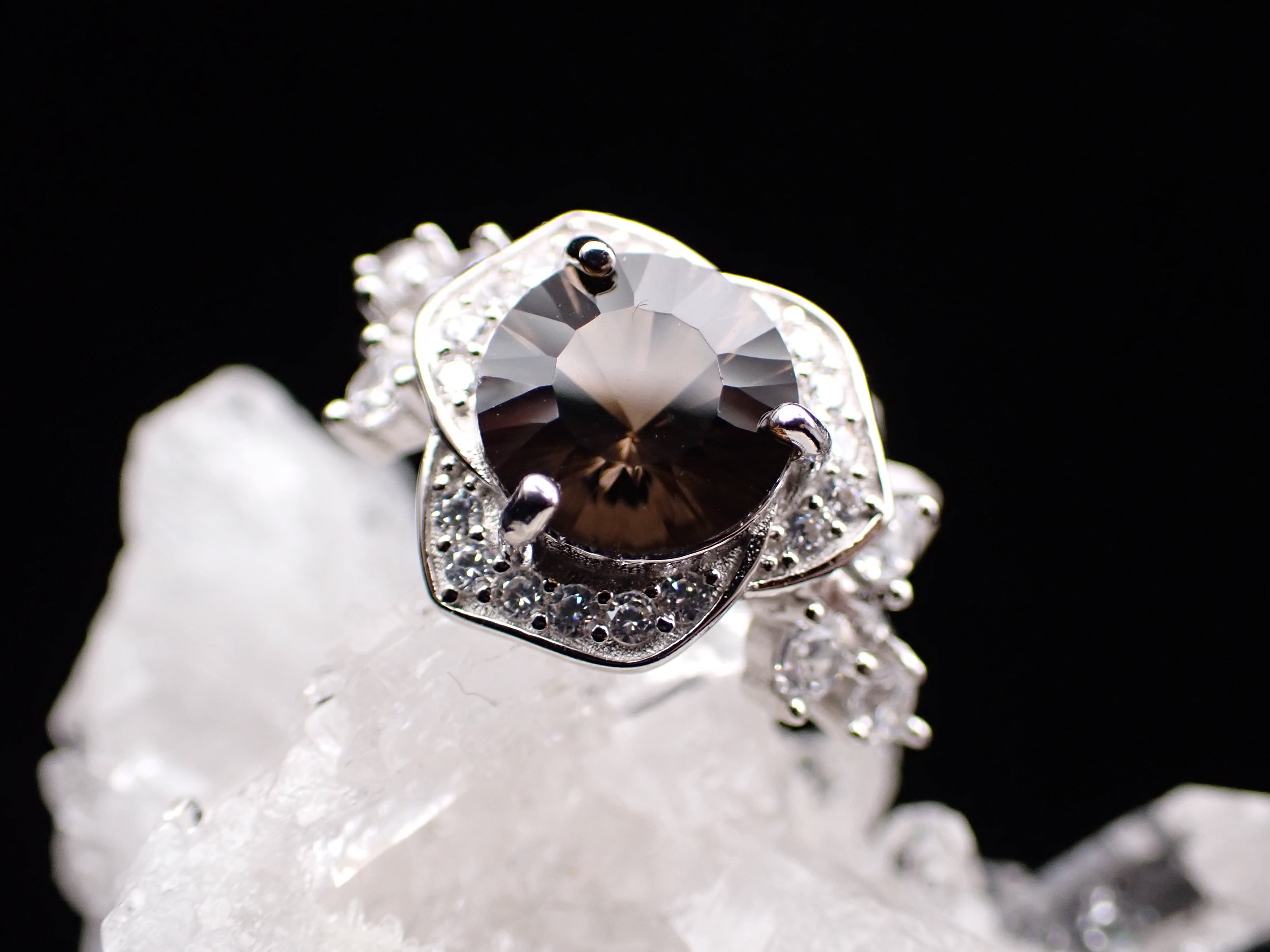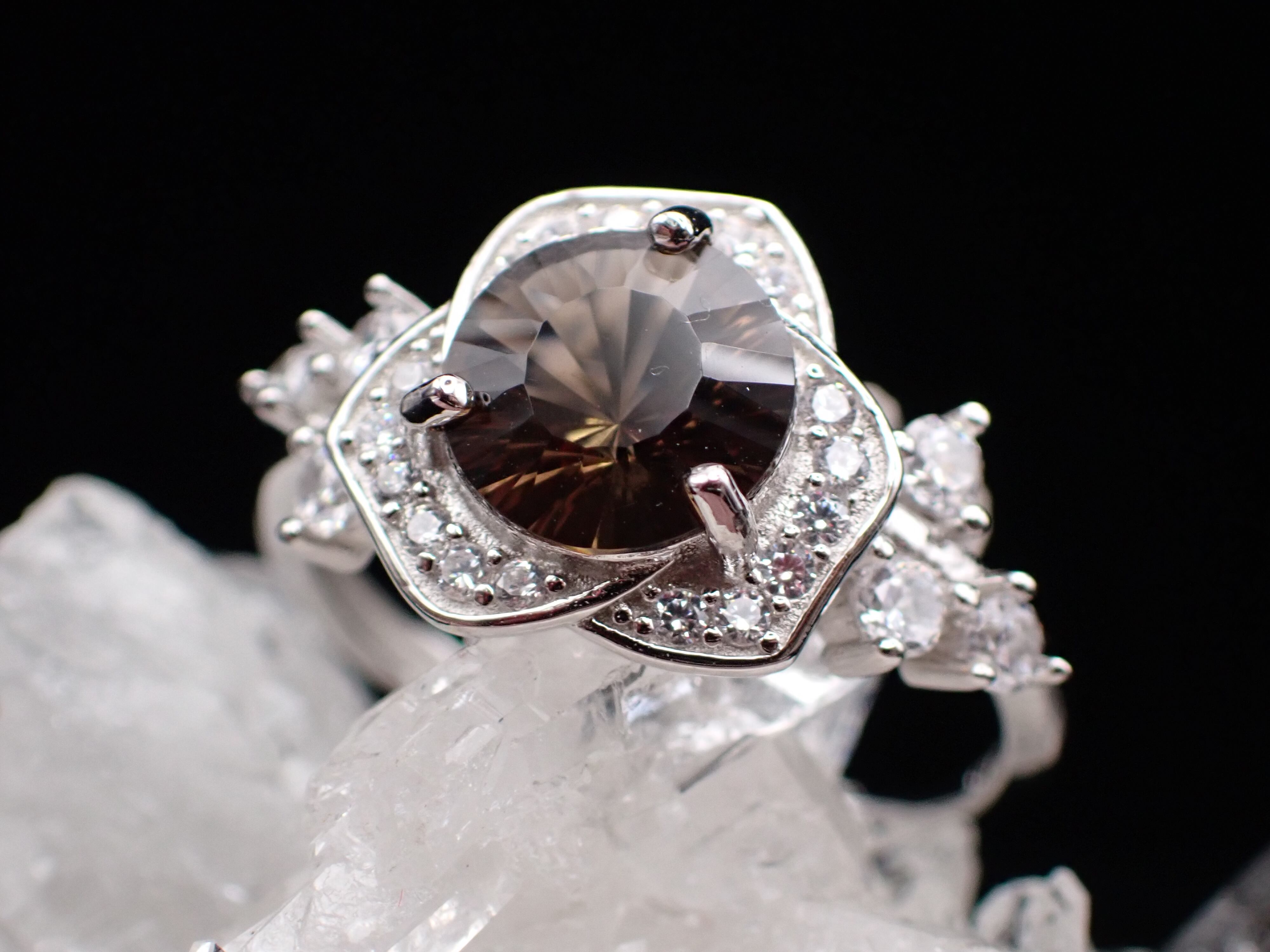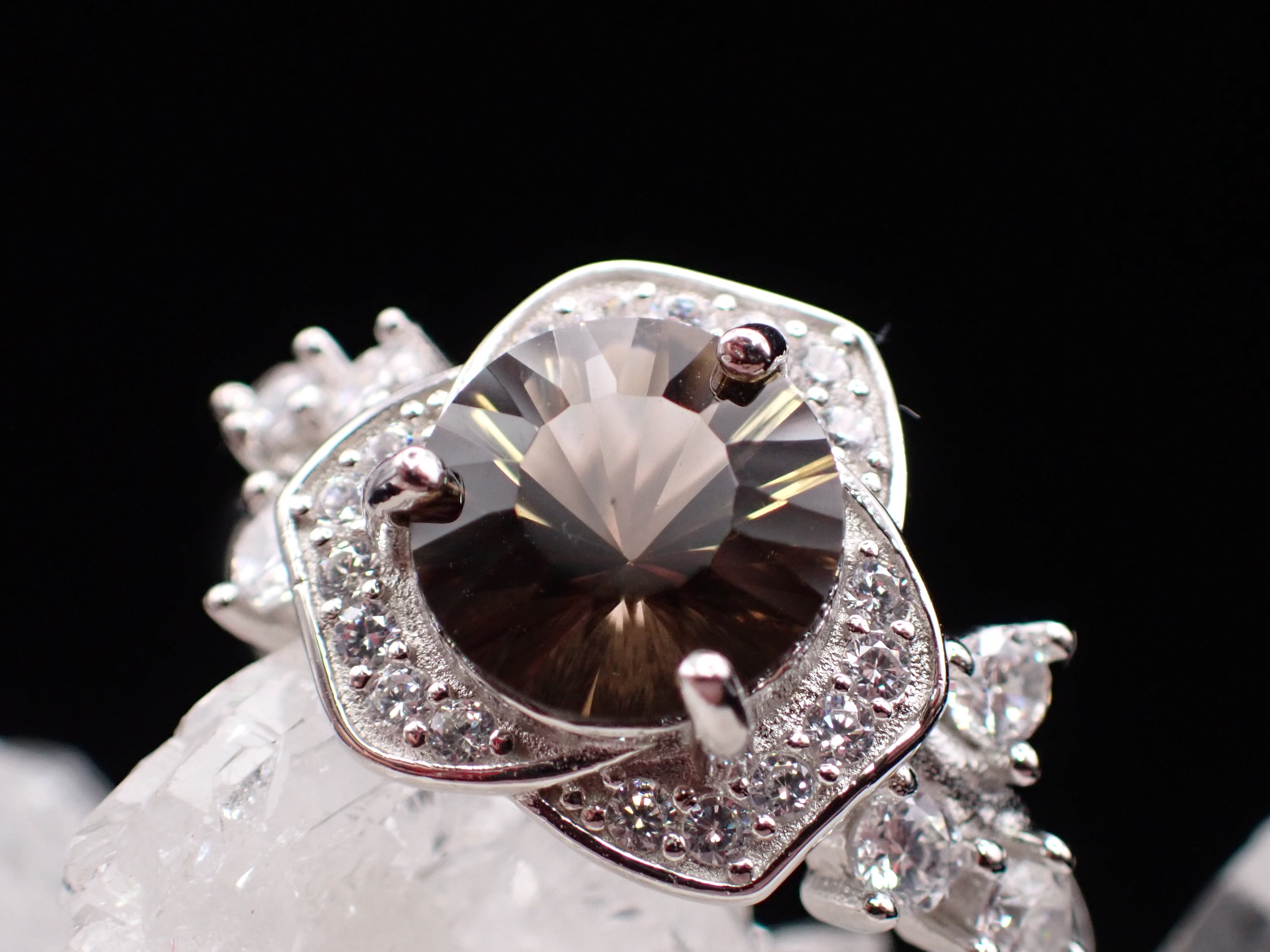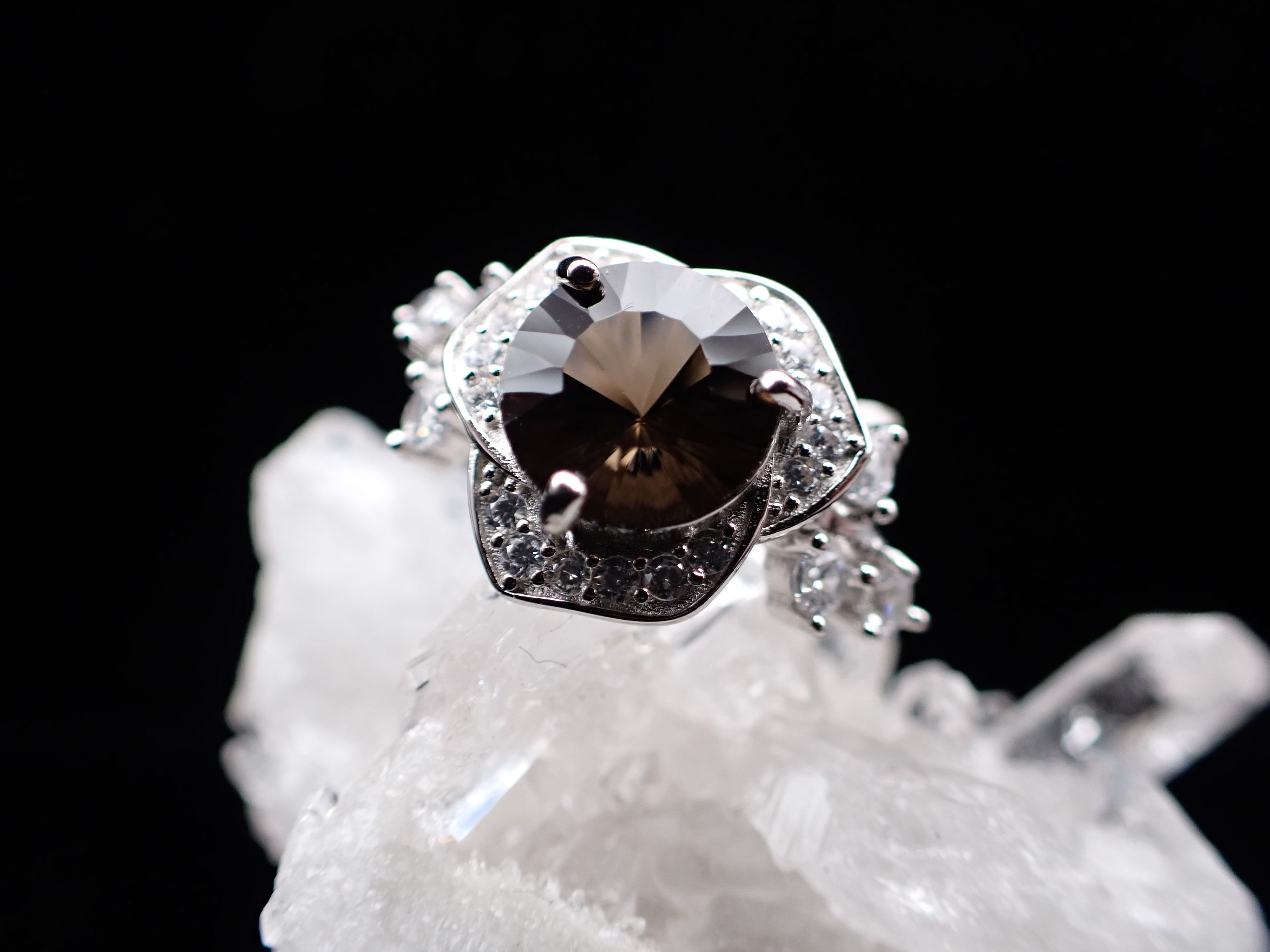 美しいジルコニアの中に8mmの大きなコンケーブカットのスモーキークォーツがシックに輝きます。
