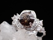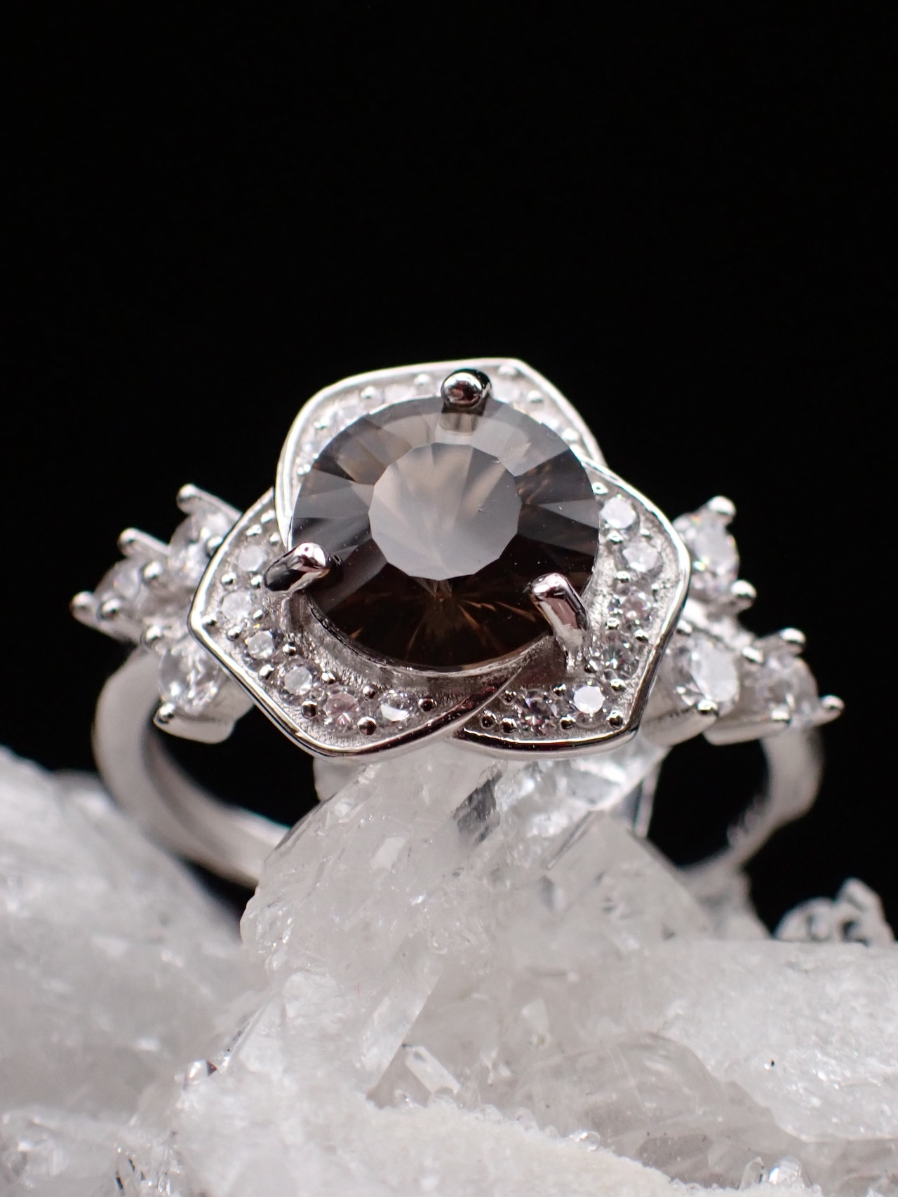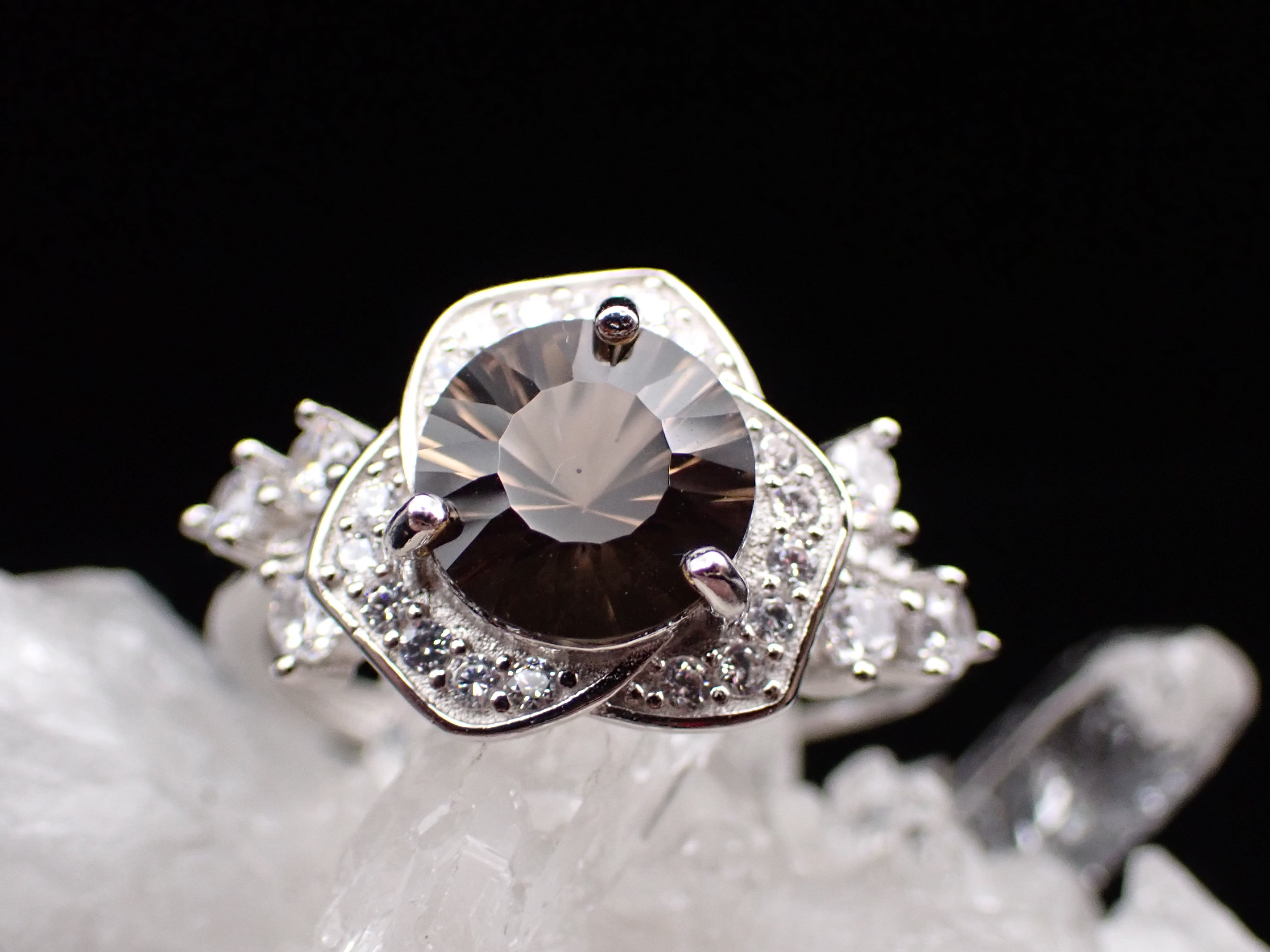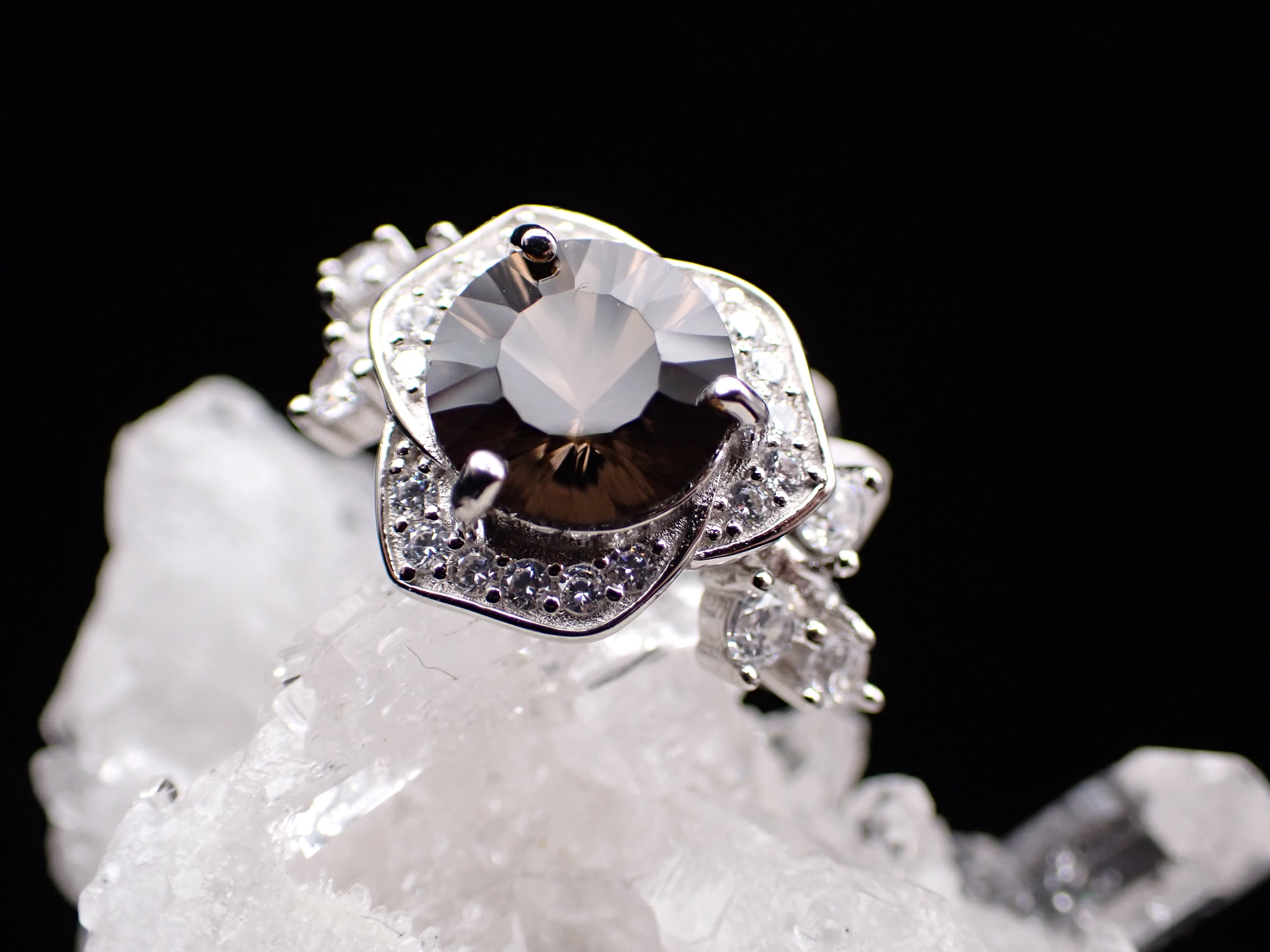 美しいジルコニアの中に8mmの大きなコンケーブカットのスモーキークォーツがシックに輝きます。