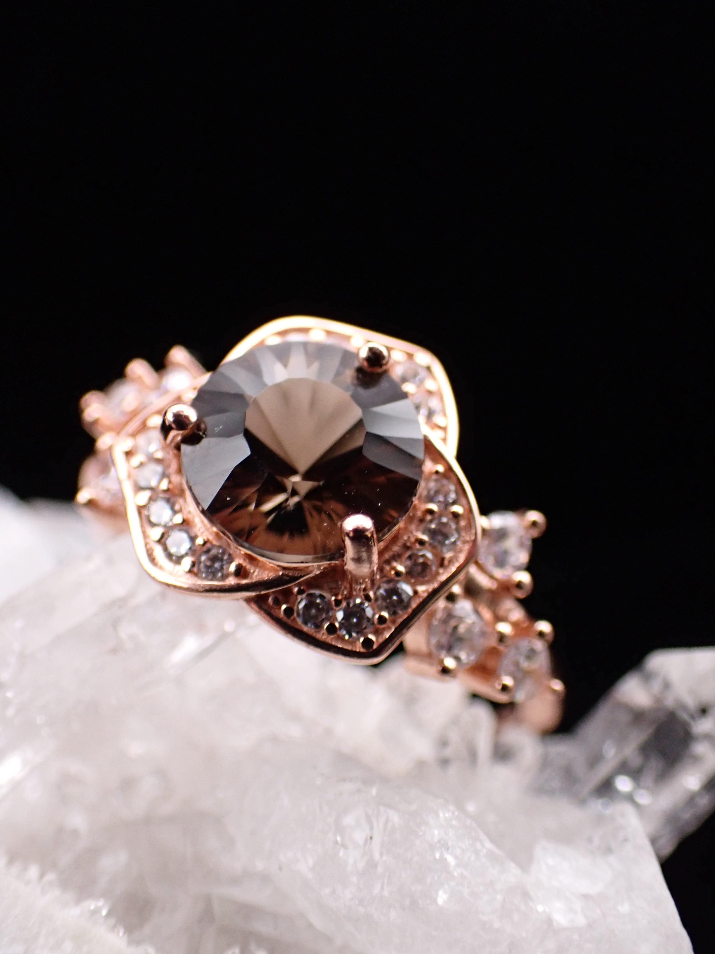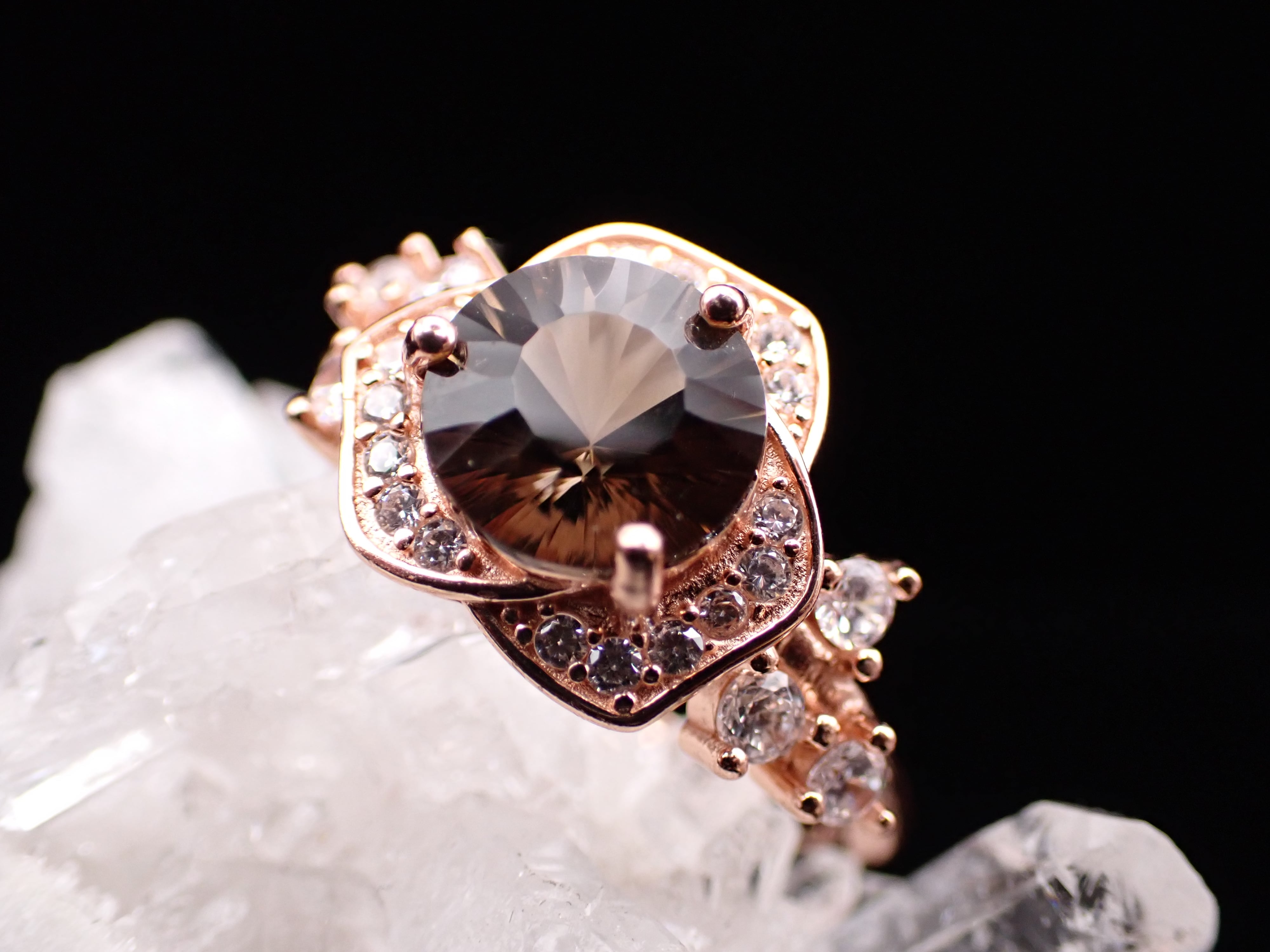美しいジルコニアの中に8mmの大きなコンケーブカットのスモーキークォーツがシックに輝きます。