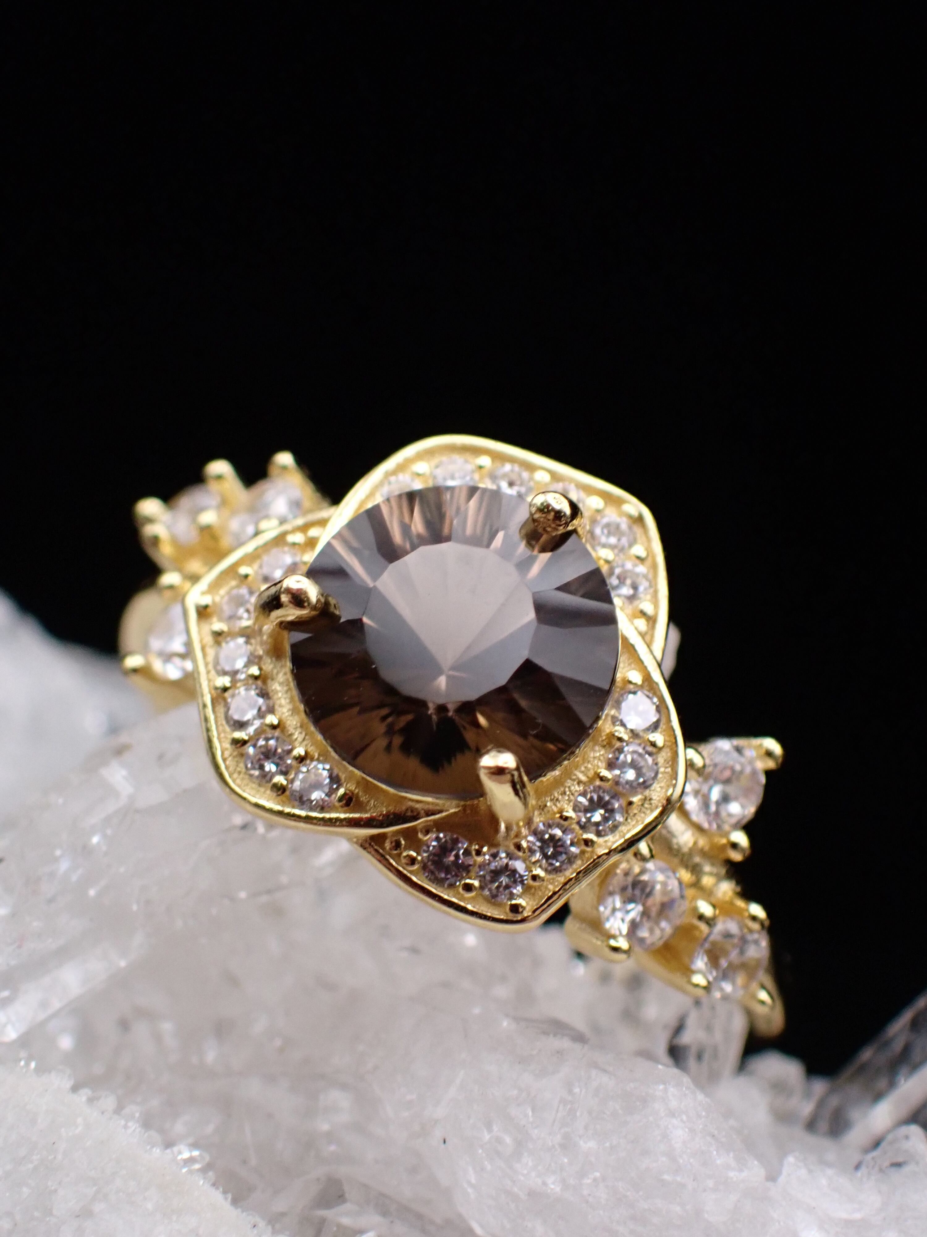 美しいジルコニアの中に8mmの大きなコンケーブカットのスモーキークォーツがシックに輝きます。