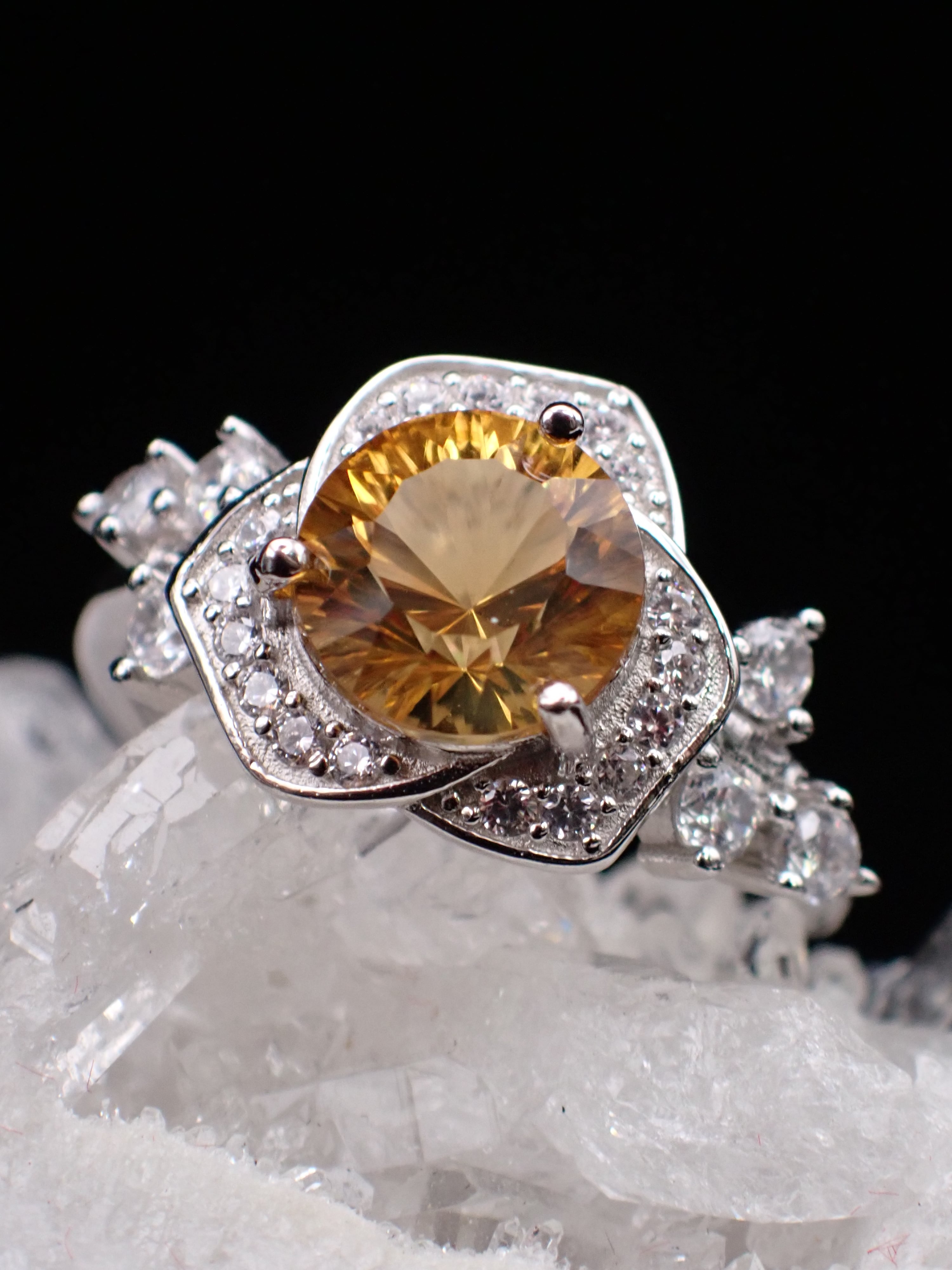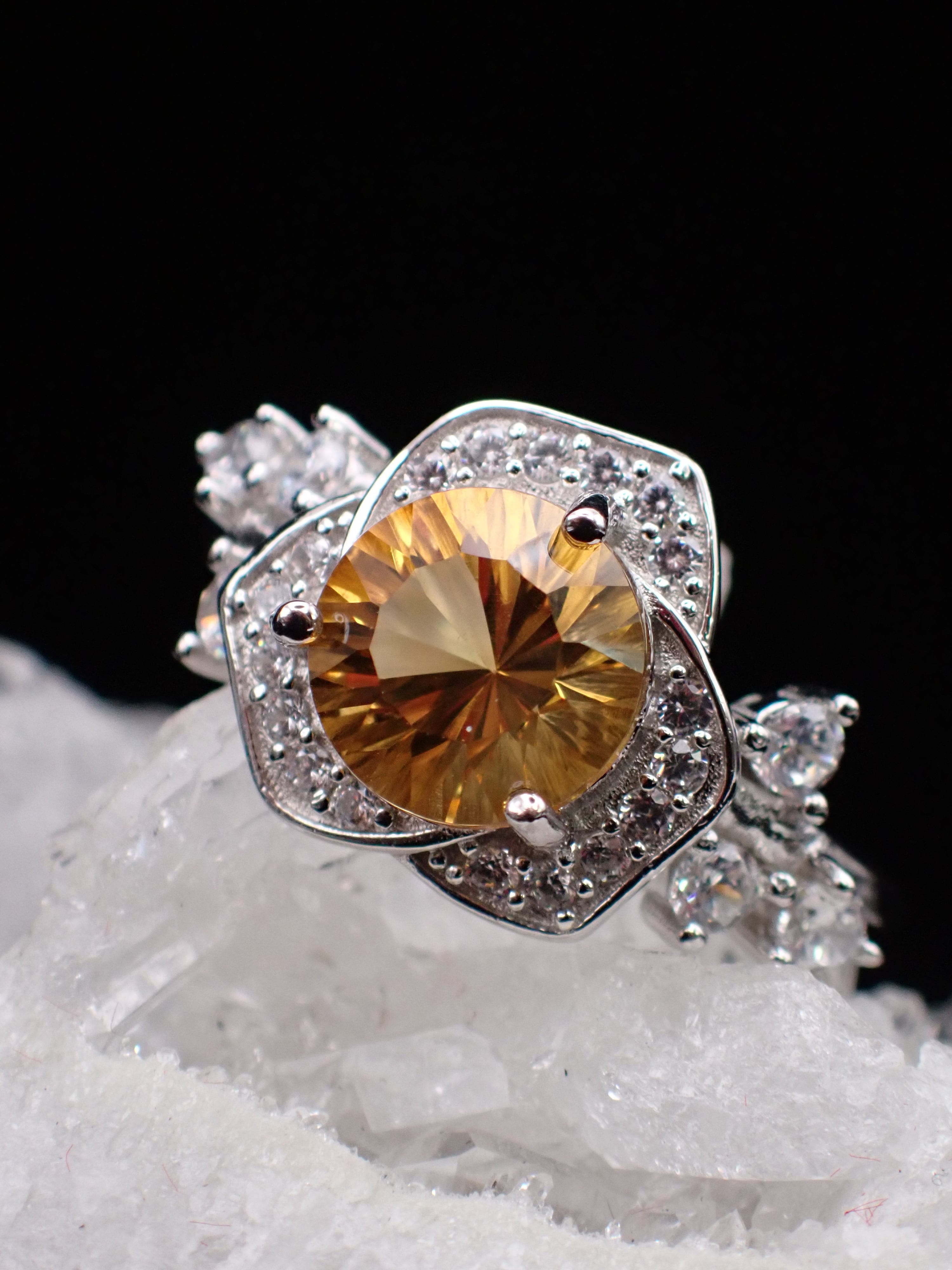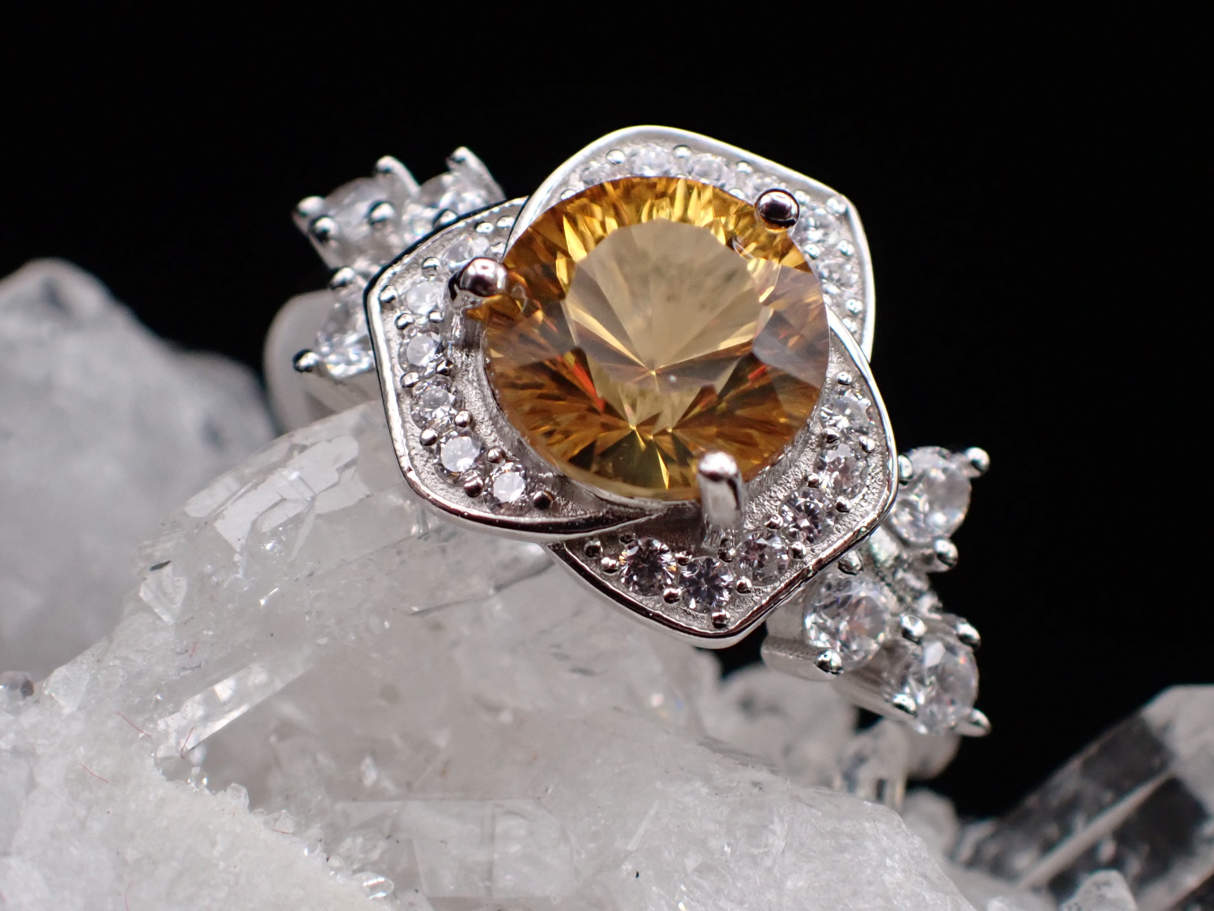 美しいジルコニアの中に8mmの大きなコンケーブカットのシトリンが鮮やかに輝きます。