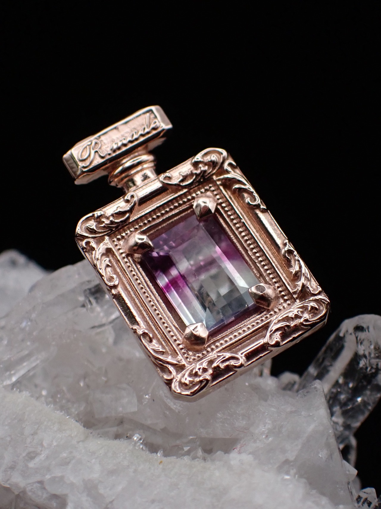 アール・ヌーヴォーシリーズの中でも人気の額縁デザインを元に、芳しい香りが広がるような香水瓶の中へ石を納めました。