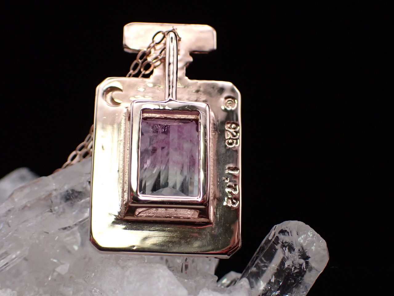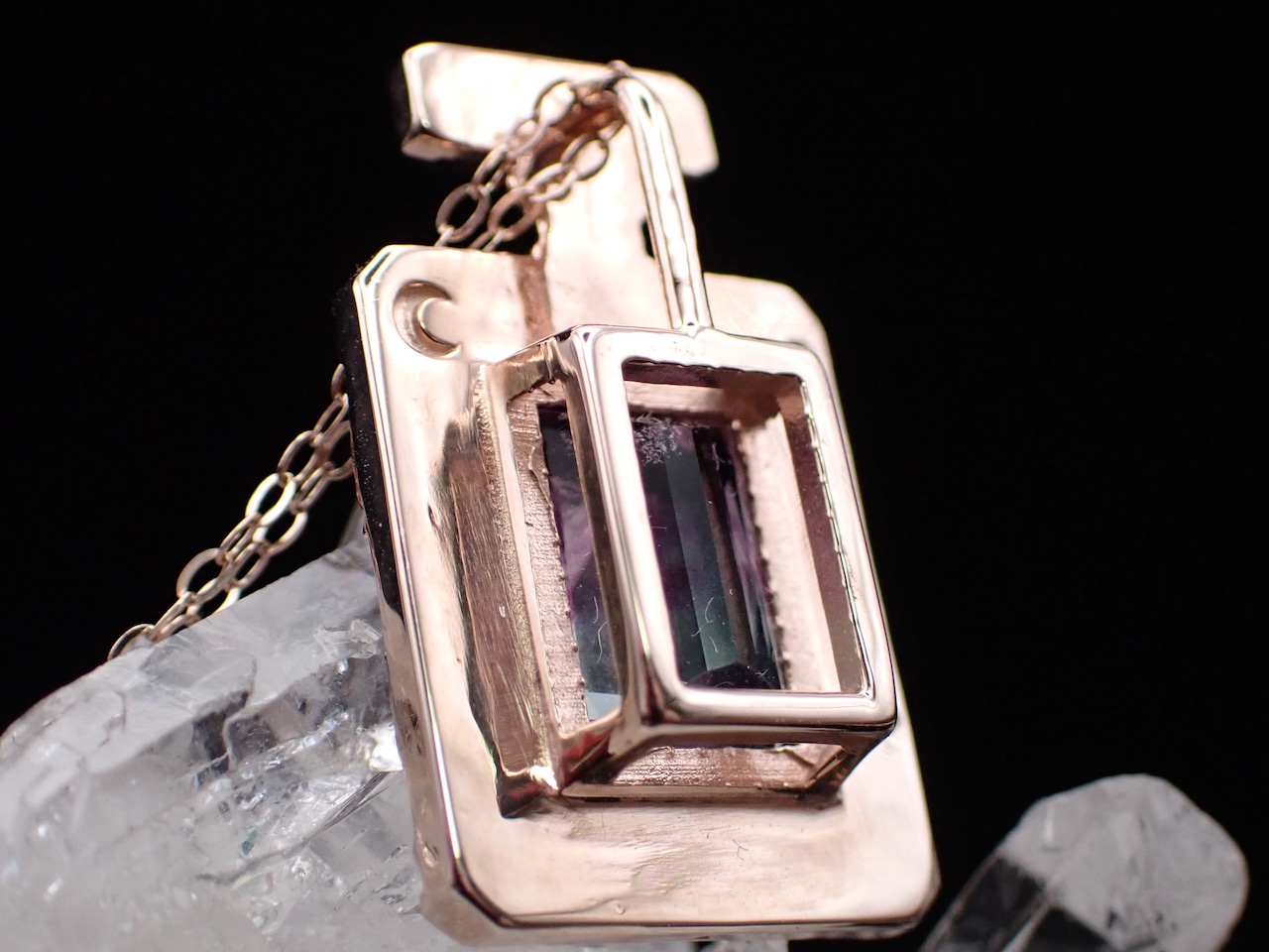 額縁の裏側はフラットにし、石が存分に光を蓄えながらも軽く使いやすいペンダントとなっています。