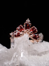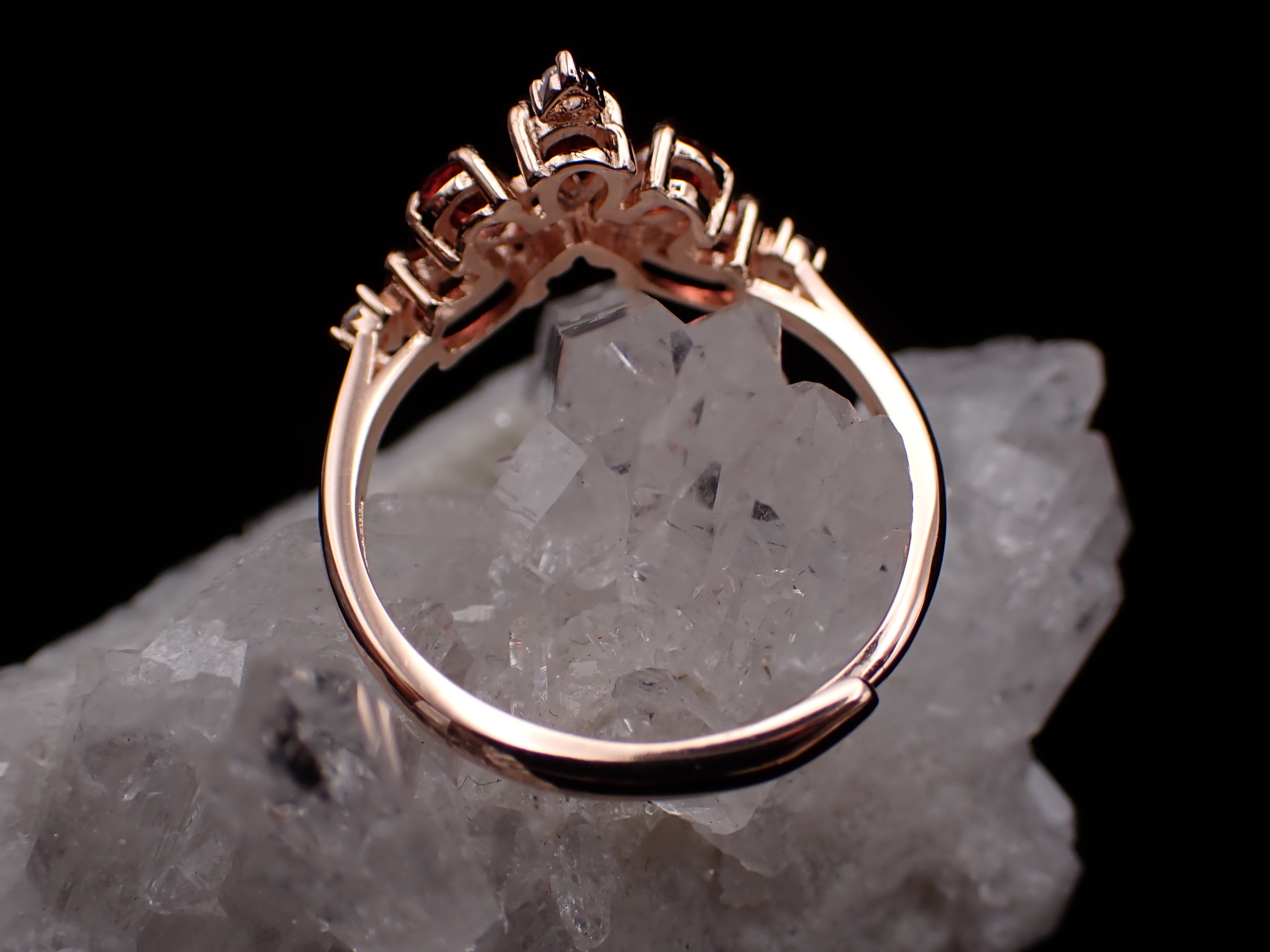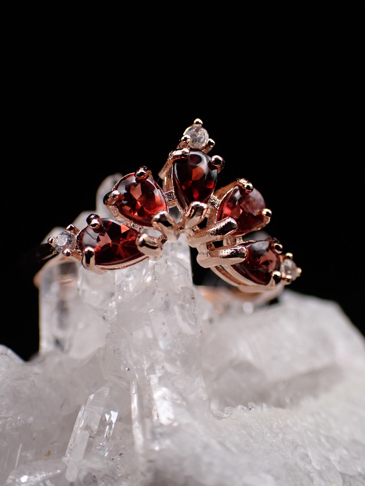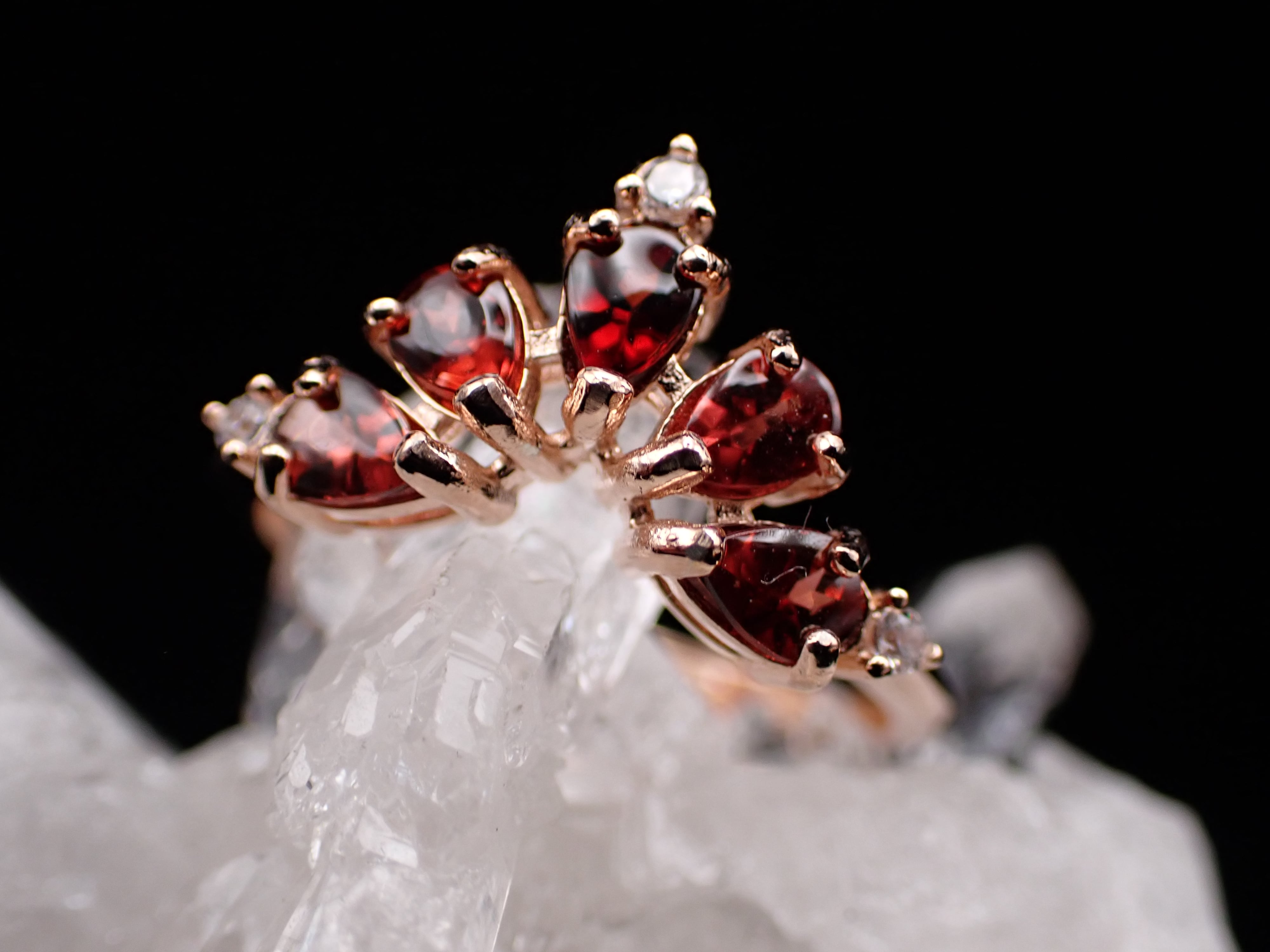 バフトップカットのドロップガーネットたちが5つ、孔雀が羽根をひろげたように並んだリングです。