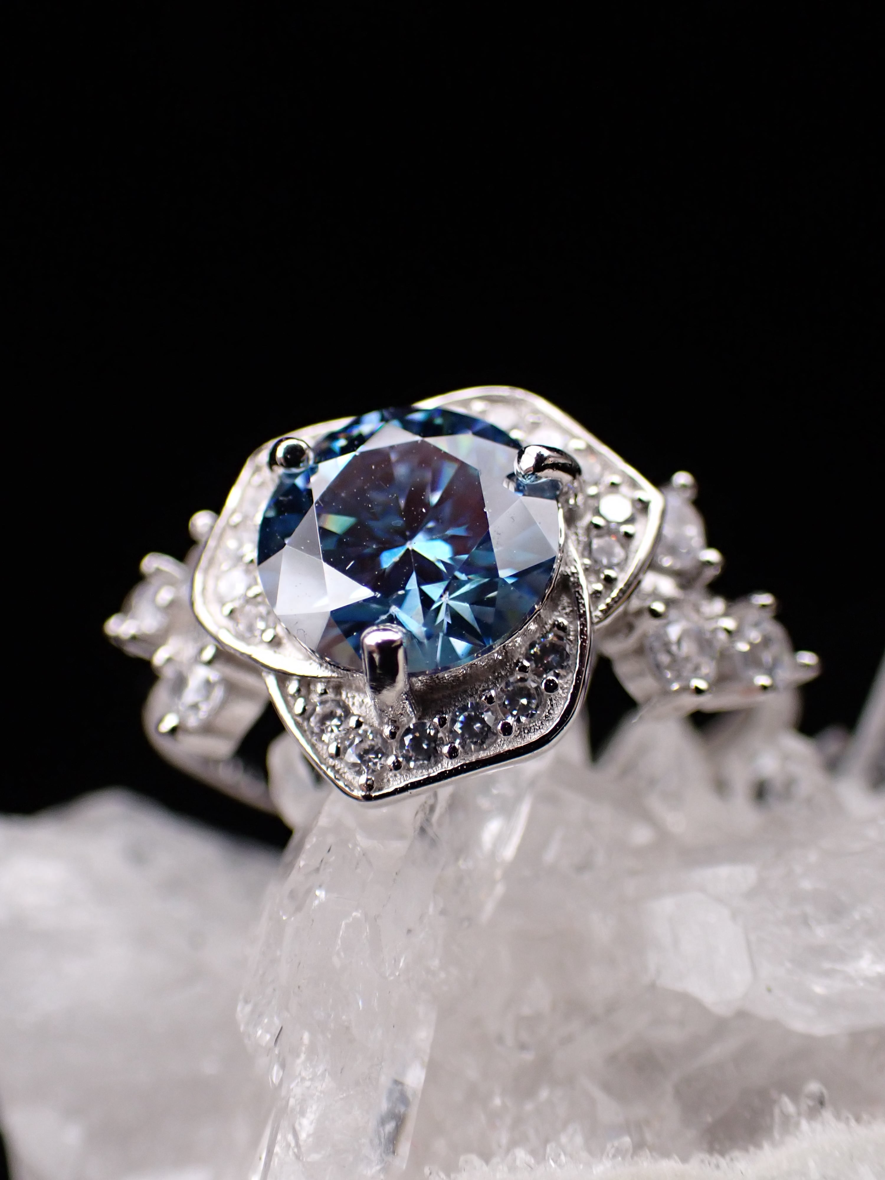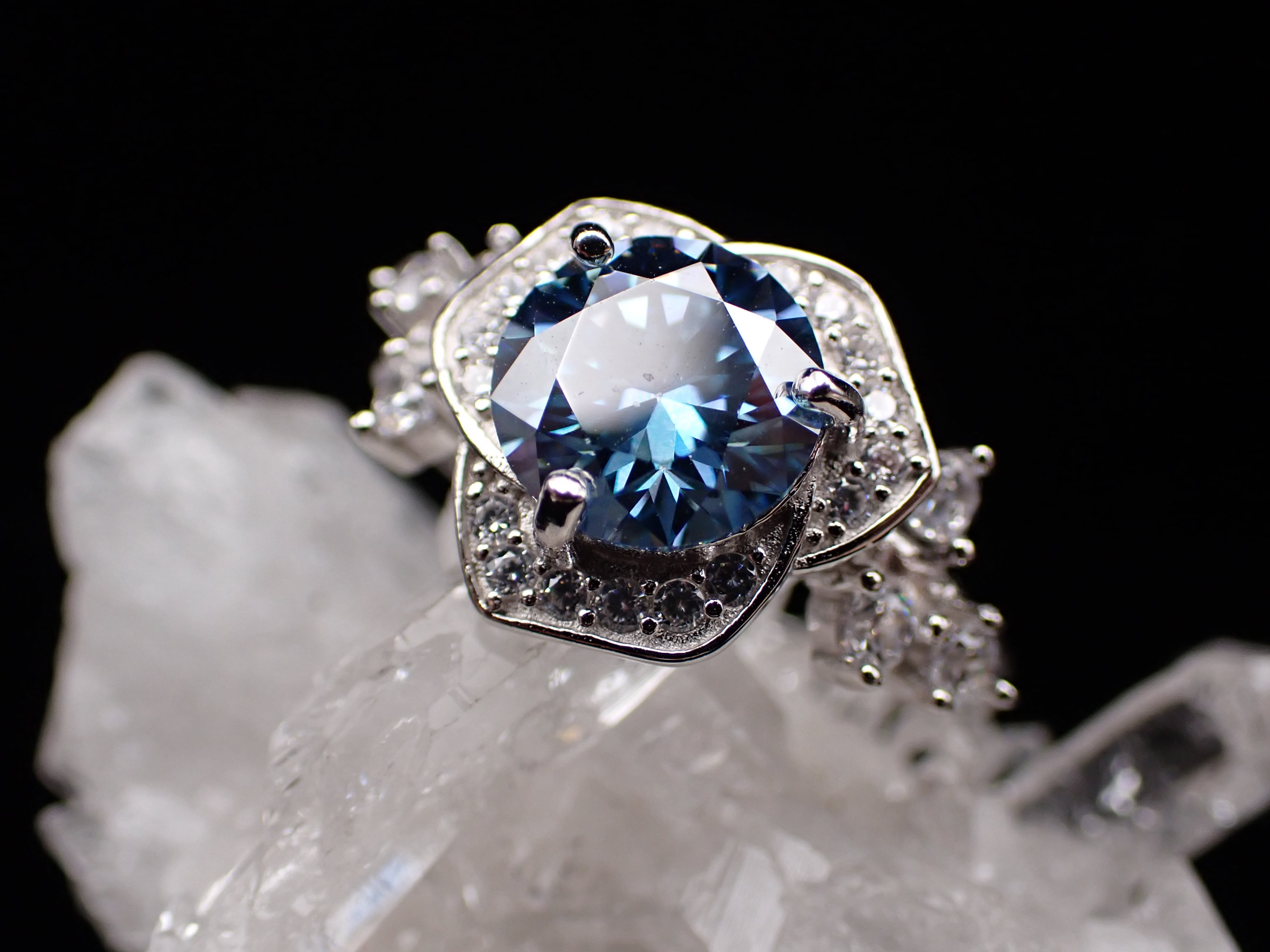 美しいジルコニアの中に8mmの大きな合成モアッサナイトが豪華に輝きます。