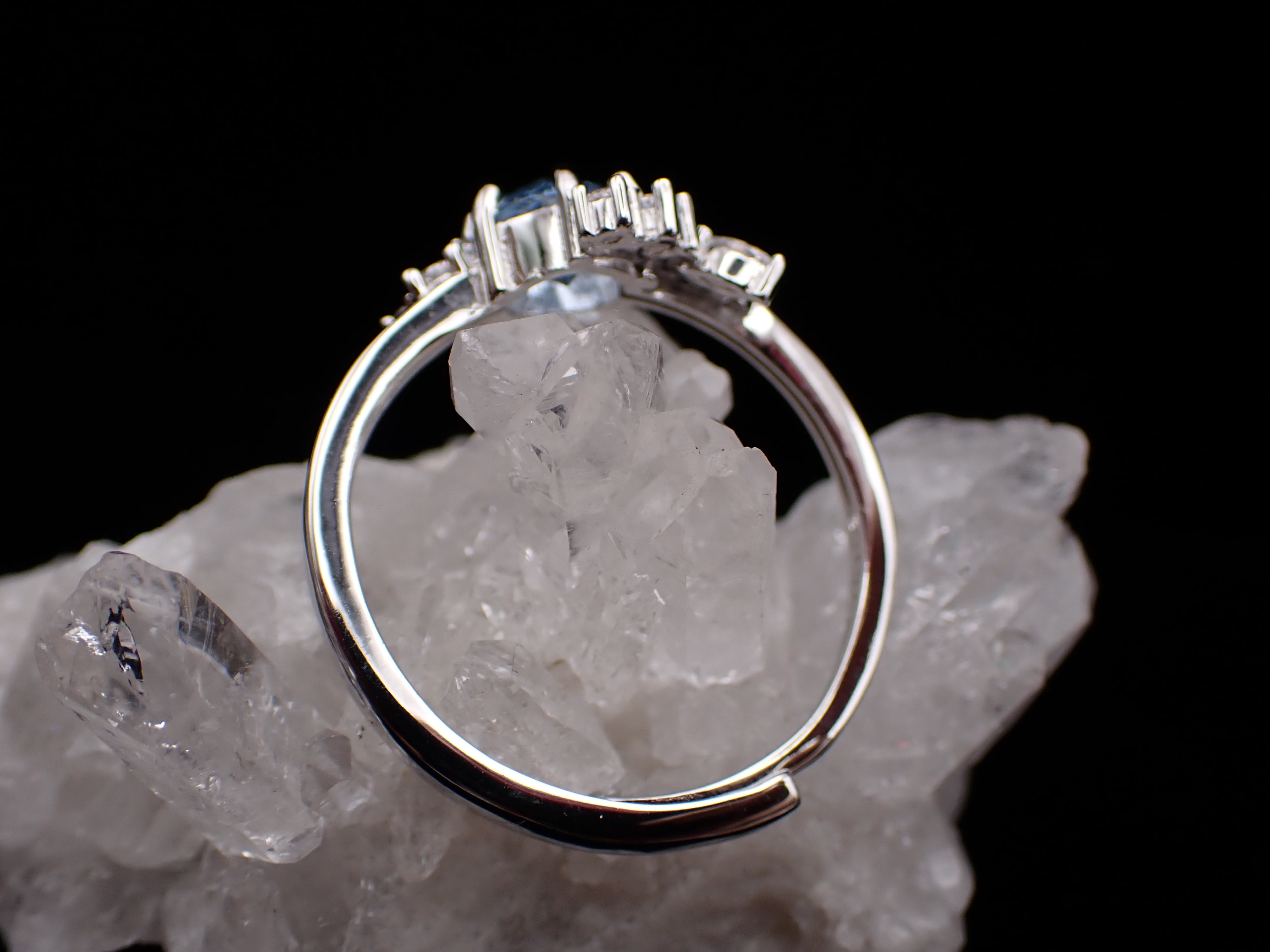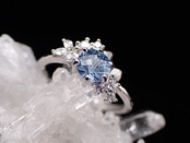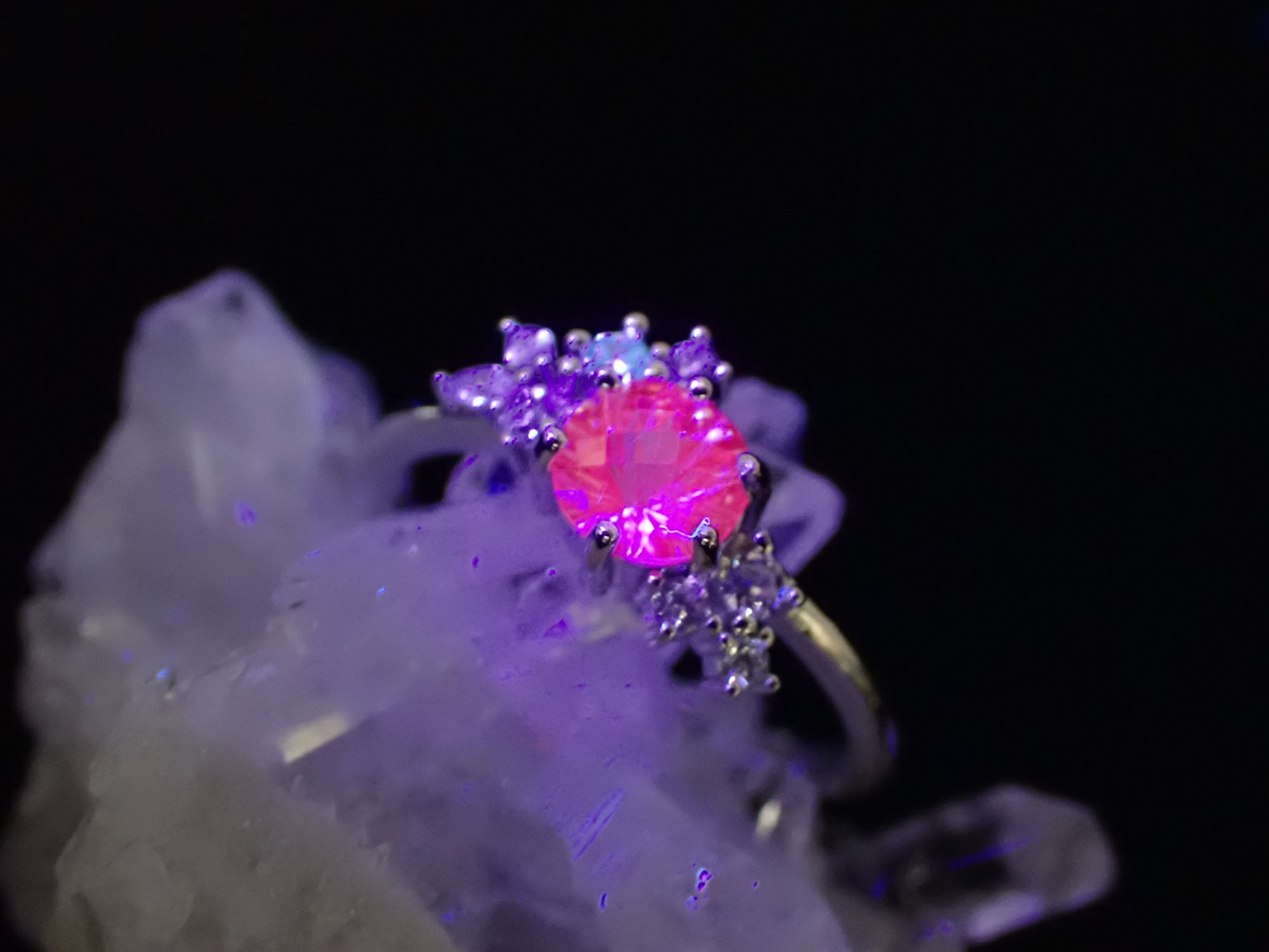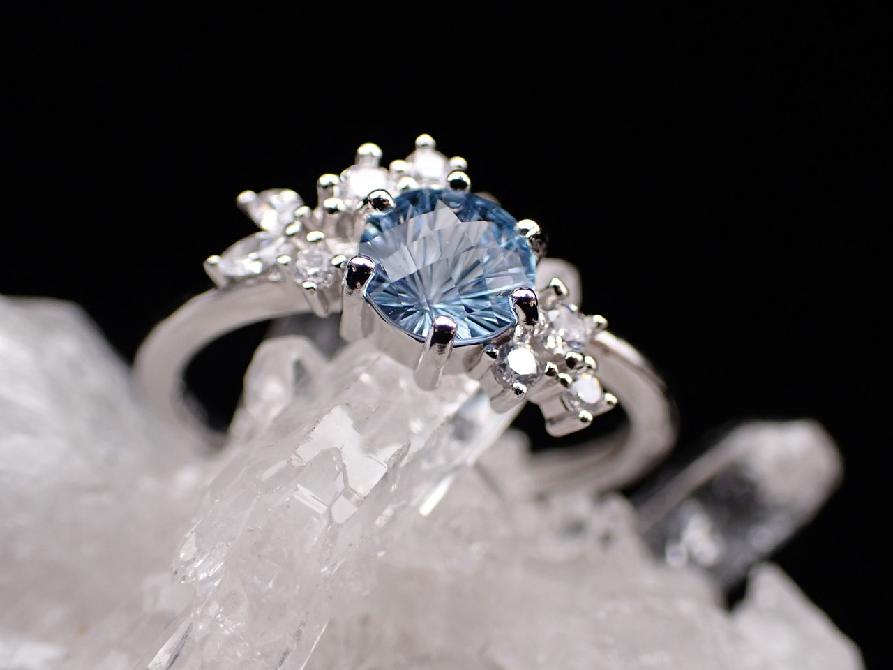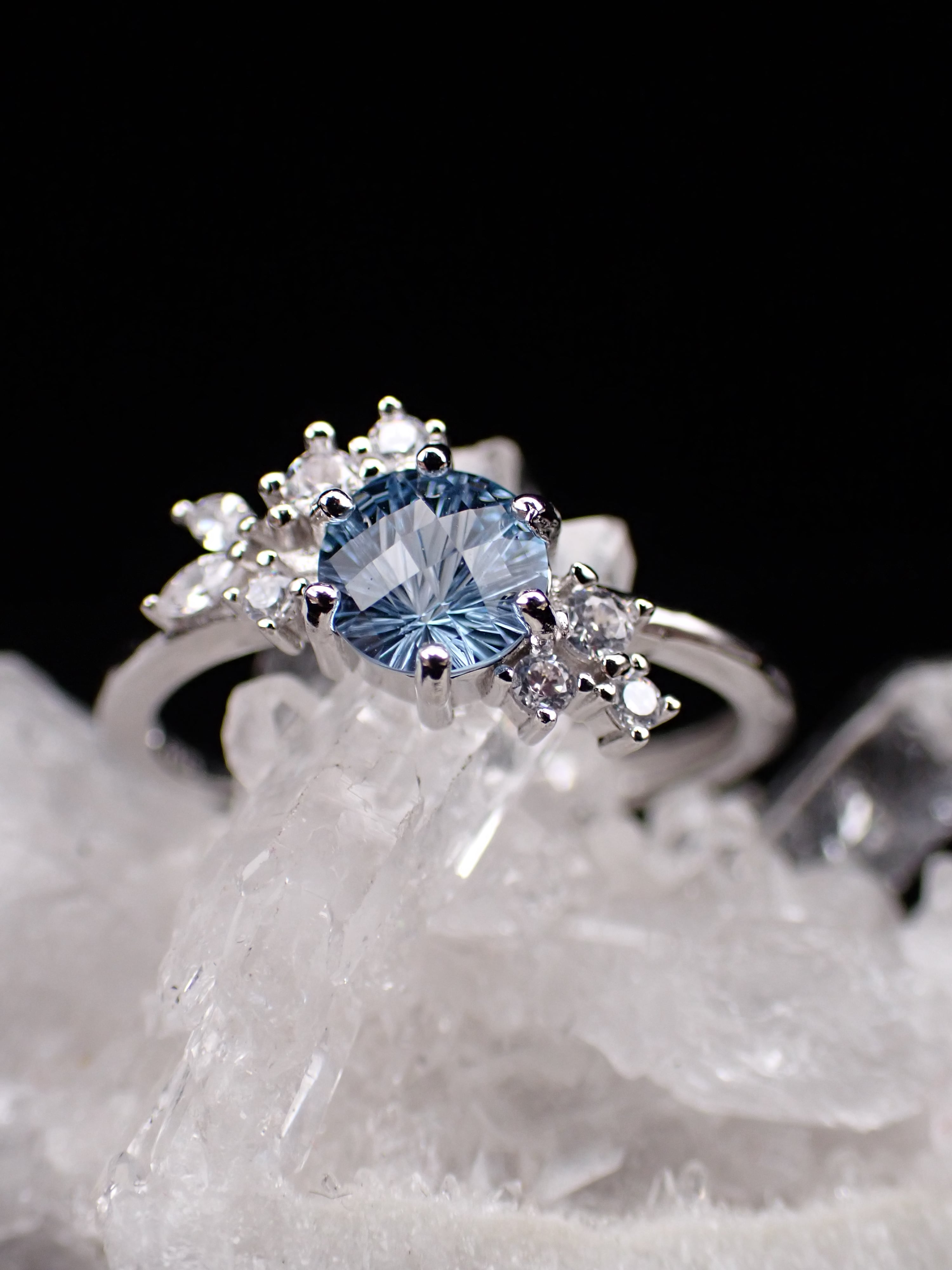 花束のように並んだ小さなジルコニアたちが、カットが美しい合成スピネルをさらに輝かせる繊細なリングです。