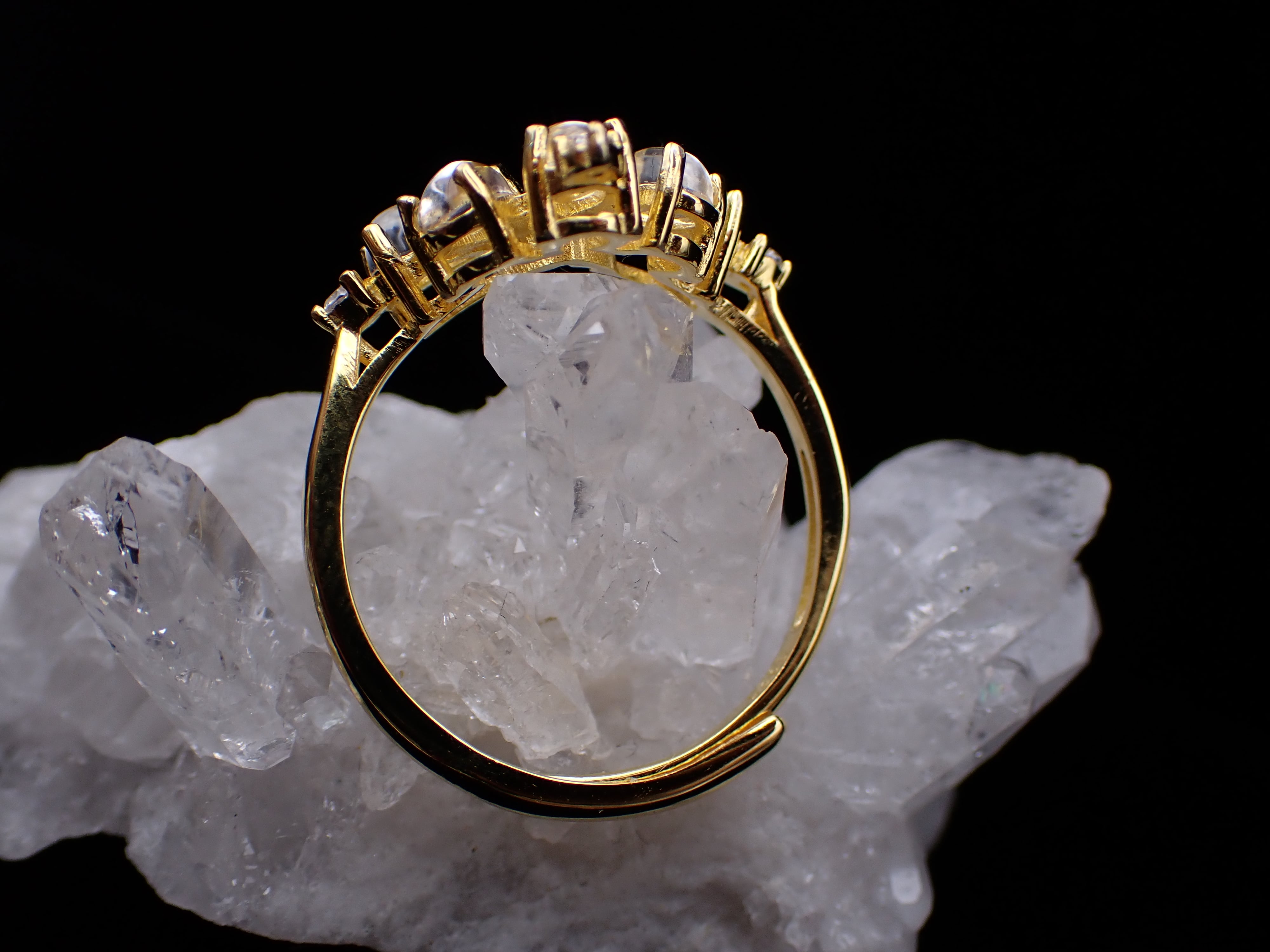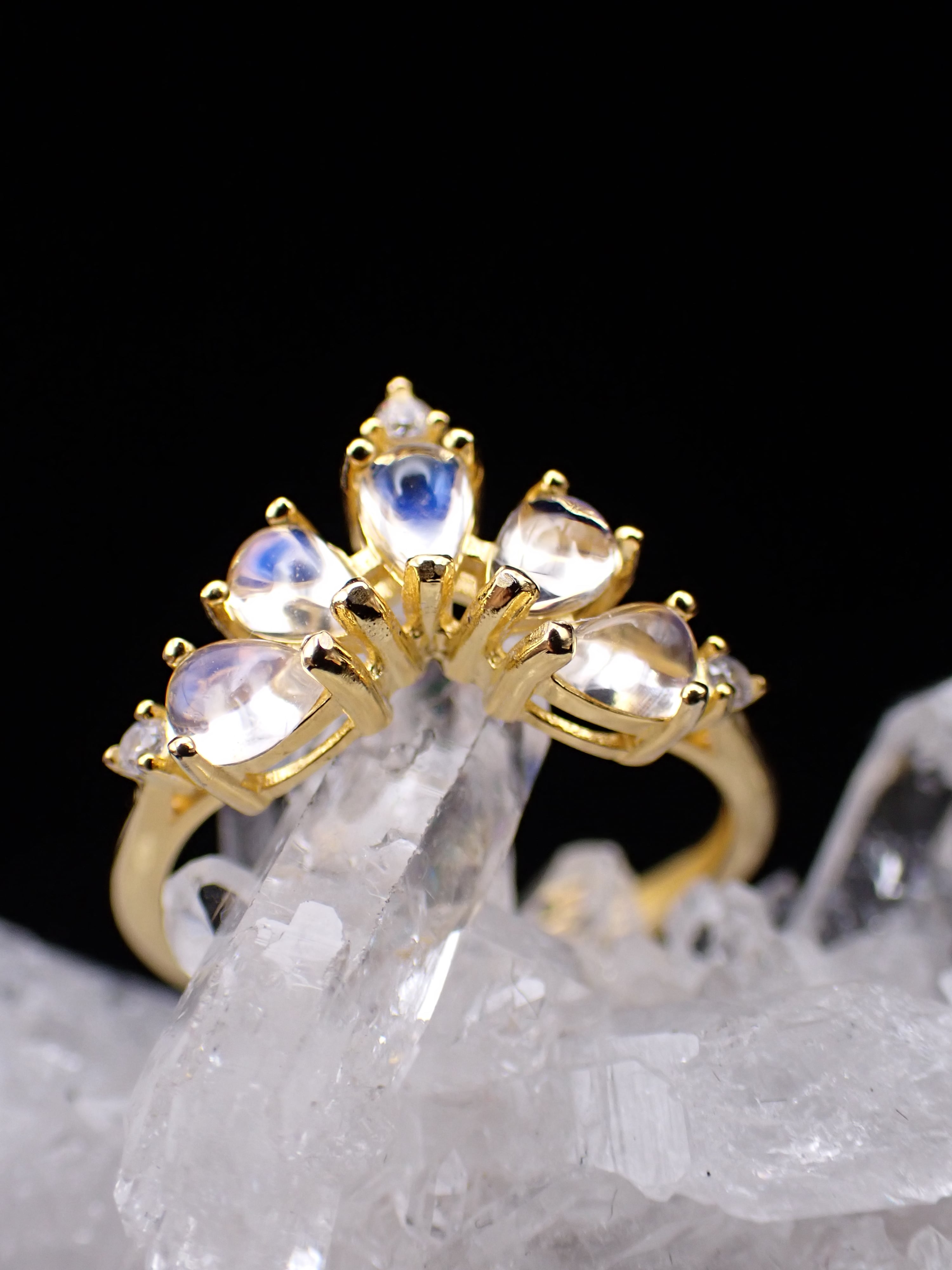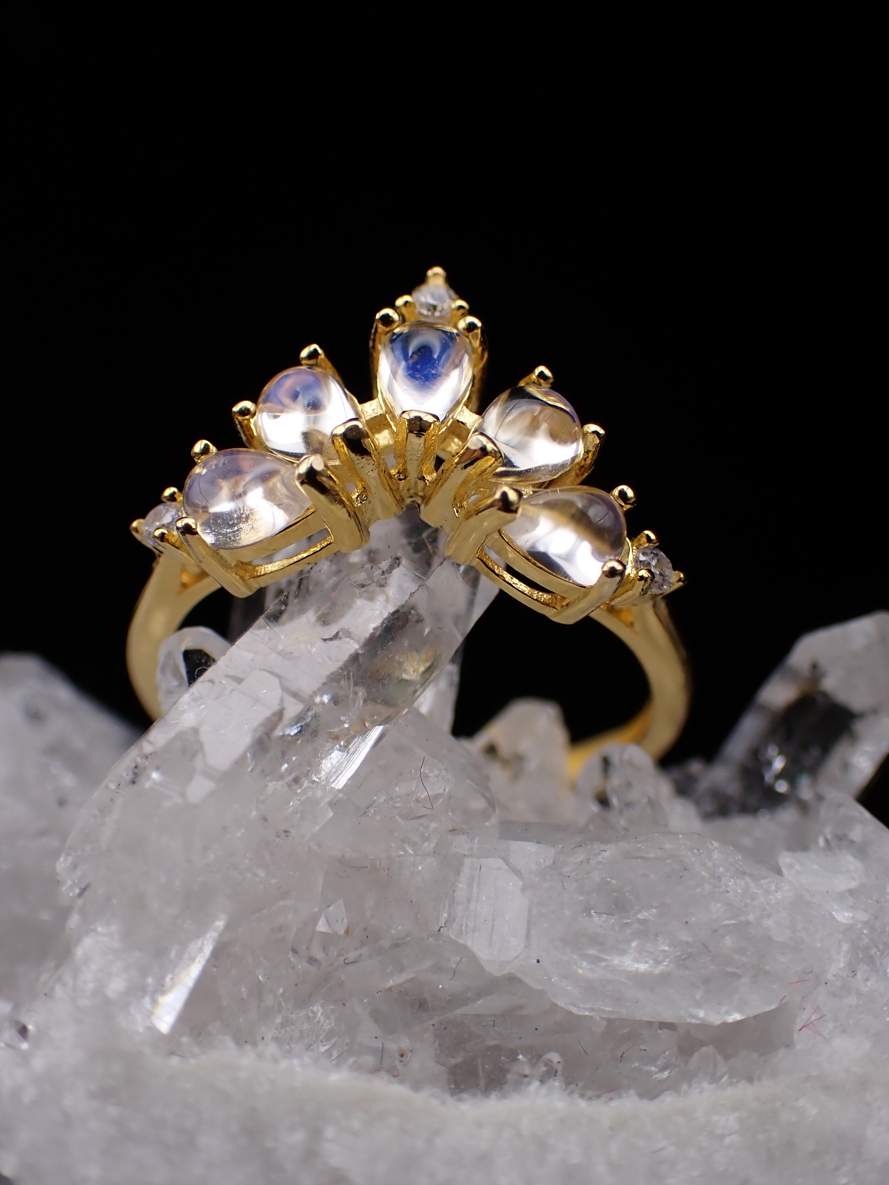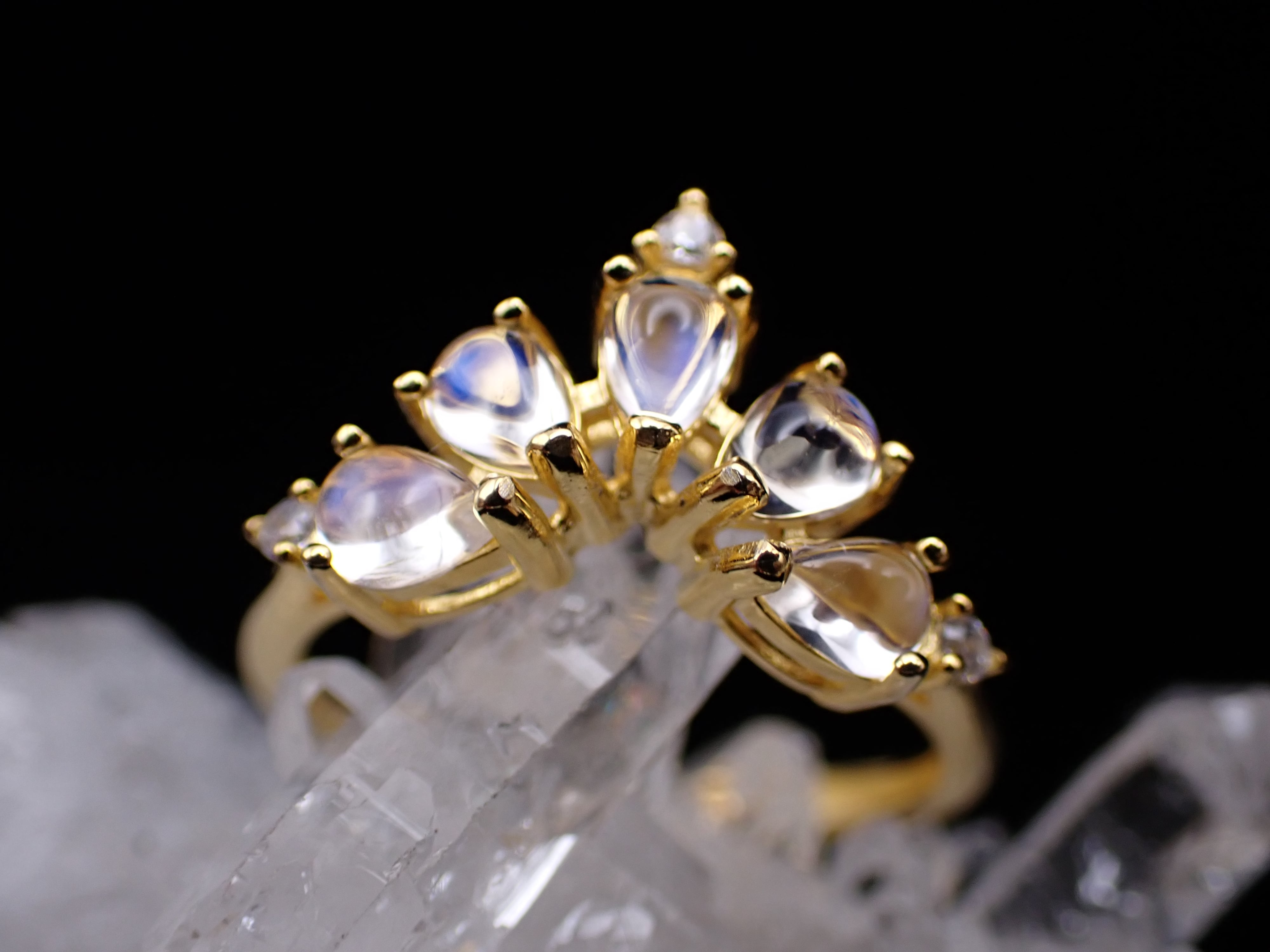 カボションドロップのアンデシンラブラドライトたちが5つ、孔雀が羽根をひろげたように並んだリングです。