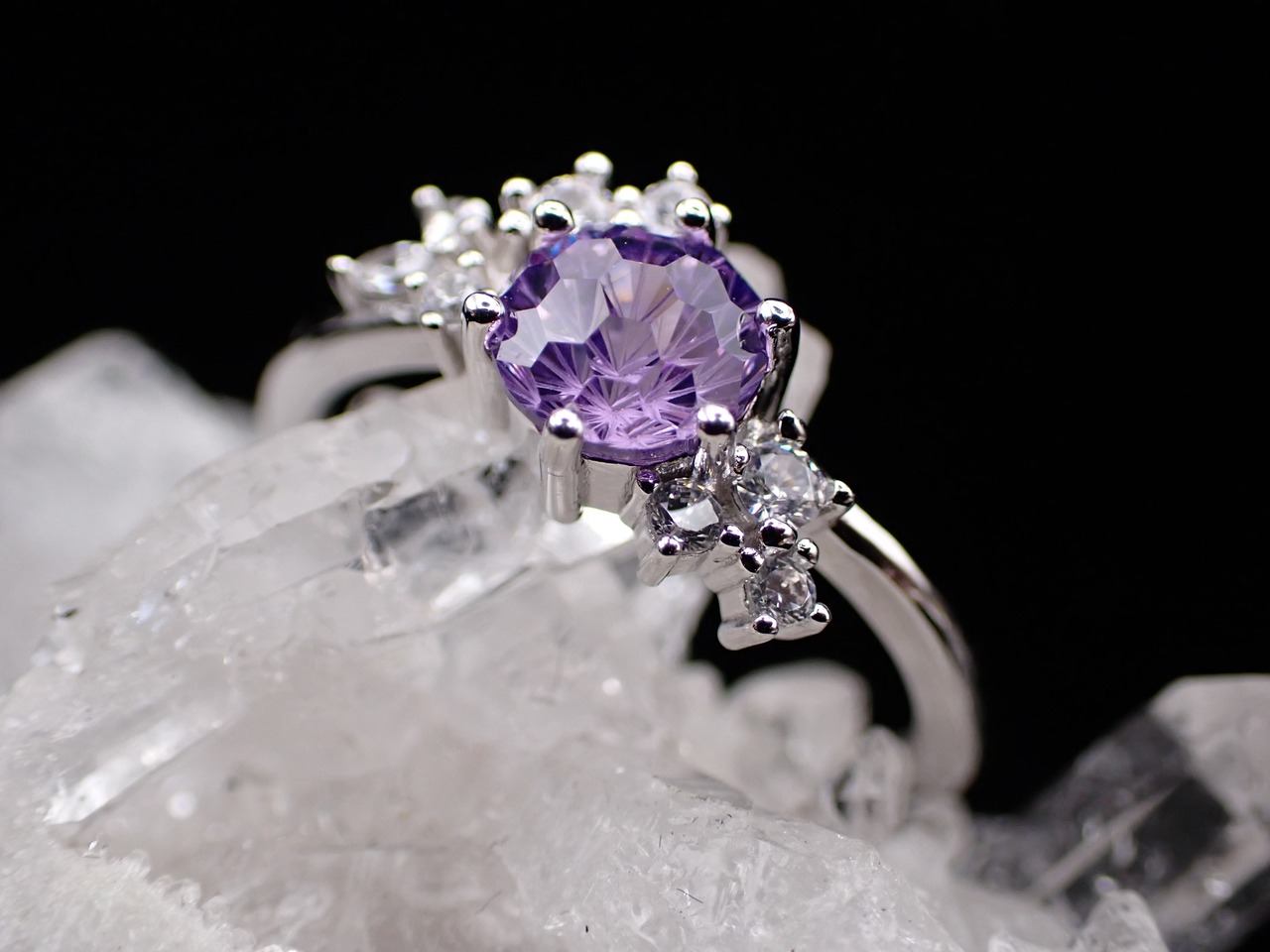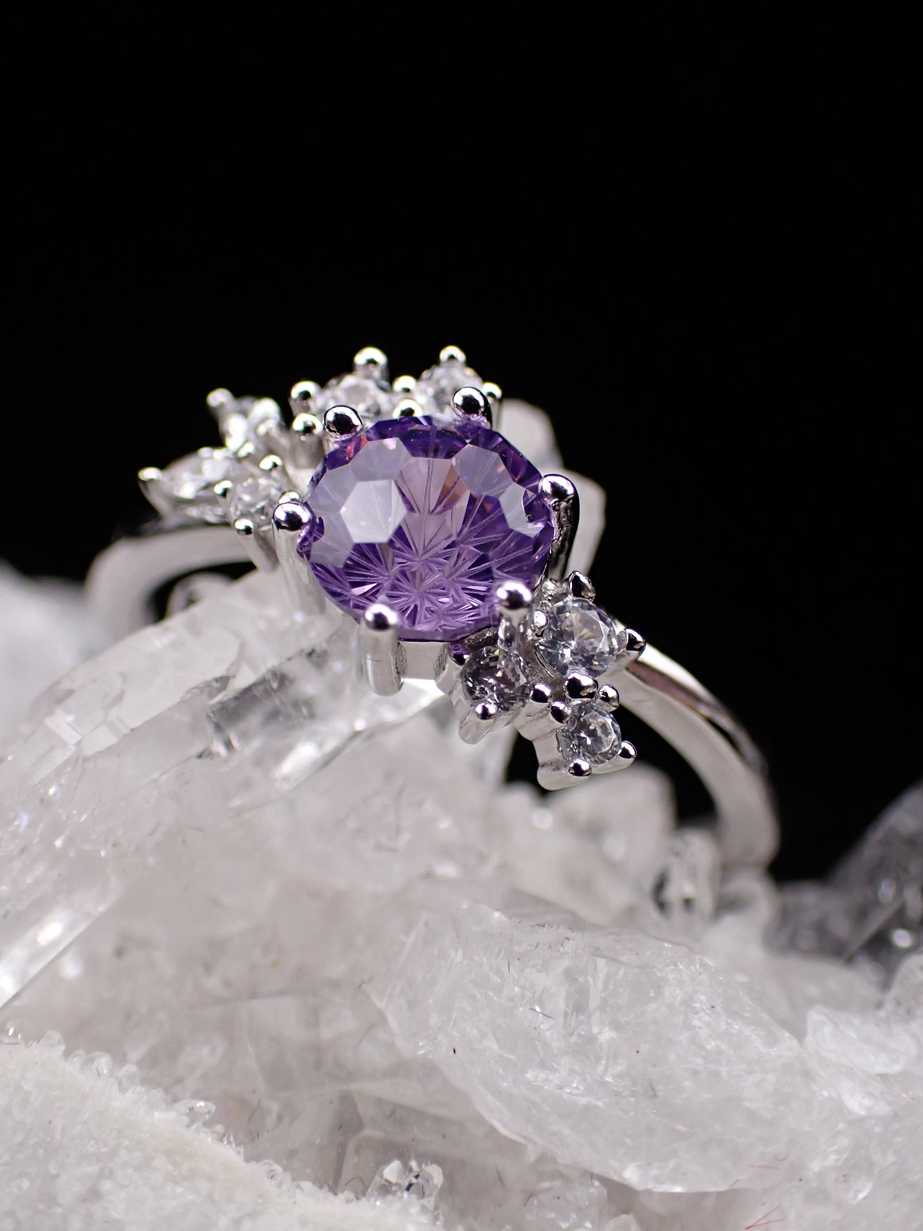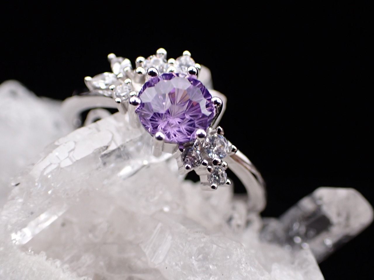 花束のように並んだ小さなジルコニアたちが、花火カットのジルコニアをさらに輝かせる繊細なリングです。