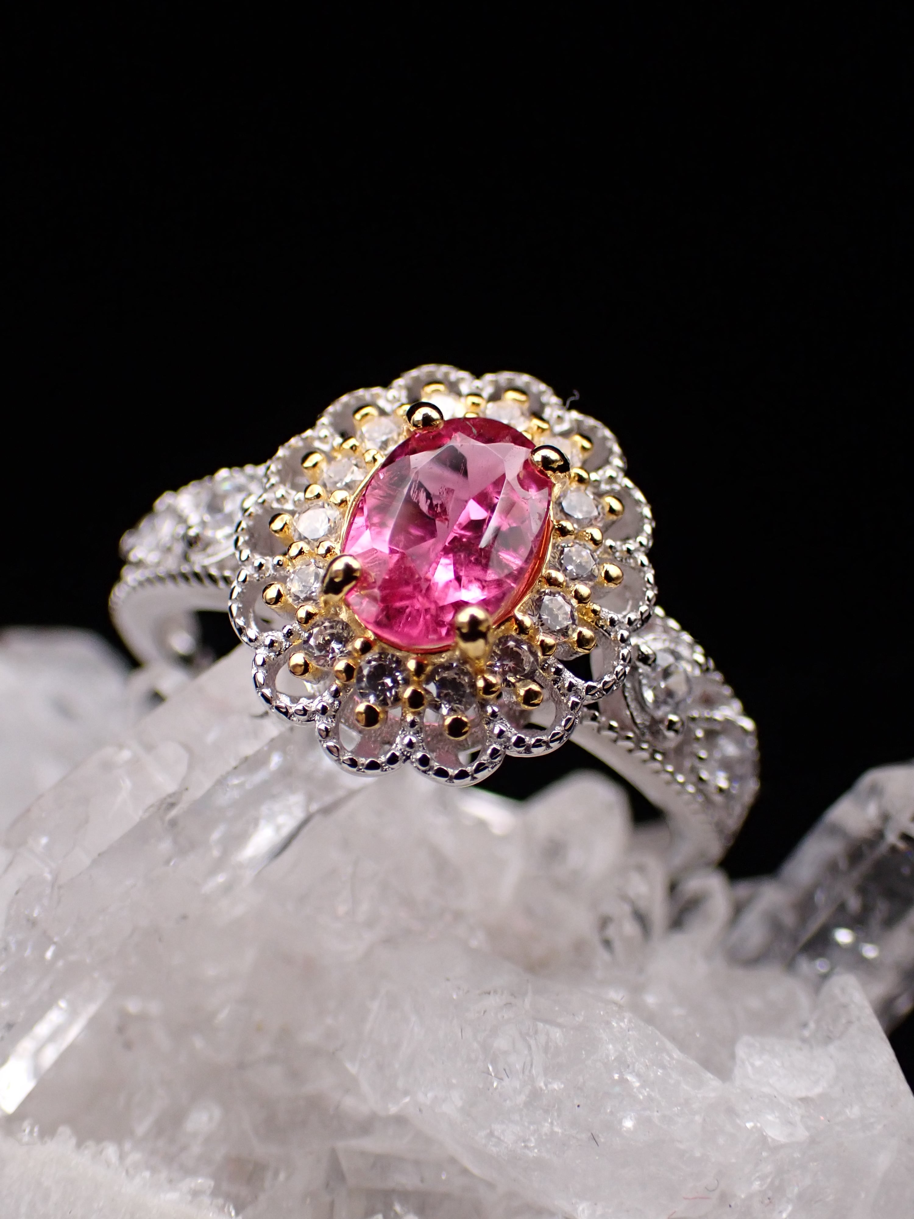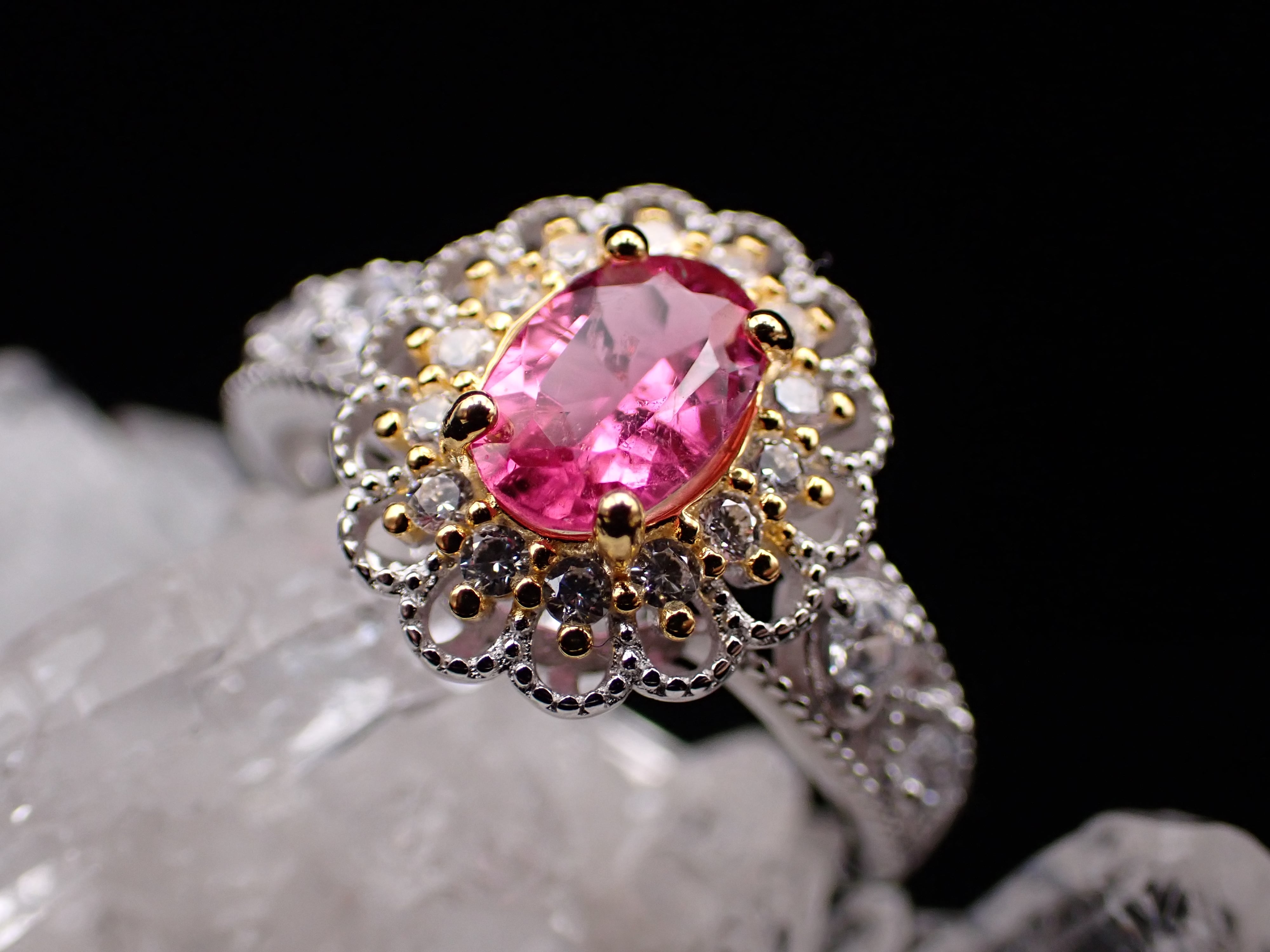 鮮やかで美しいピンクトルマリンが中央に鎮座したゴージャスなリングです。