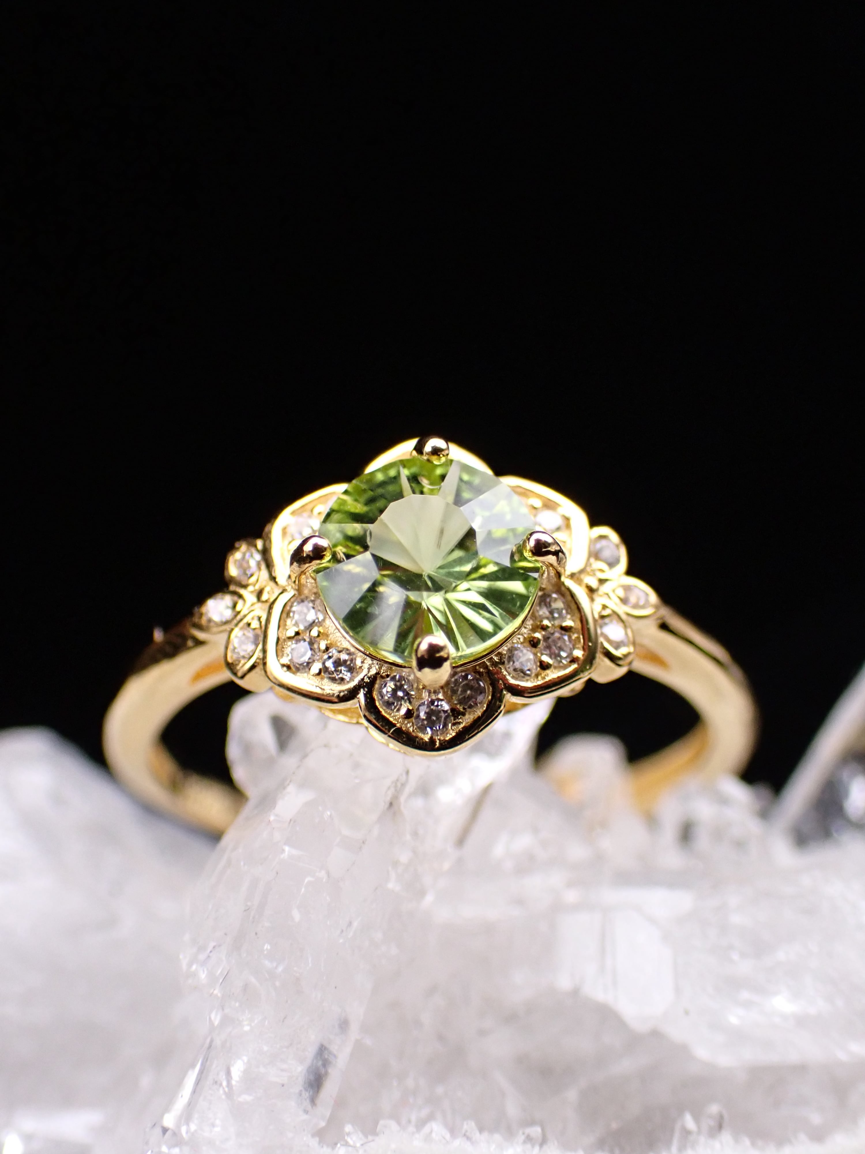 桔梗の花びらの中央に咲き誇る美しいコンケーブペリドット。
