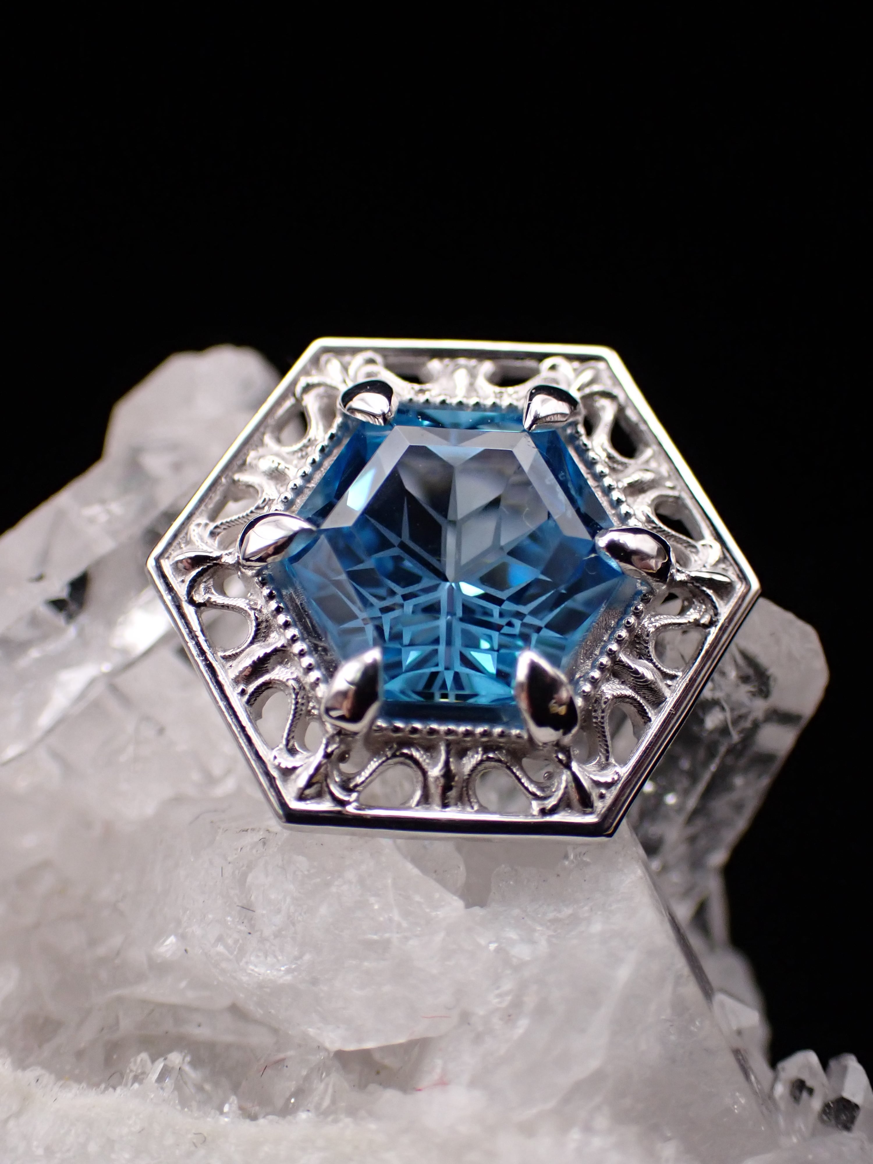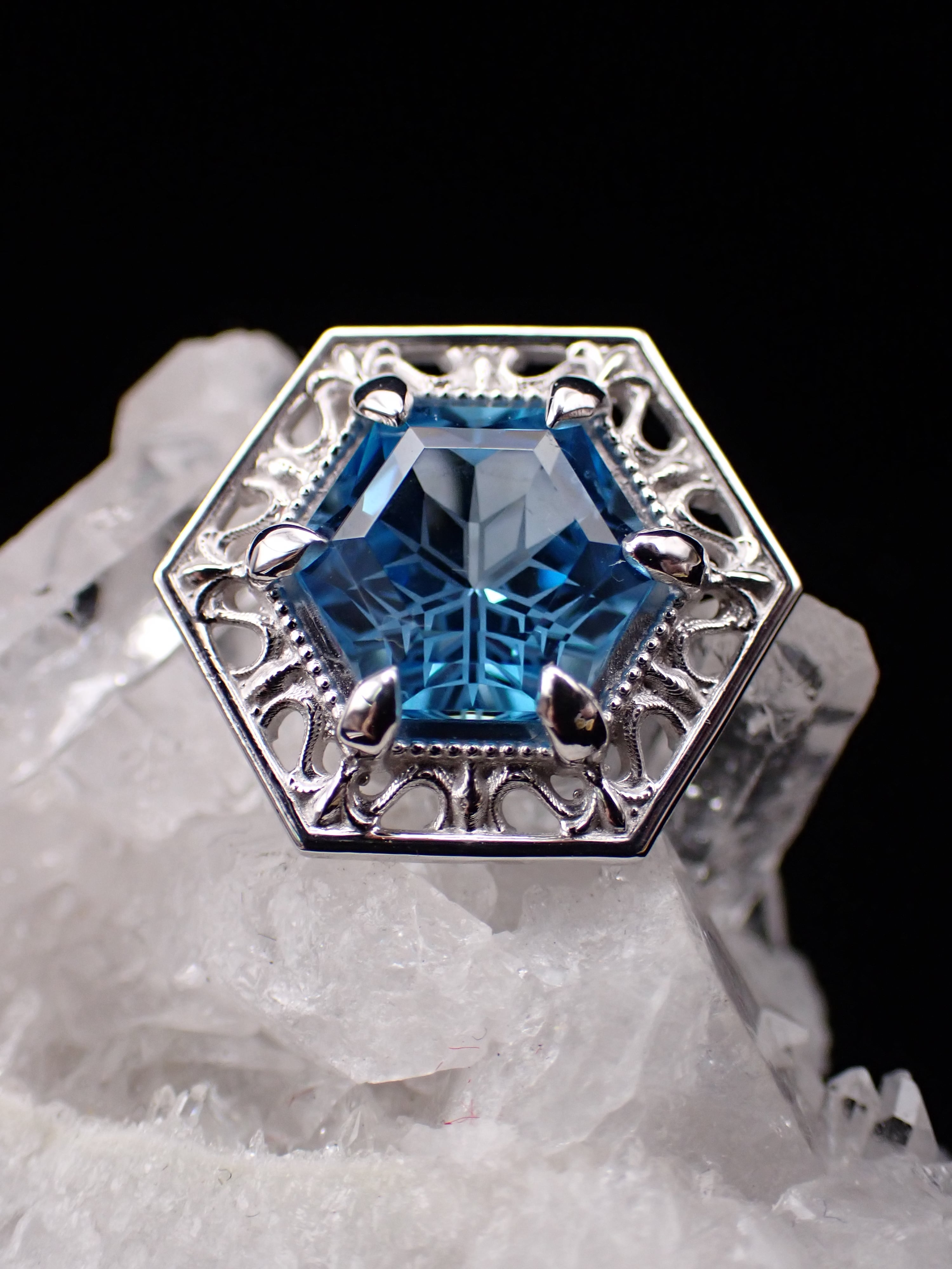 シミズ貴石さま研磨の美しいゆきんこカットのブルートパーズを、透かし額縁の中へ納めました。