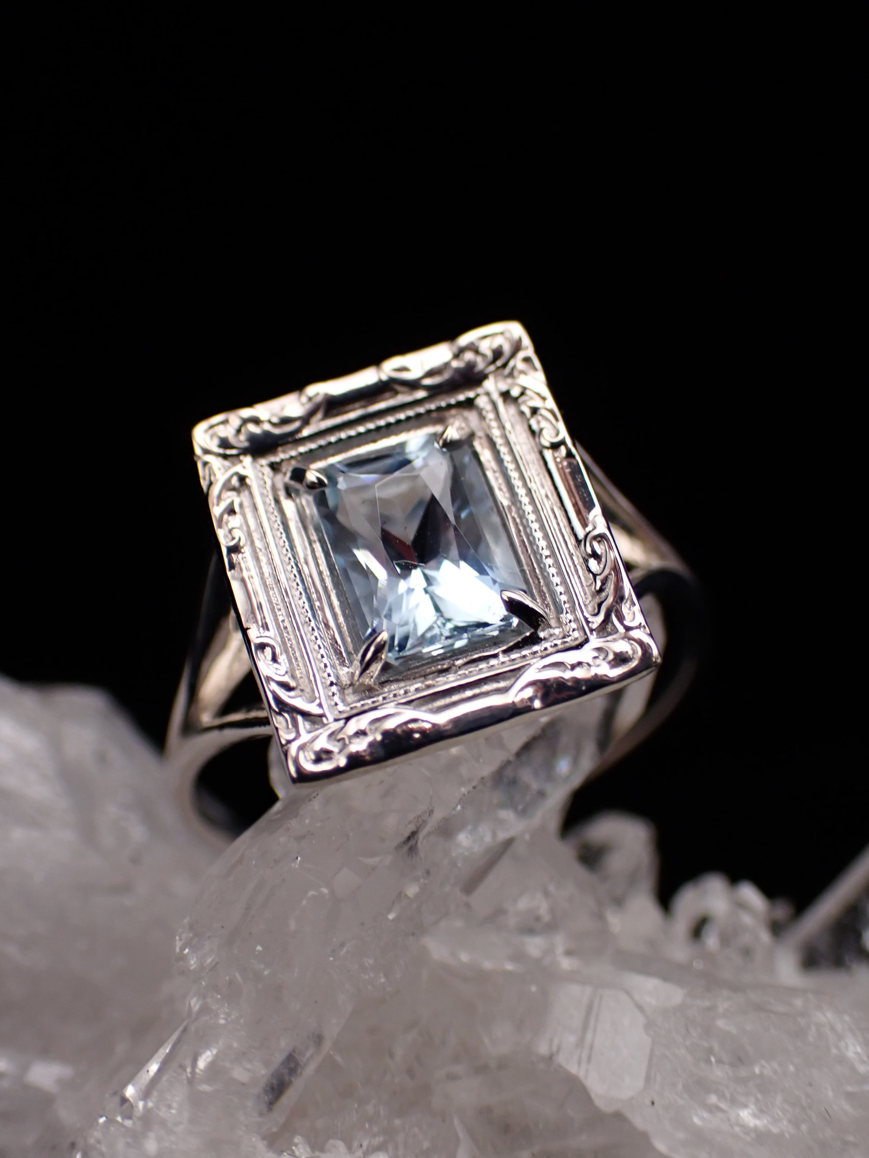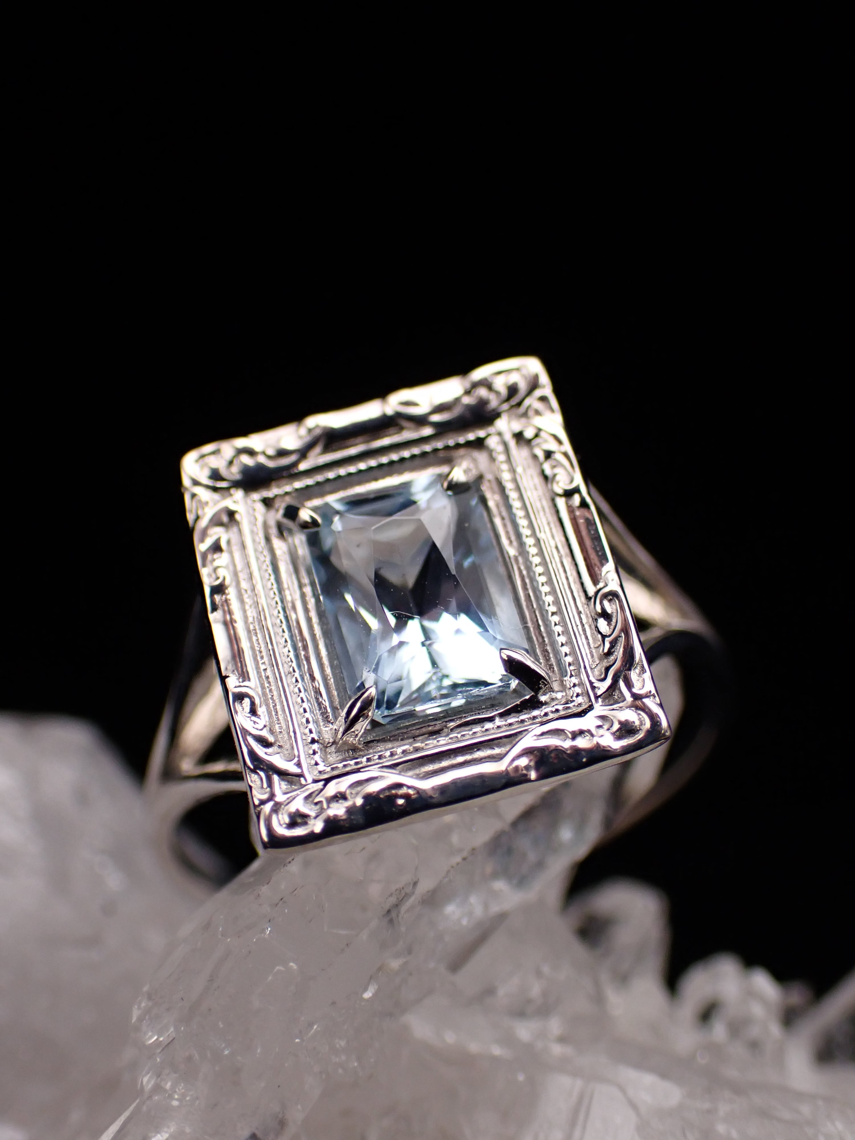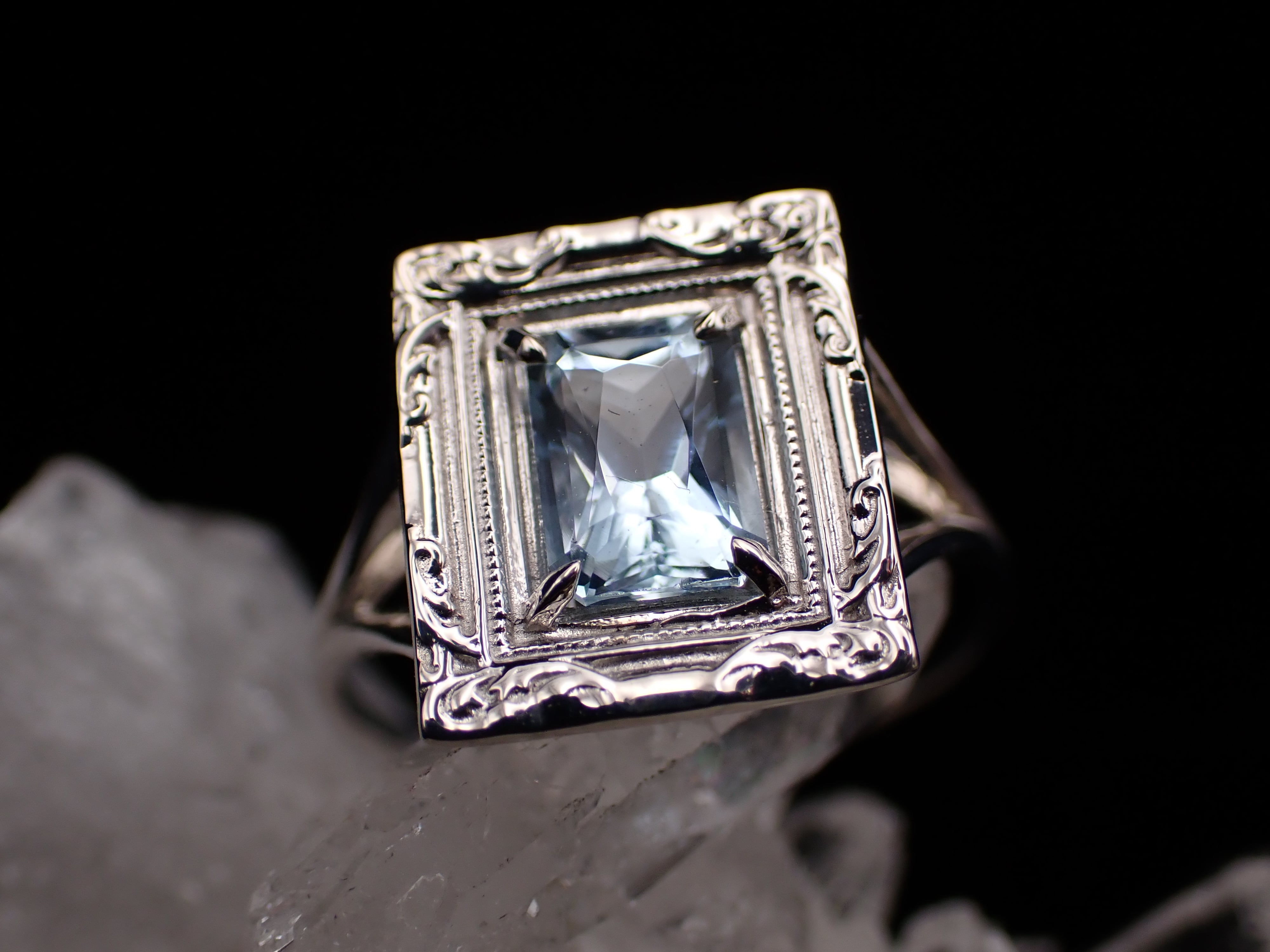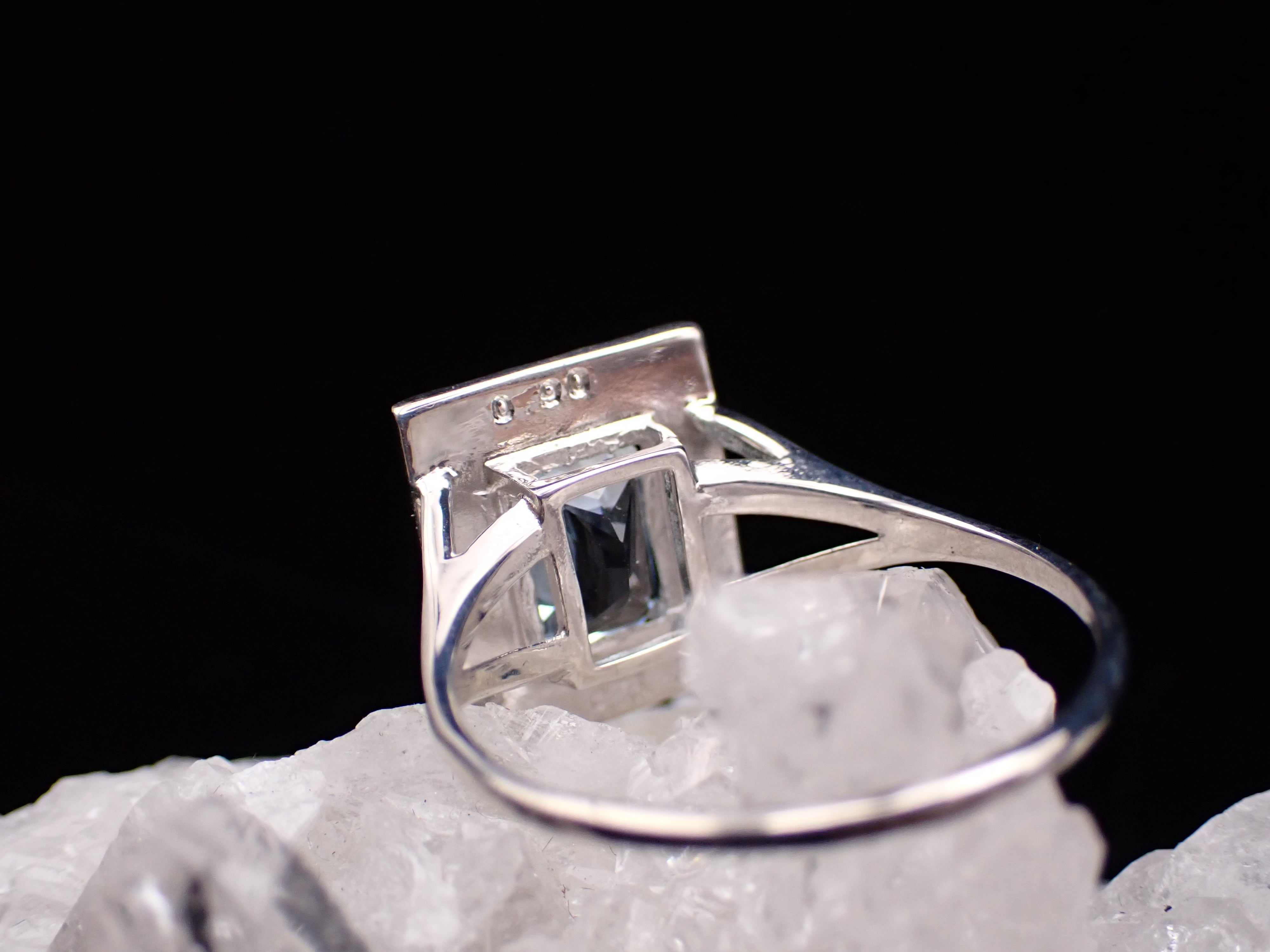 額縁の裏側はフラットにし、石が存分に光を蓄えながらも軽く着け心地がよいリングとなっています。