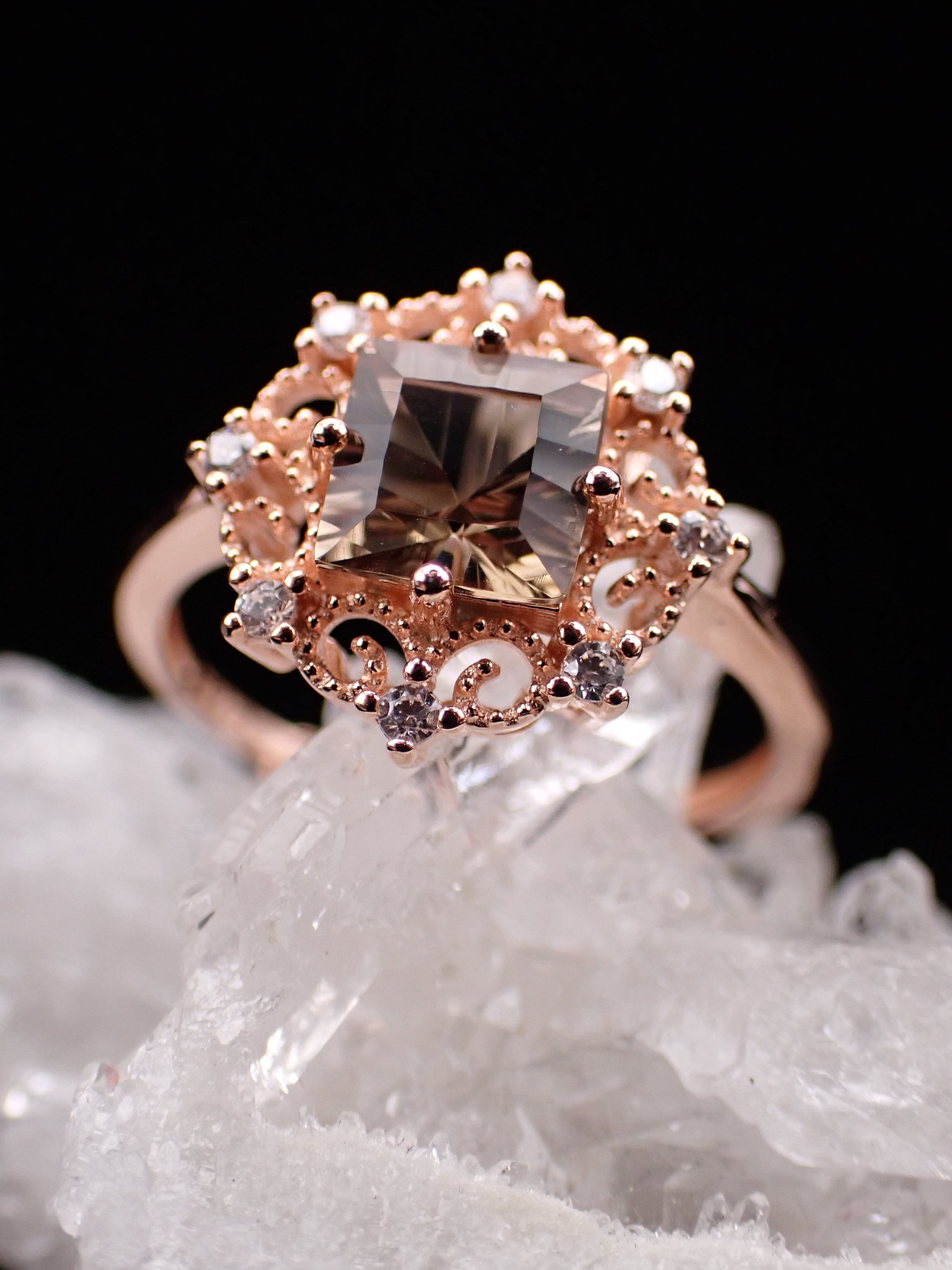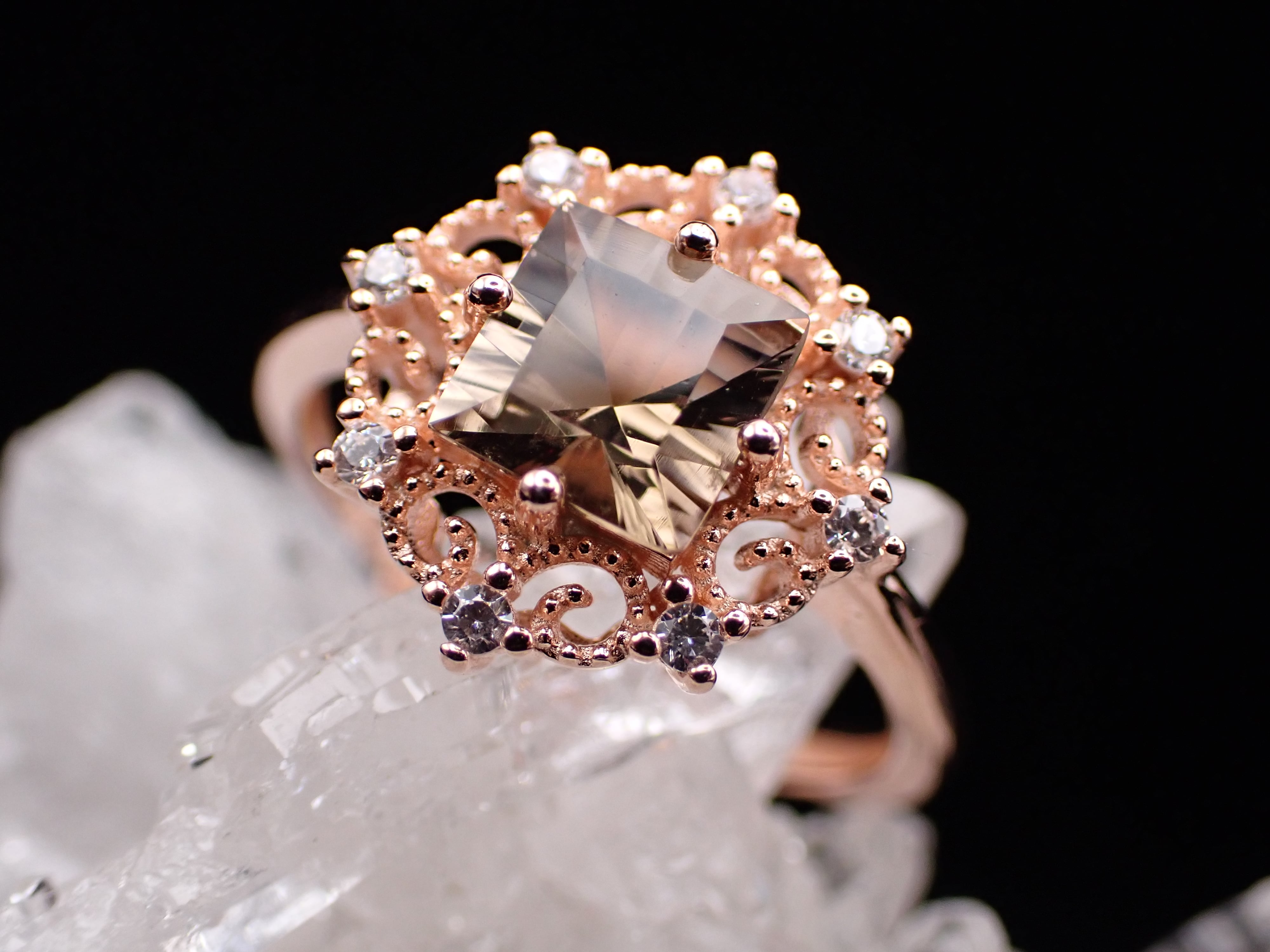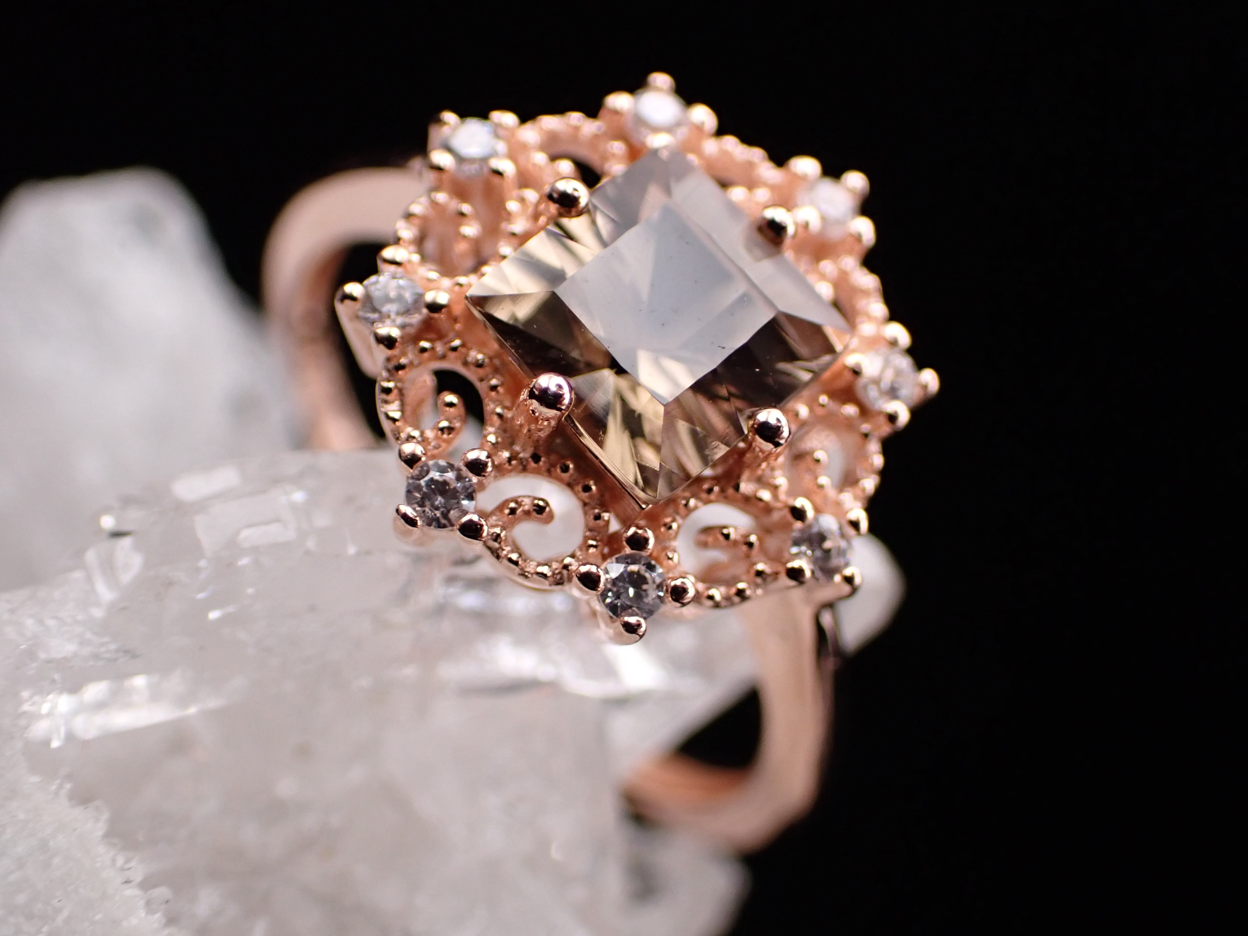 シックなスモーキークォーツが中央に輝く雪の結晶のリングです。