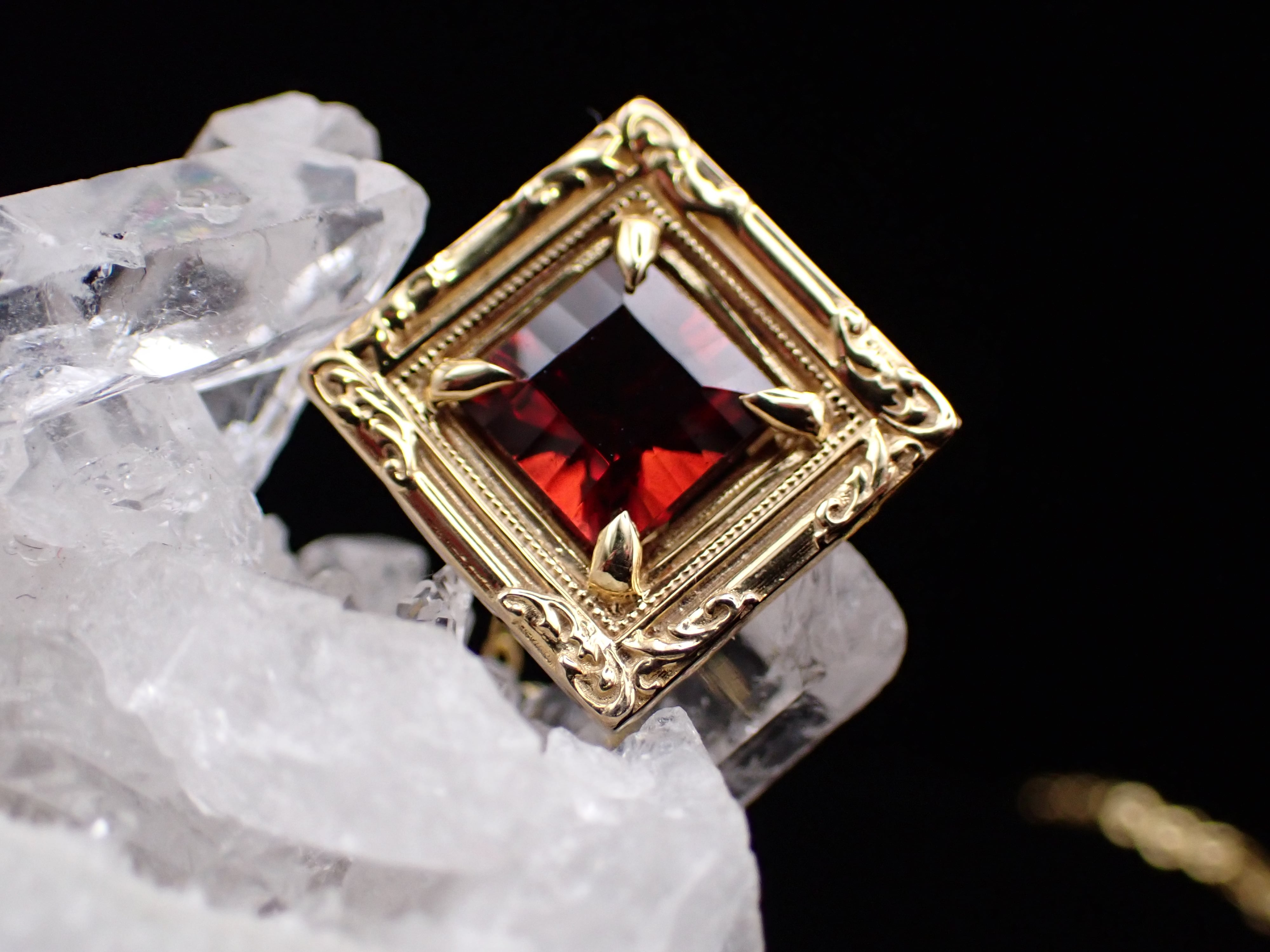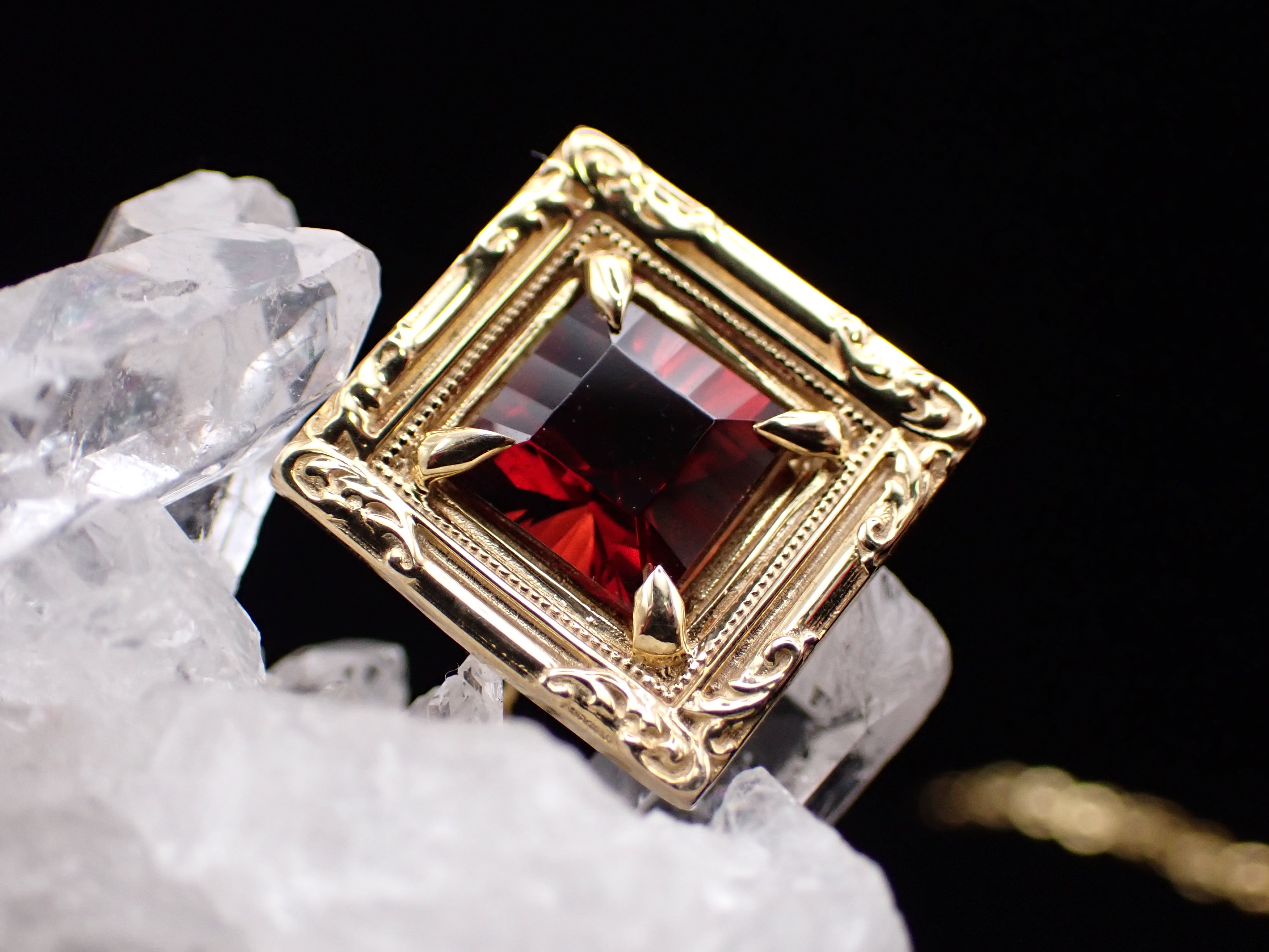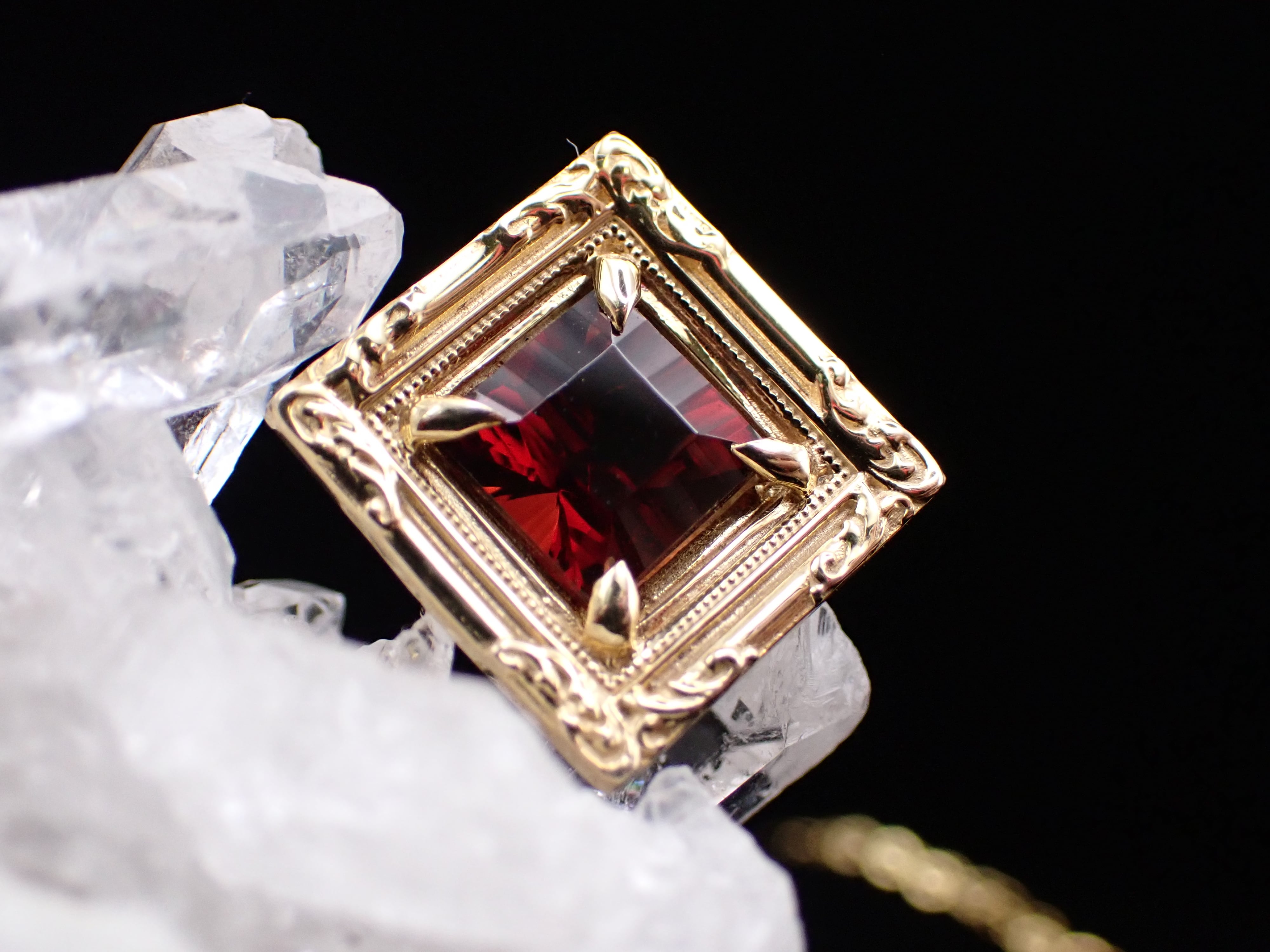こっくりと深い赤が鋭く輝き、イエローゴールドのコラボレーションが美しいペンダントを楽しみください✨