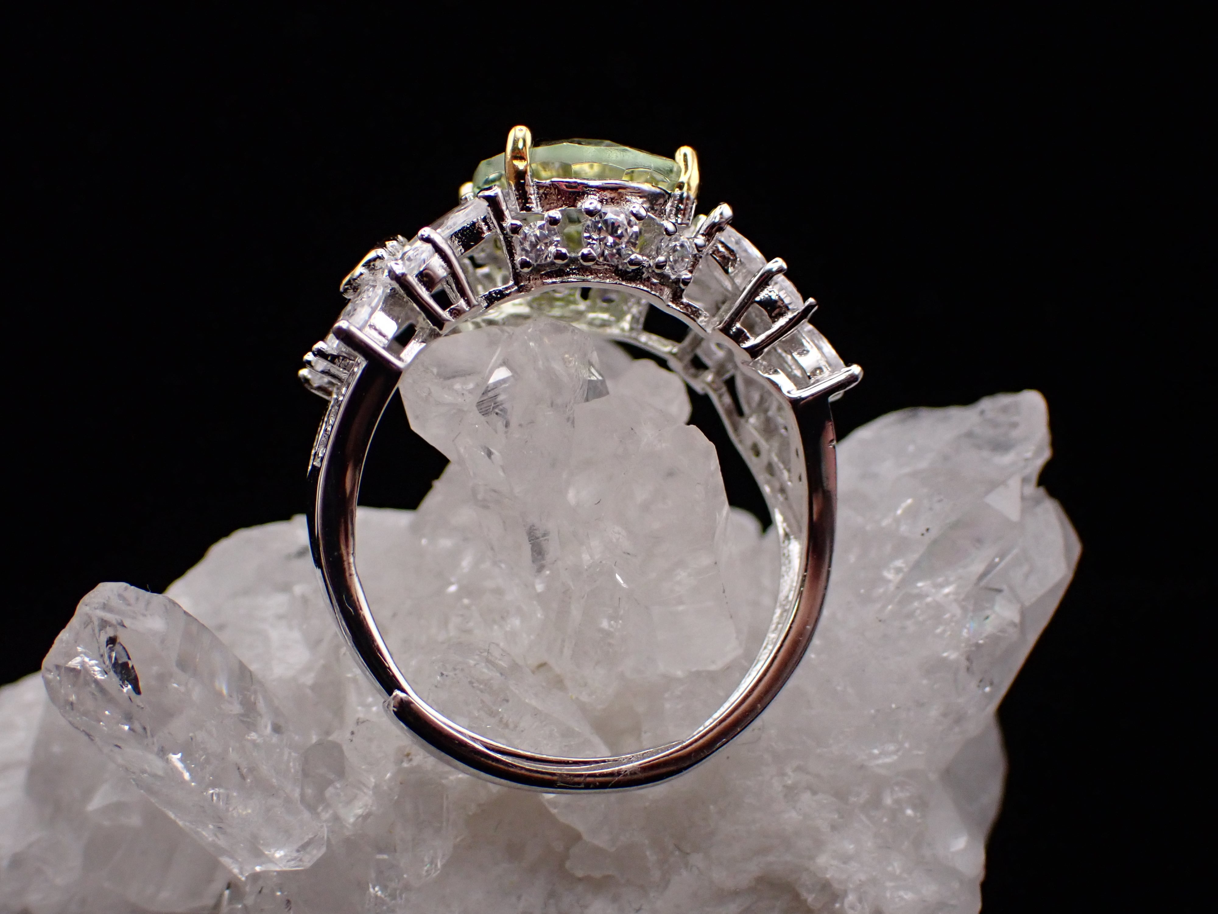 石の周りは美しいジルコニアで囲まれてゴージャスながらも、裏側は肌あたりが良く、安定感のあるアームとなっております。