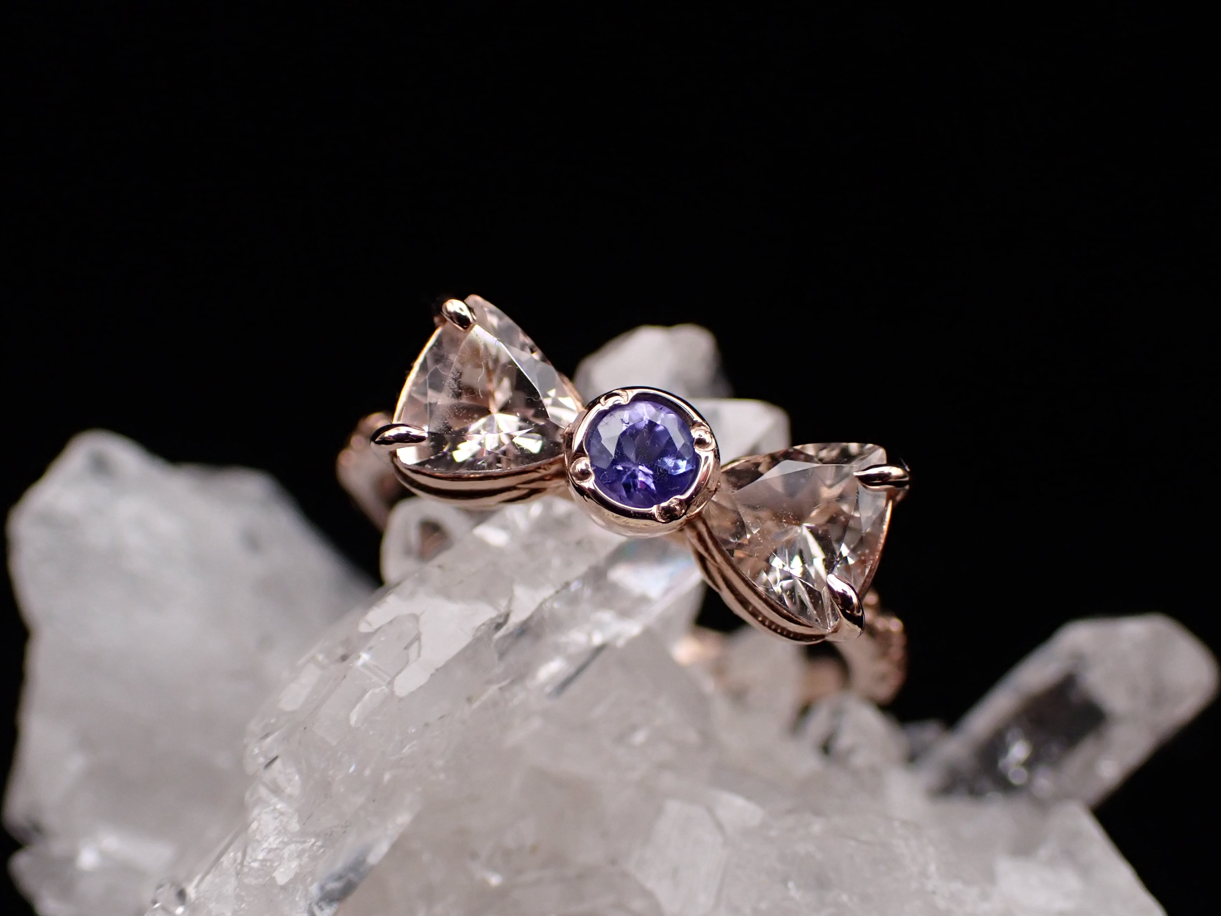 メインは淡い桃色の輝きのモルガナイト、中央の石はモルガナイトの輝きをクールに引き締めるタンザナイトです。