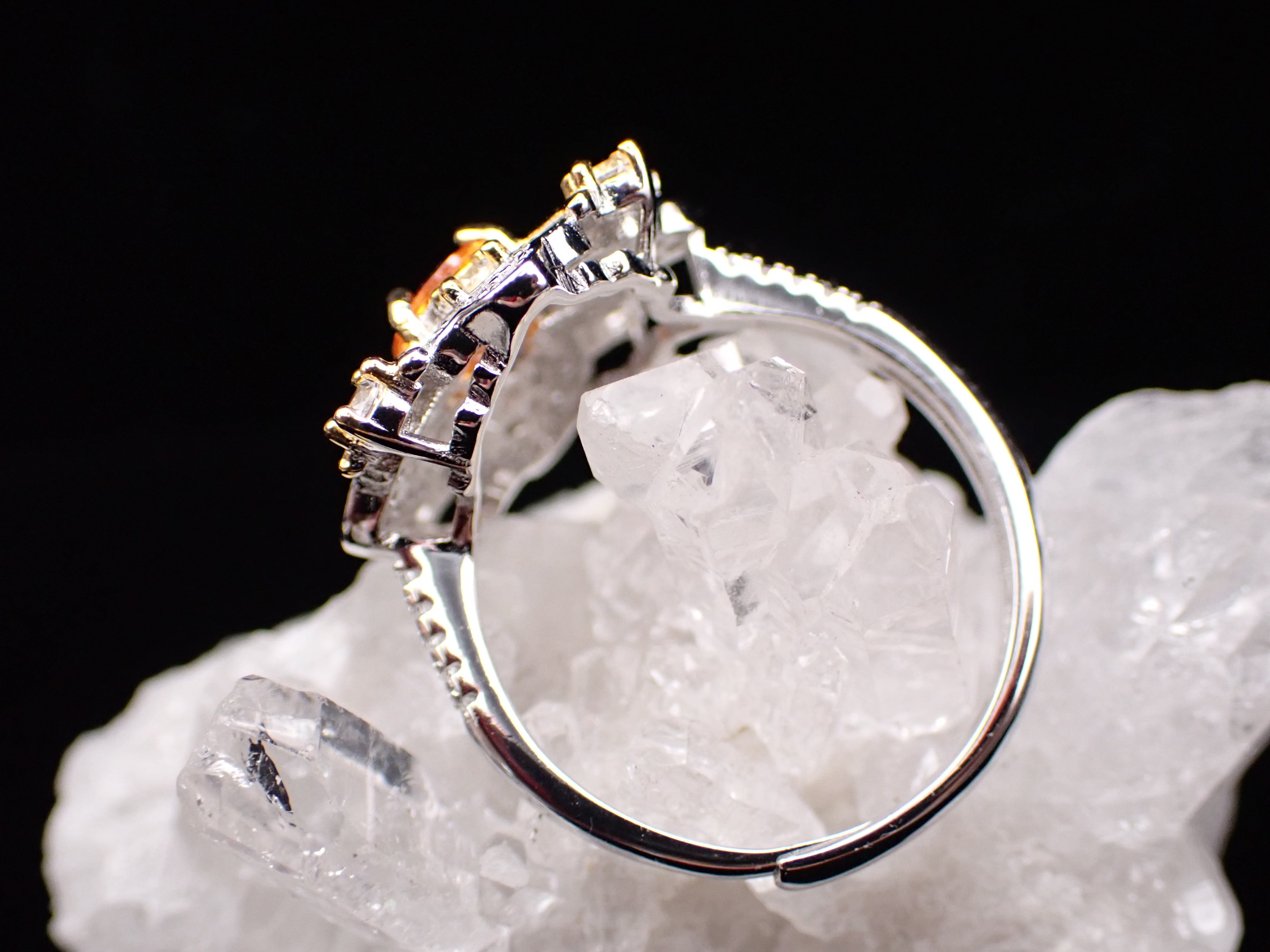 光の盾の様に煌びやかに広がったジルコニアたちがキラキラと輝き、中石の色味を引き立てます。