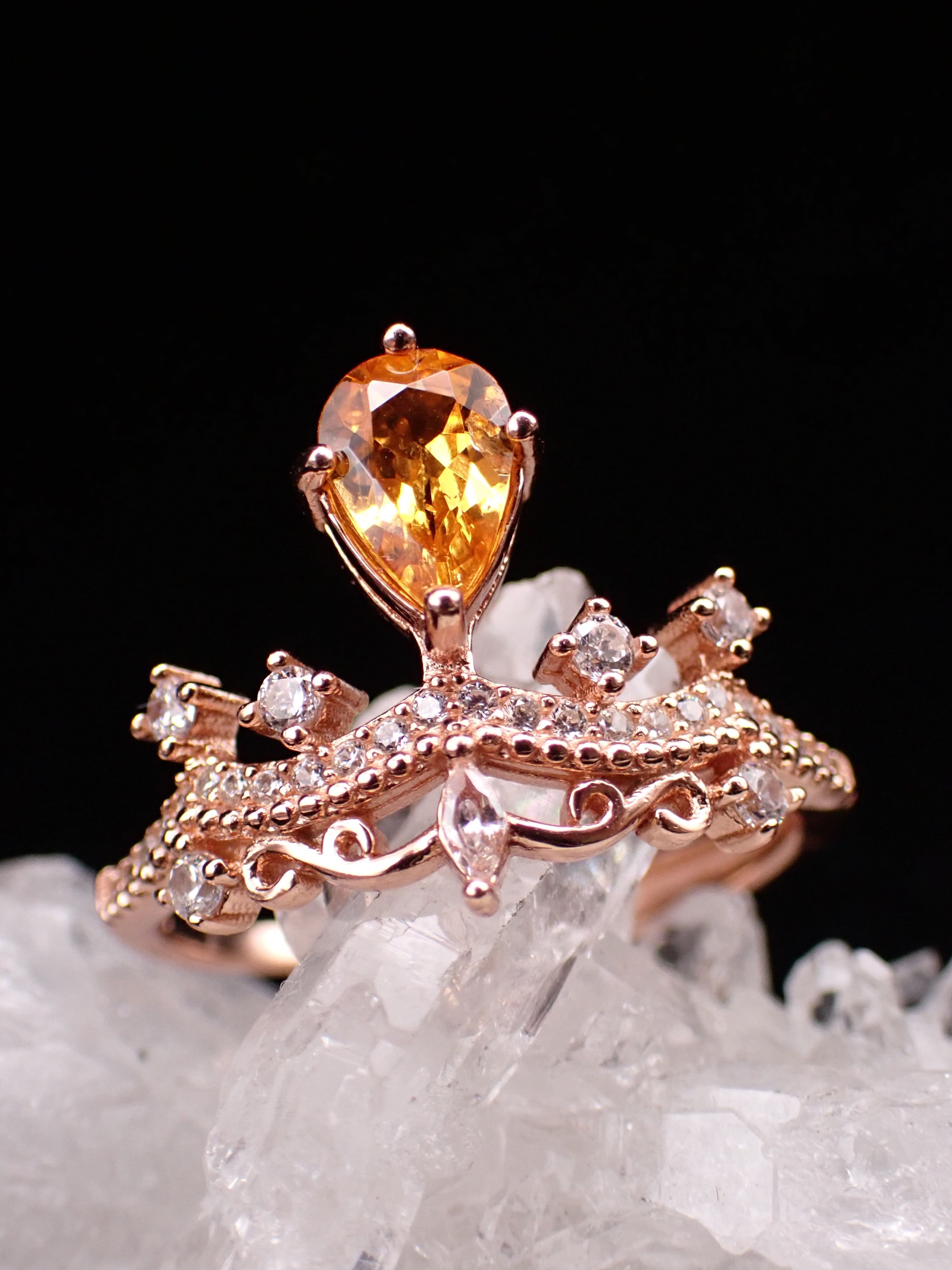 まるでシャンデリアのように美しいデザインのトップから鮮やかなスペサルティンガーネットが零れ落ちんばかりに輝いているゴージャスなリングです。