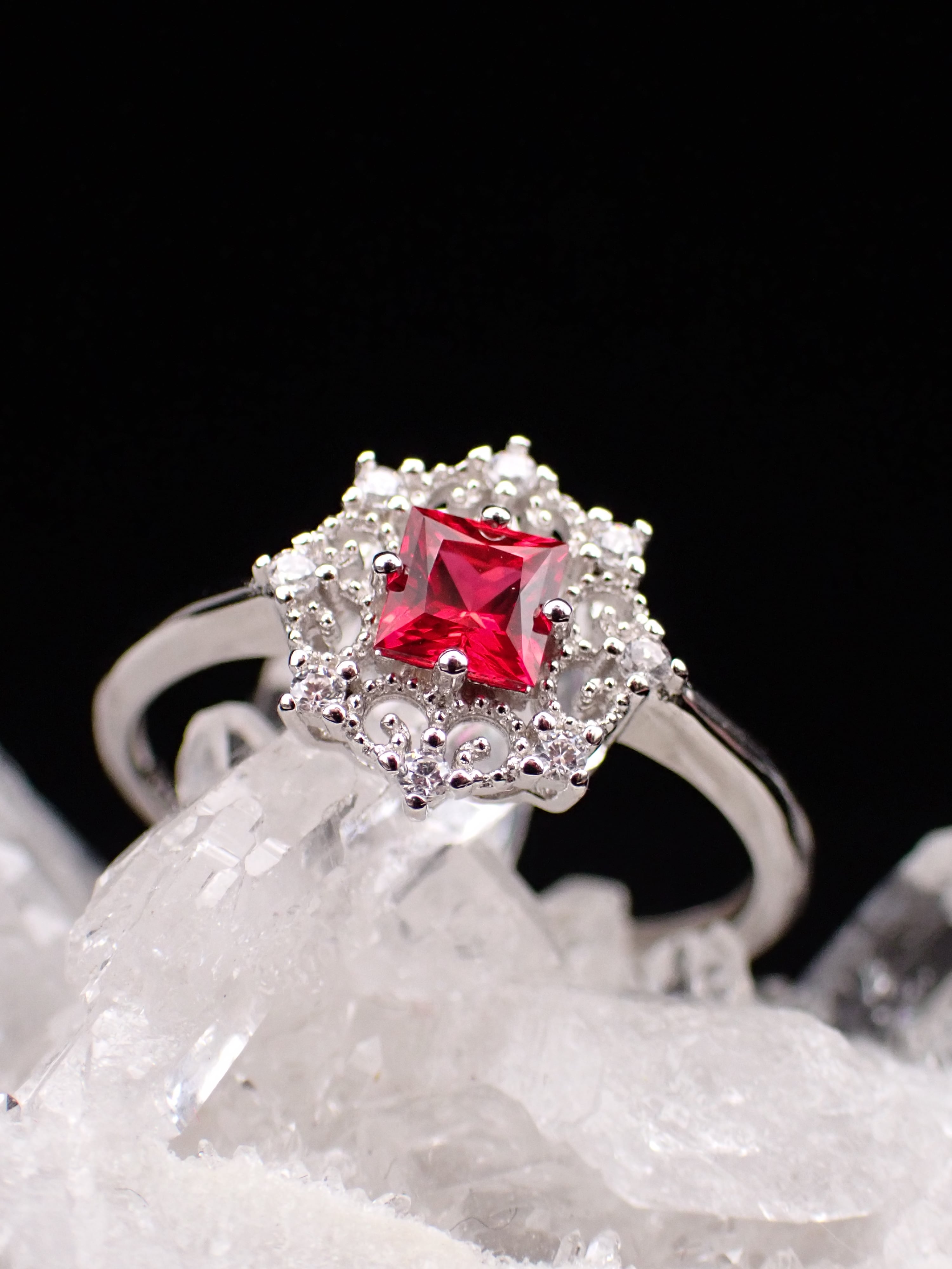 真紅の合成ルビーが中央に輝く雪の結晶のリングです。