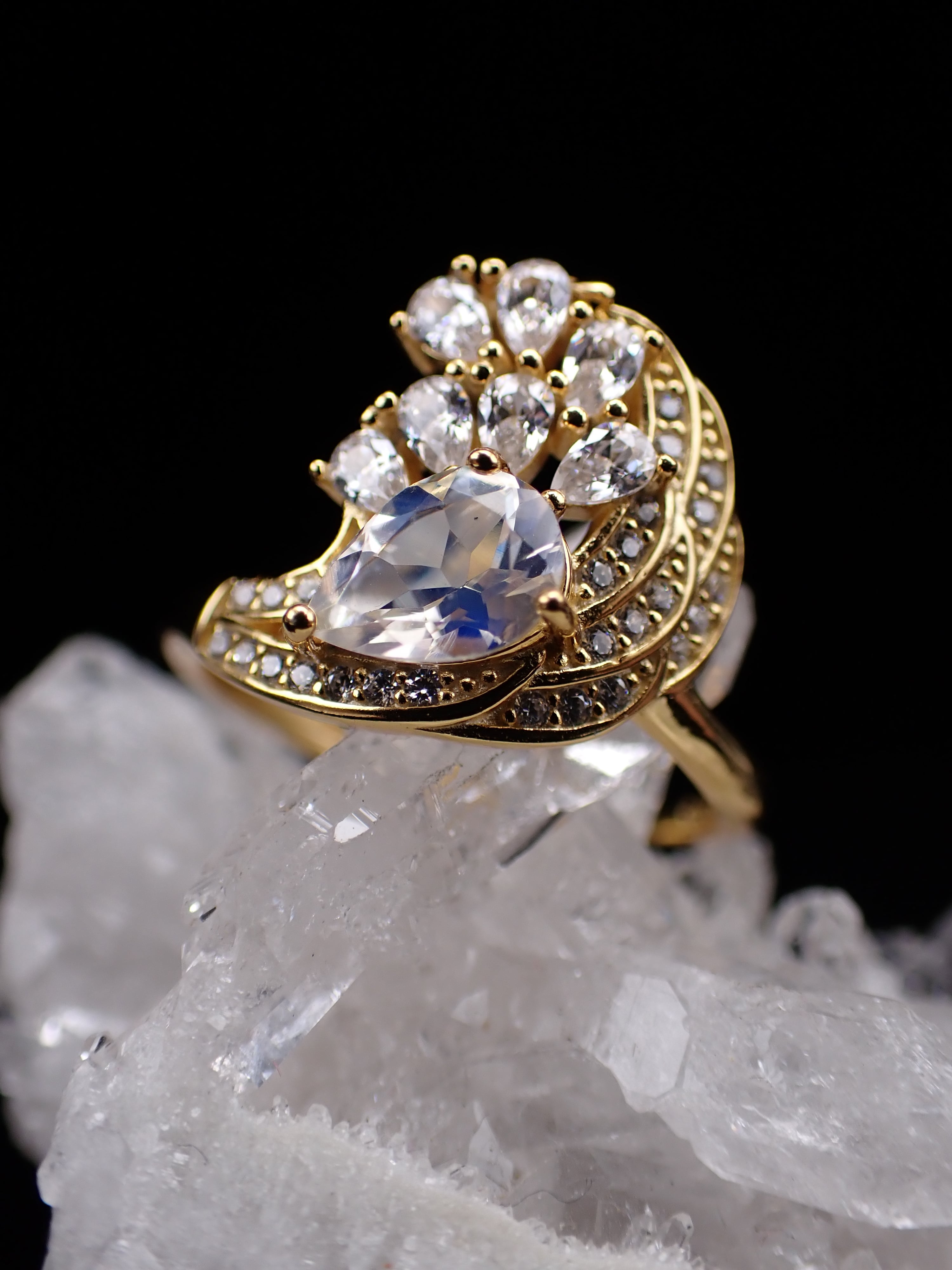 仮面舞踏会に出てきそうな美しい孔雀が羽根を翻したようデザインに、美しいアンデシンラブラドライトを添えたリングです。