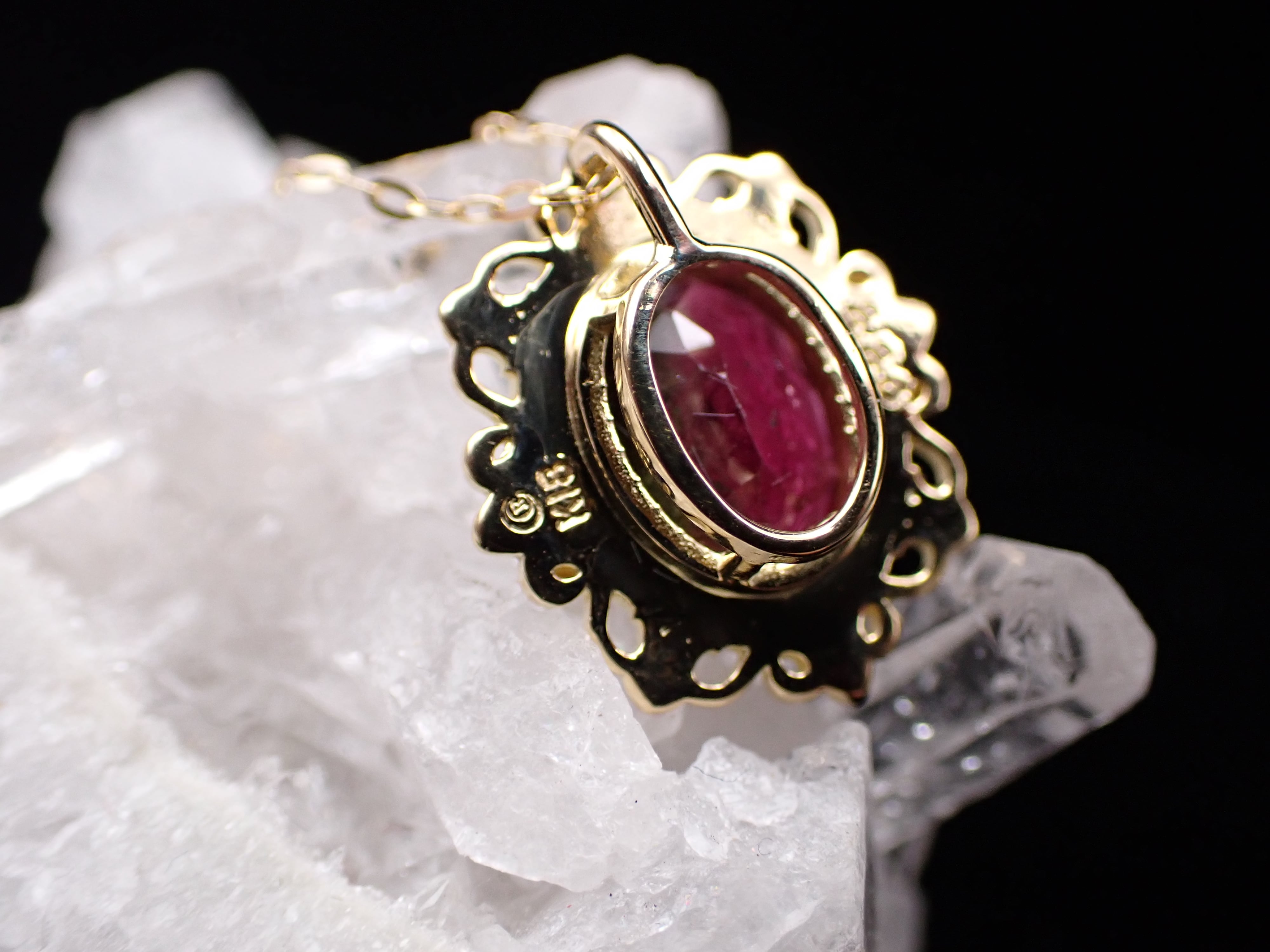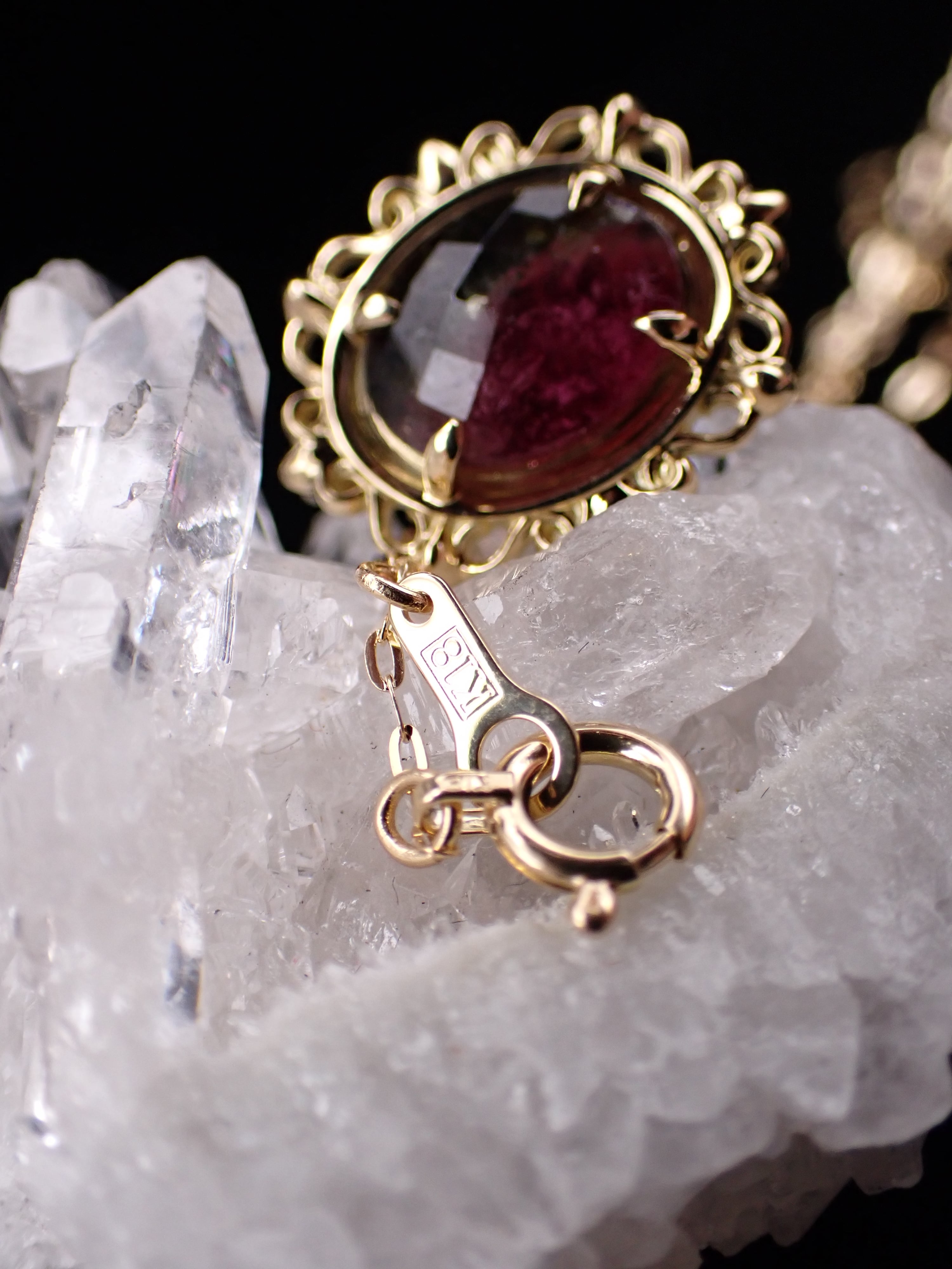 まるで石を絵画のように美しい額縁の中へ、深いバイカラーのトルマリンを納めました。