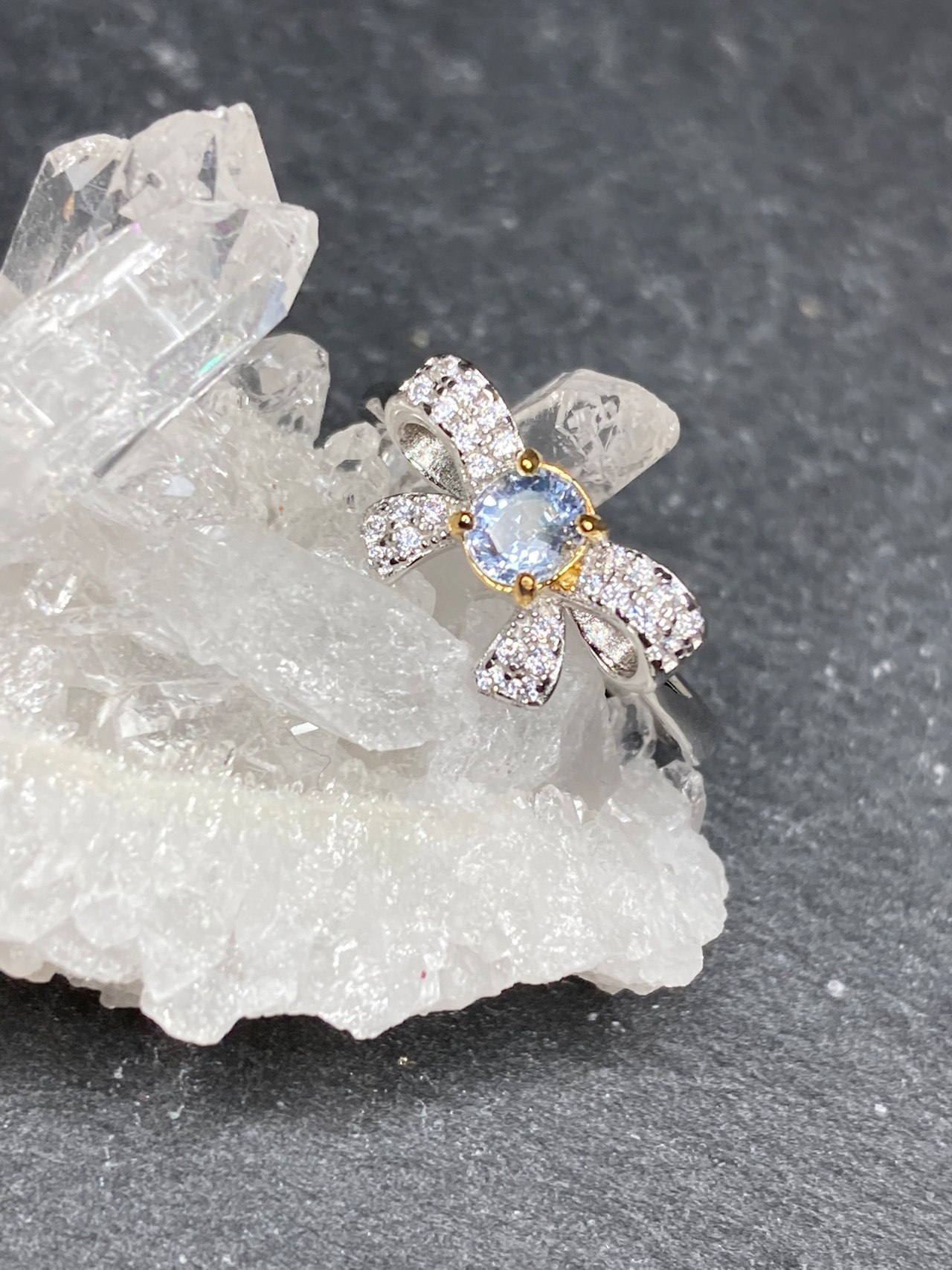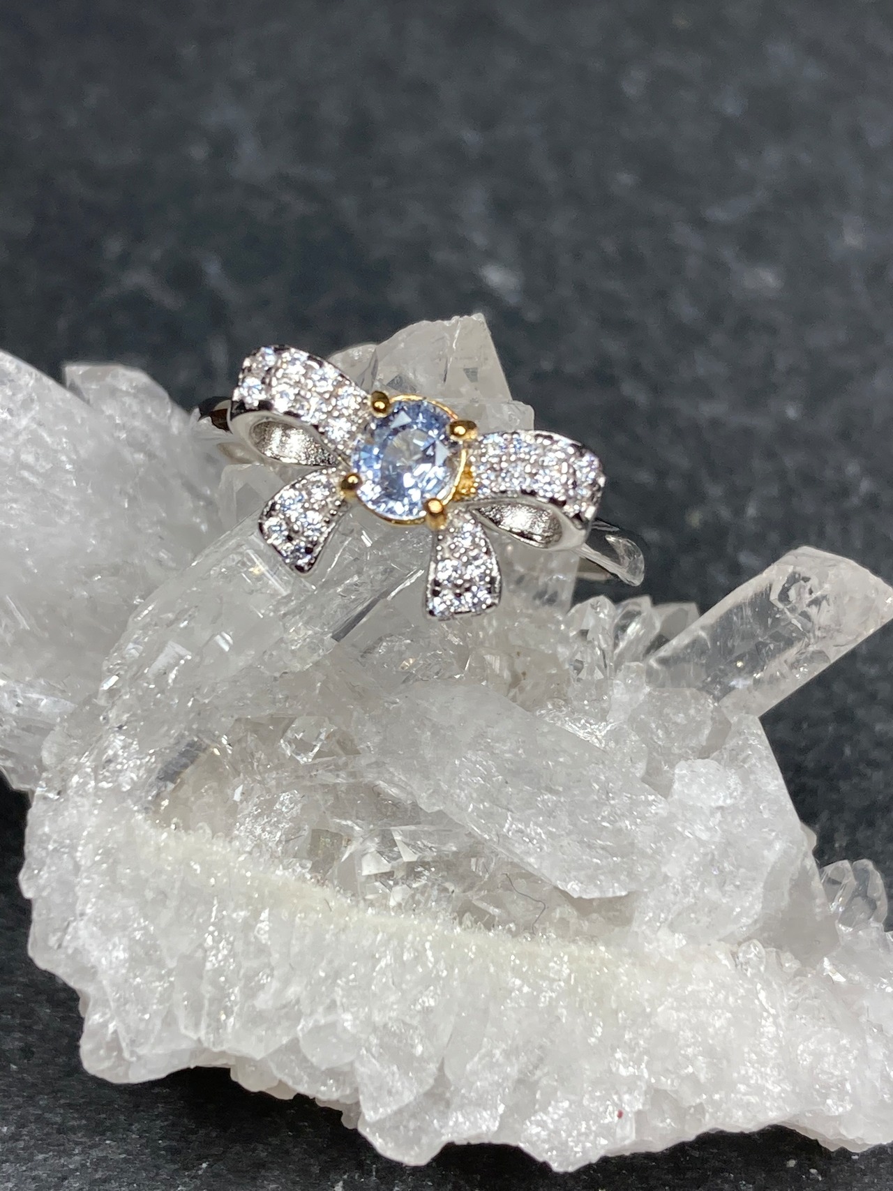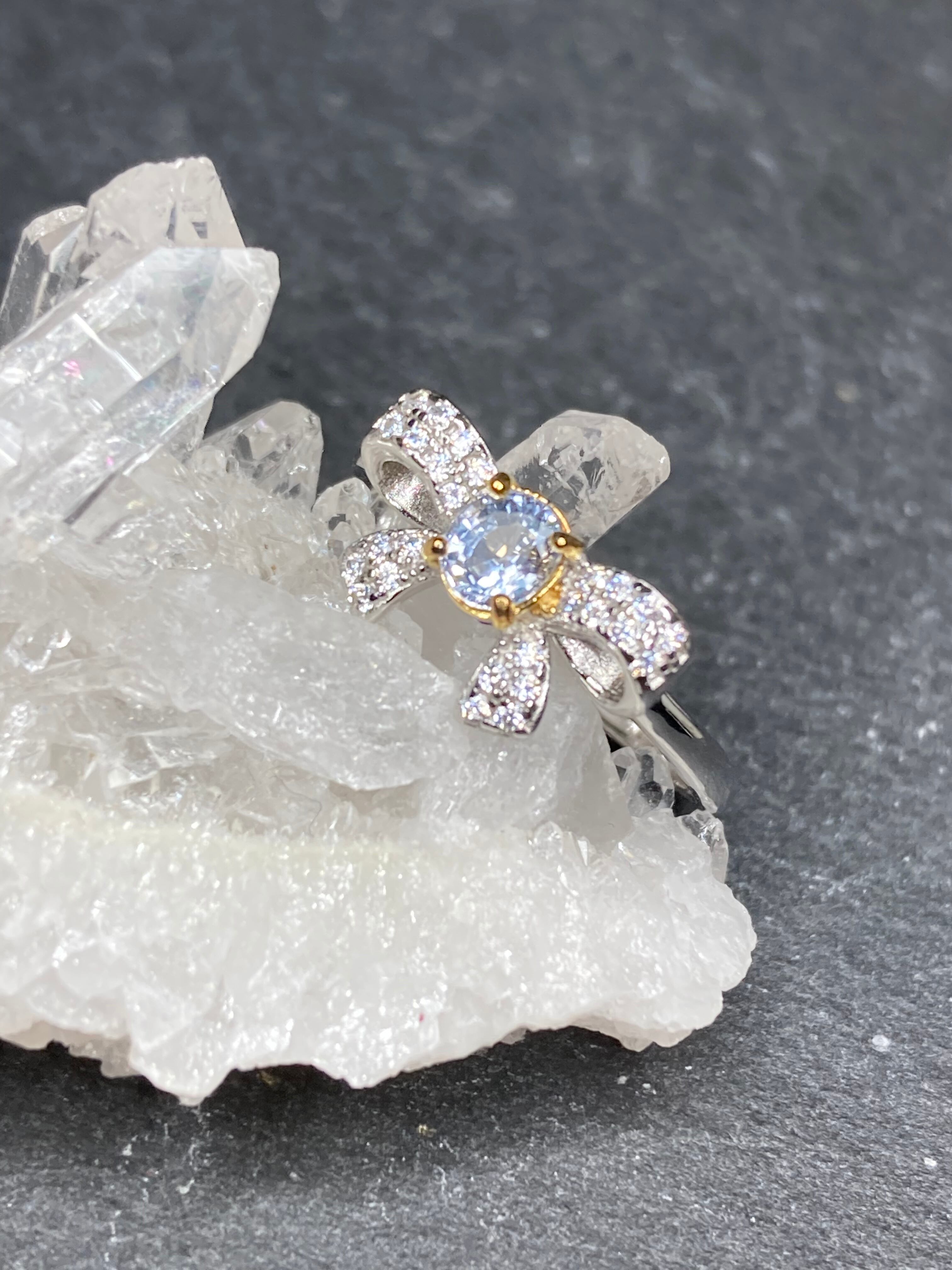 小さなジルコニアたちがサファイアの輝きを引き立てる可愛らしいリングです。