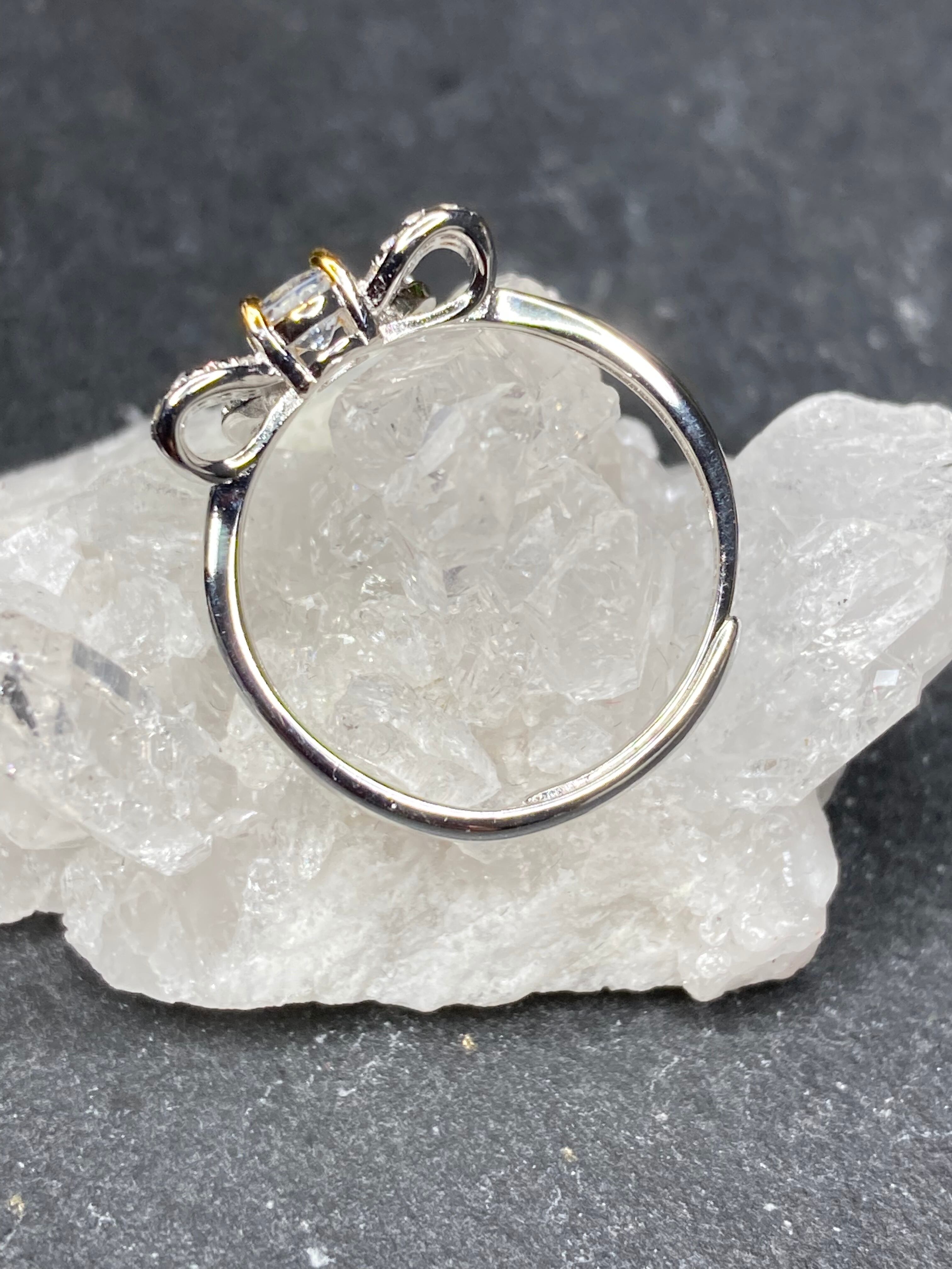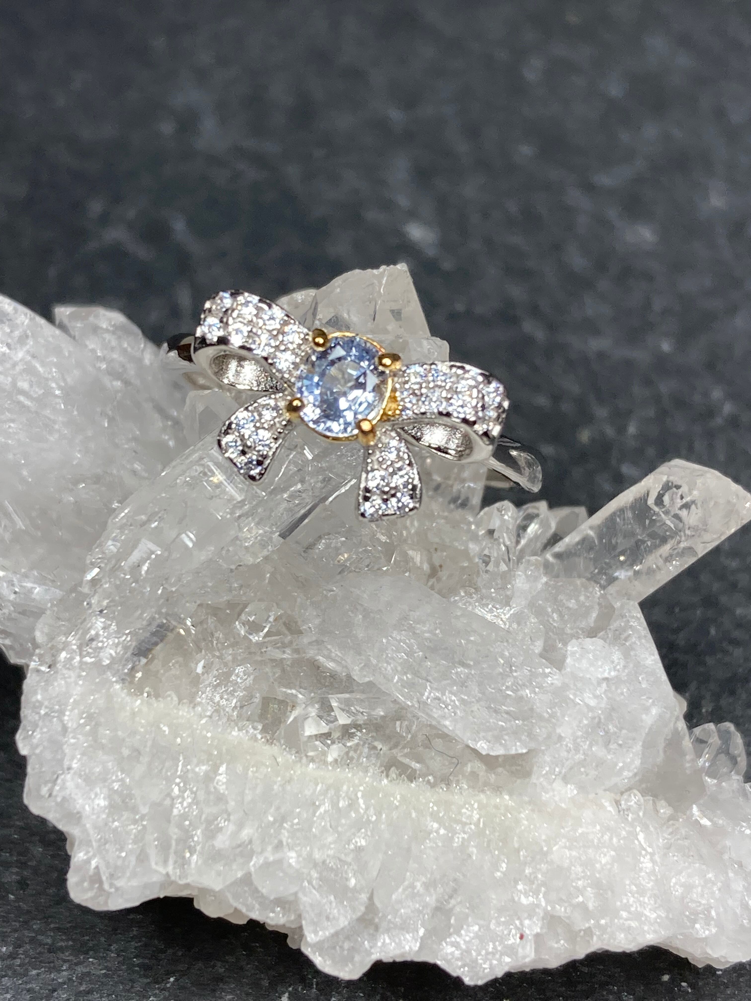 中央にほんのりブルーのサファイアをセッティングしたふわりとしたリボンモチーフのリングです。