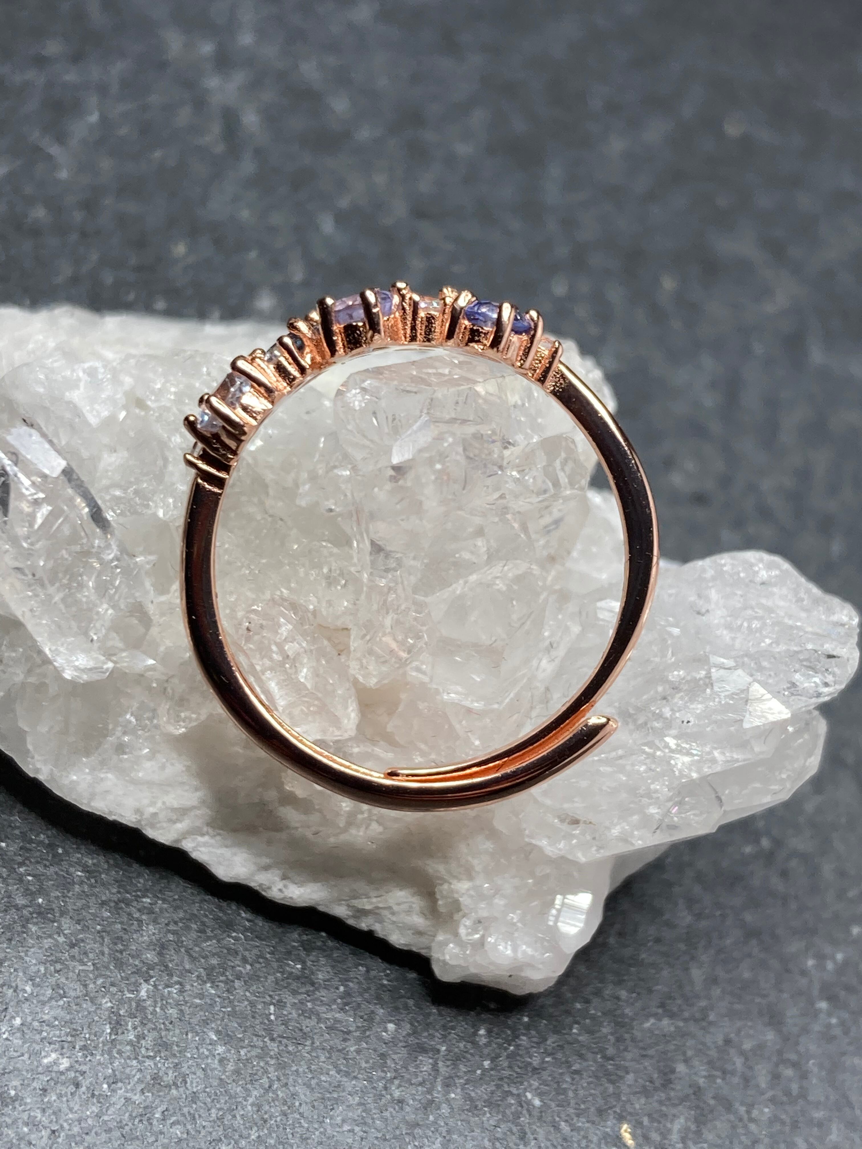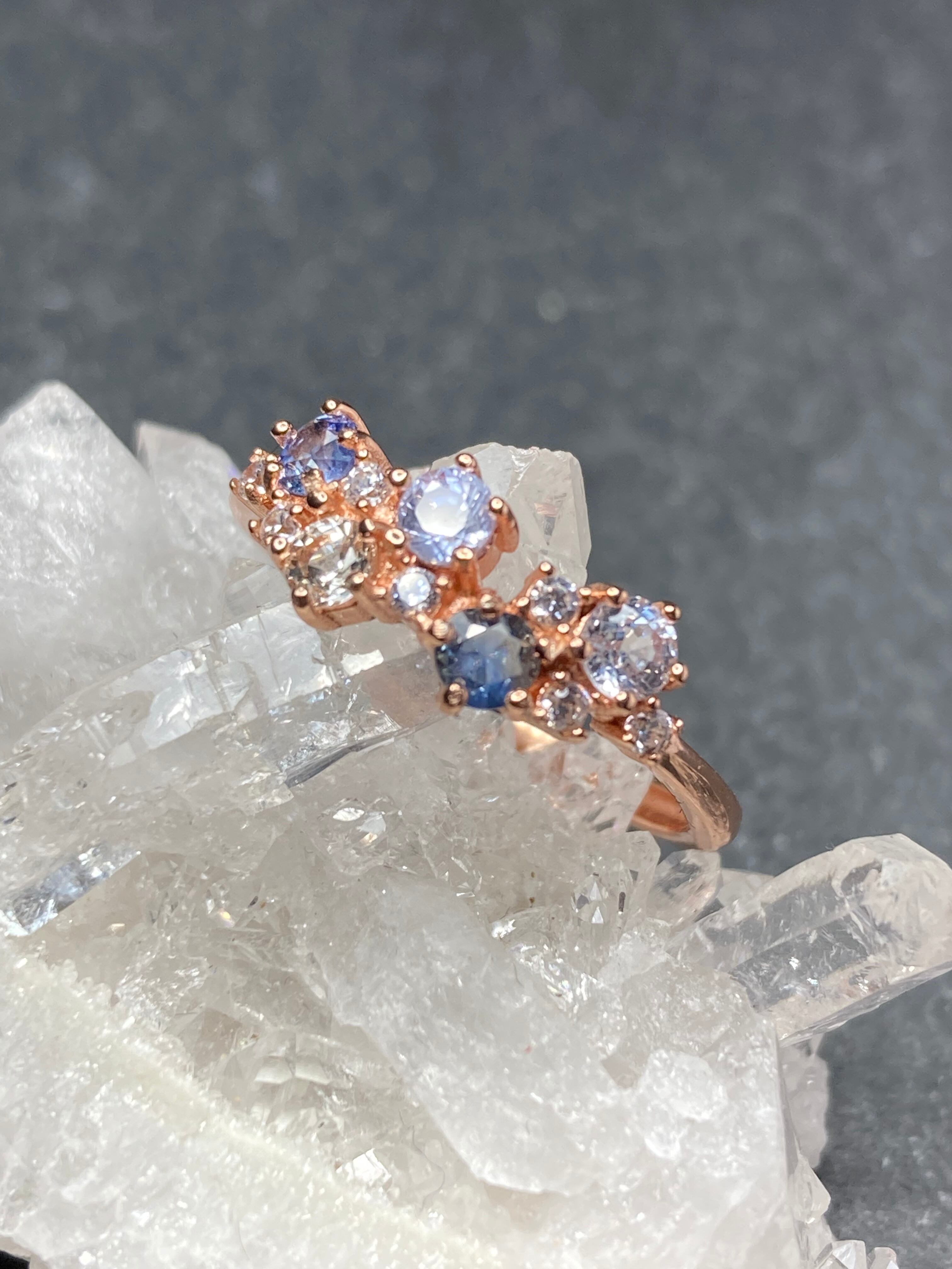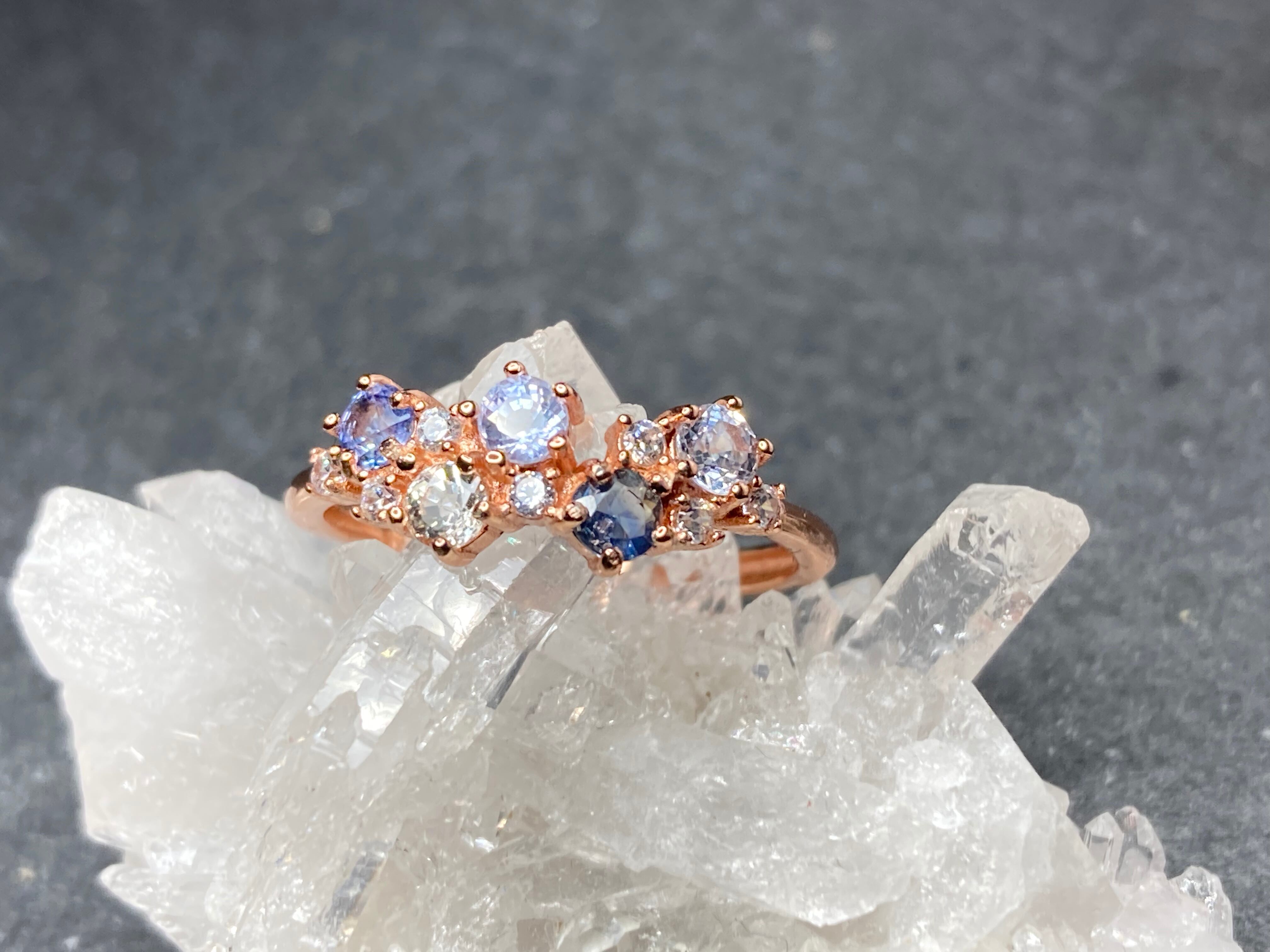 花かんむりのように配置されたブルーからホワイトのサファイアたちが並んで咲いています。