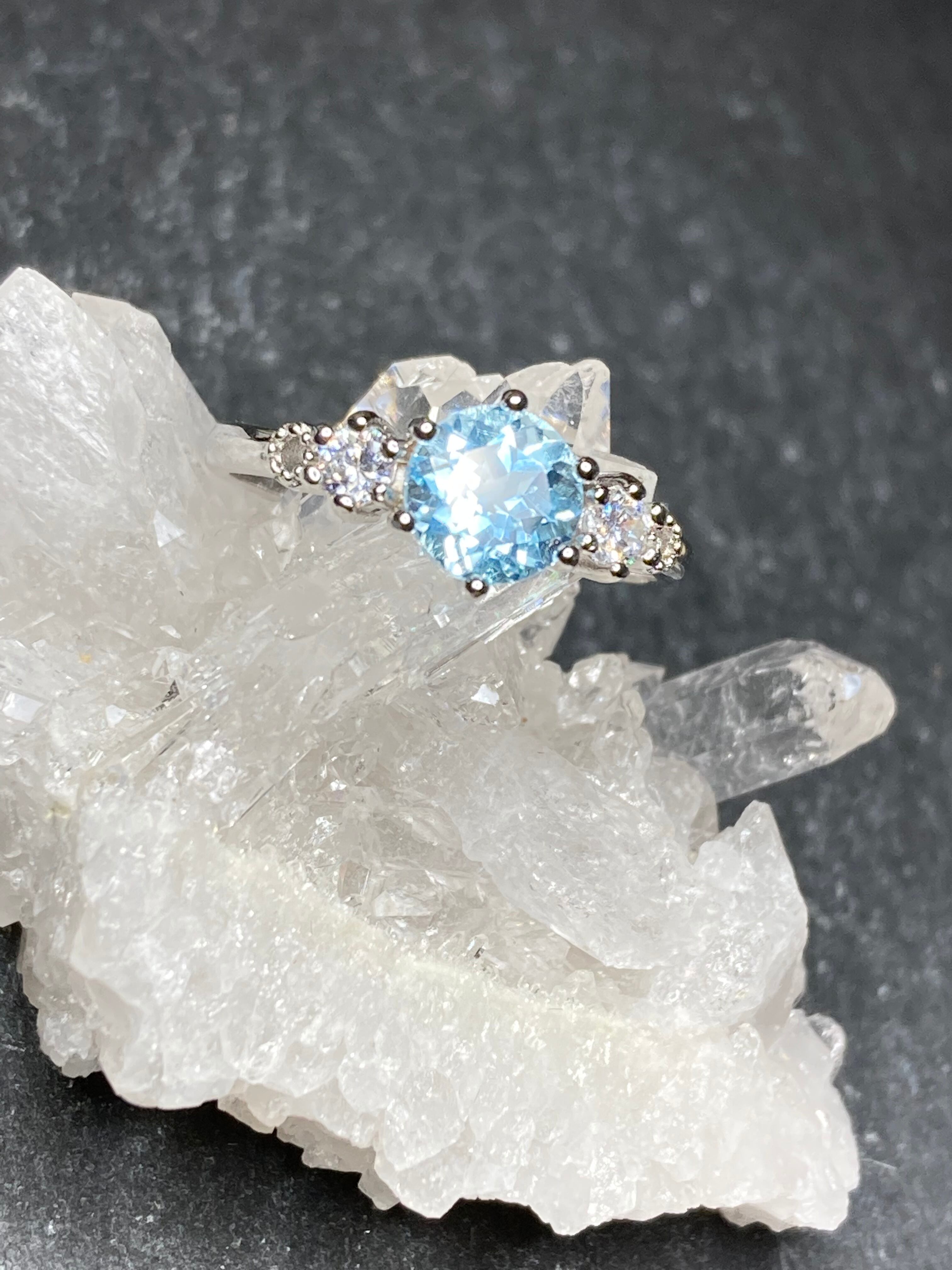 美しい青空の様に澄み渡ったカラーのブルートパーズをひとつぶ、リングの中央に添えました。