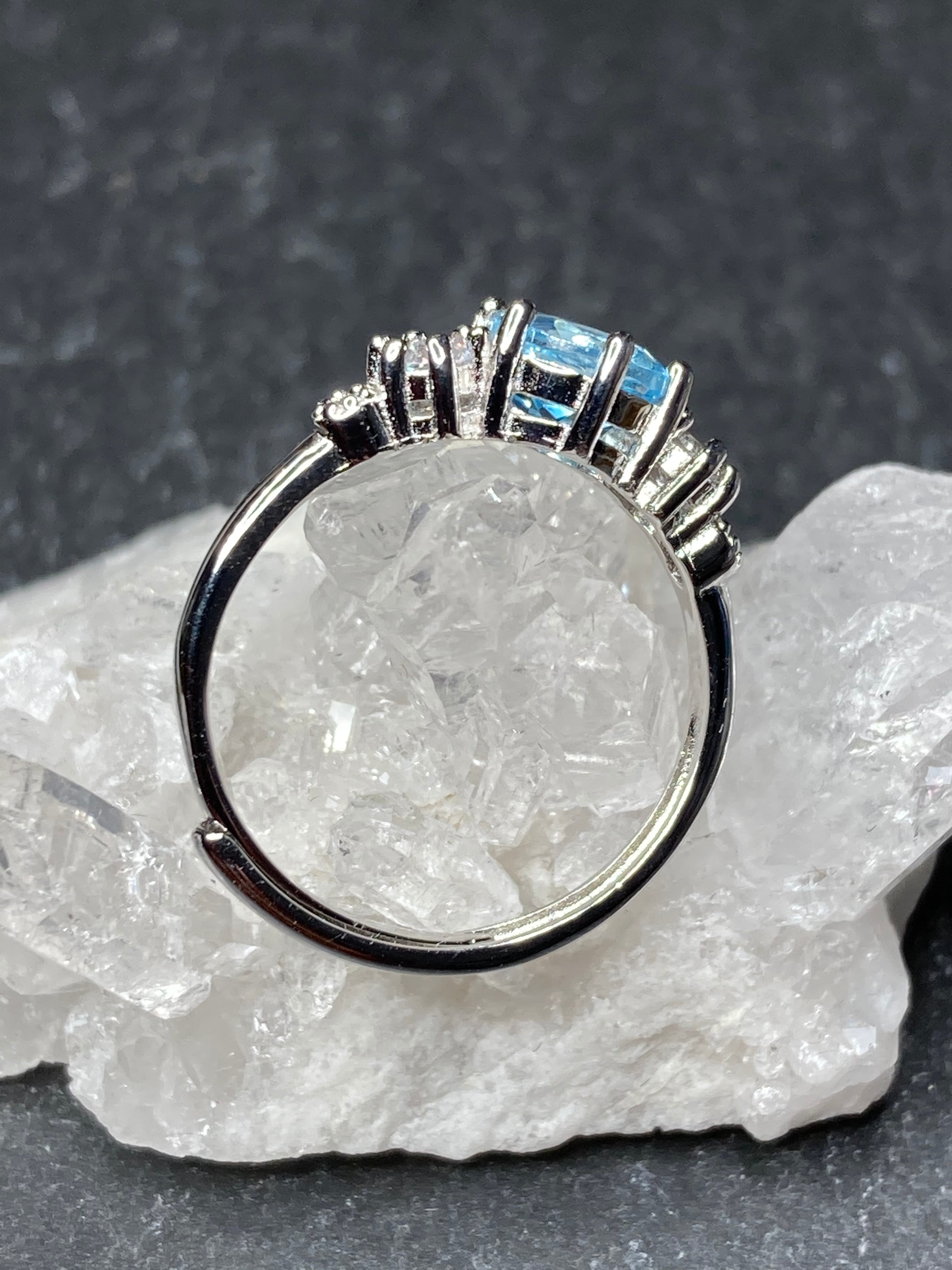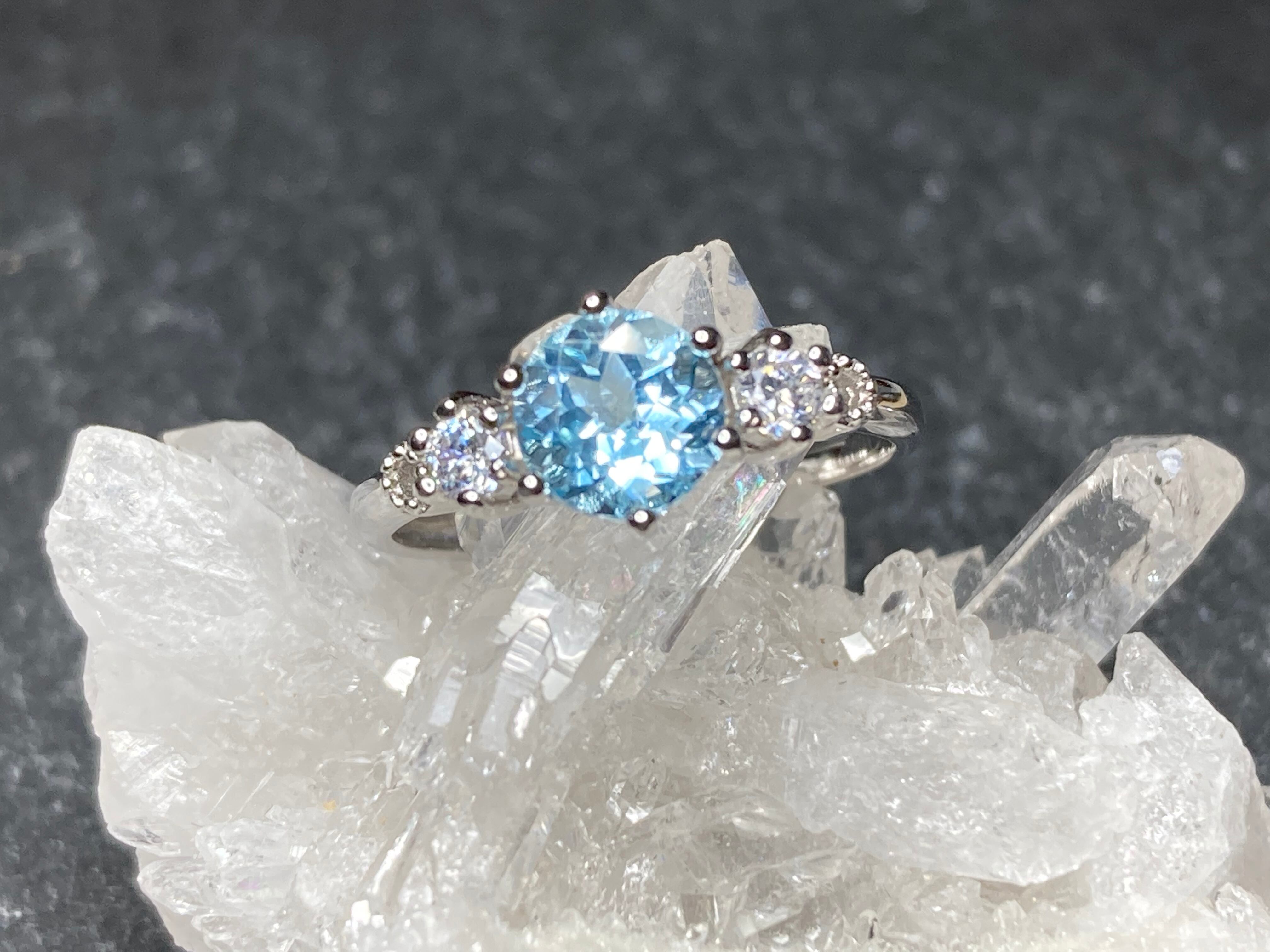 両端のジルコニアがおおきなブルートパーズの美しい輝きをより一層引き立て、キラキラと輝きます
