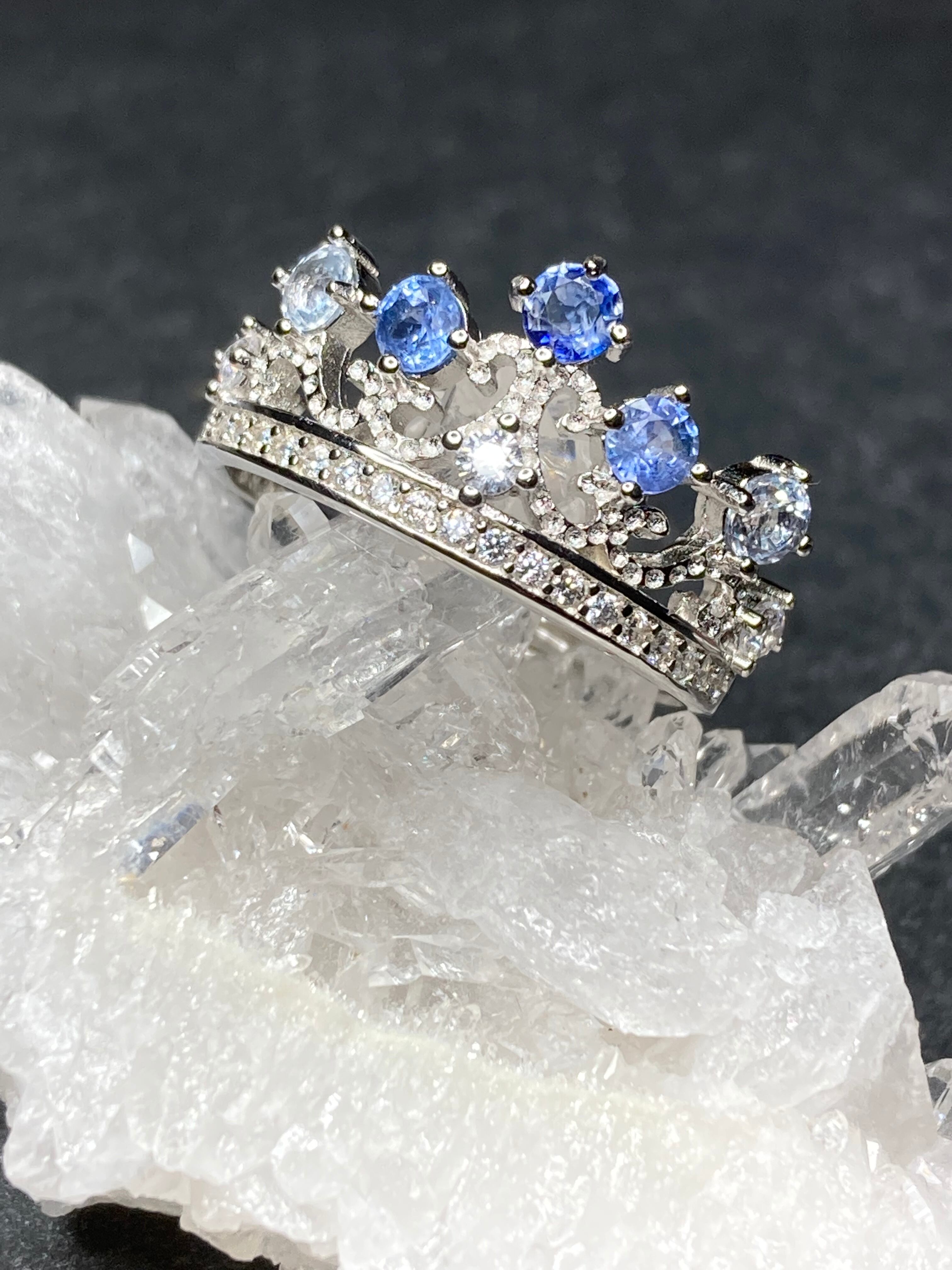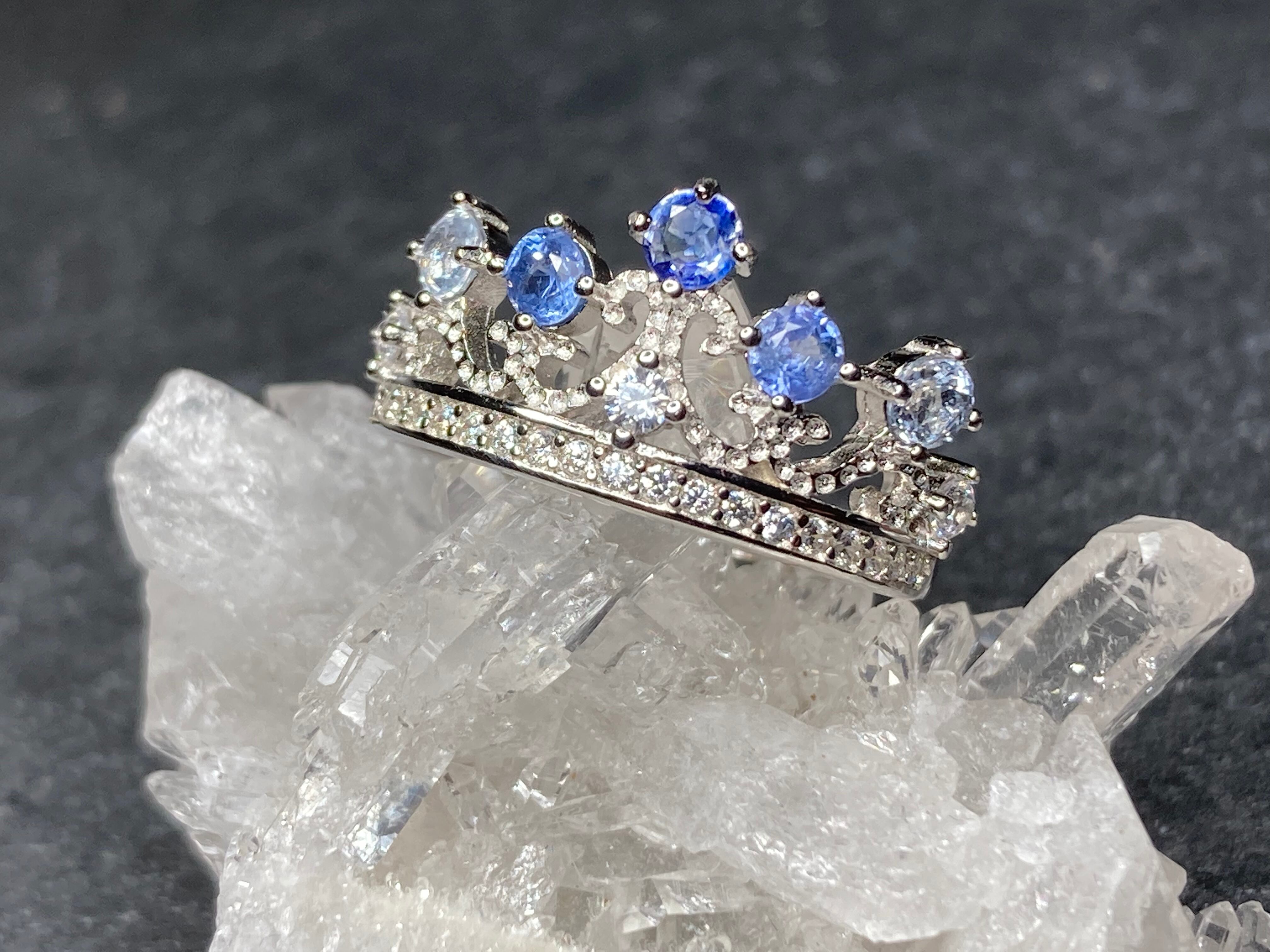 王冠をのトップに立つサファイアはそれぞれ違った色味を放ちらどの角度から見てもサファイアの輝きをお楽しみいただけます。