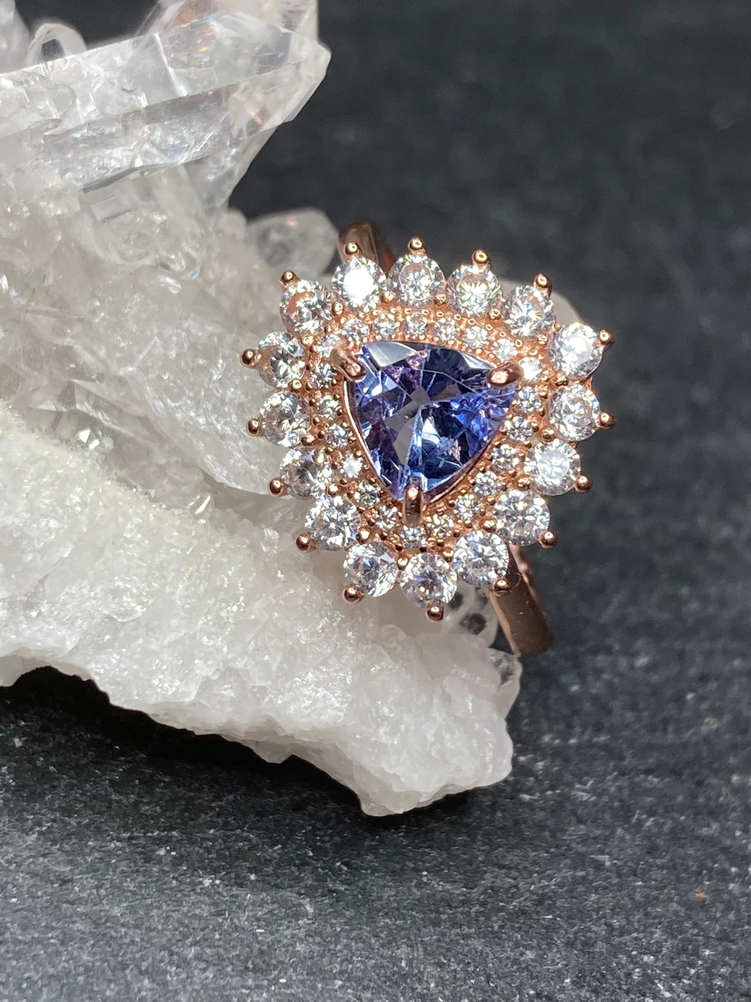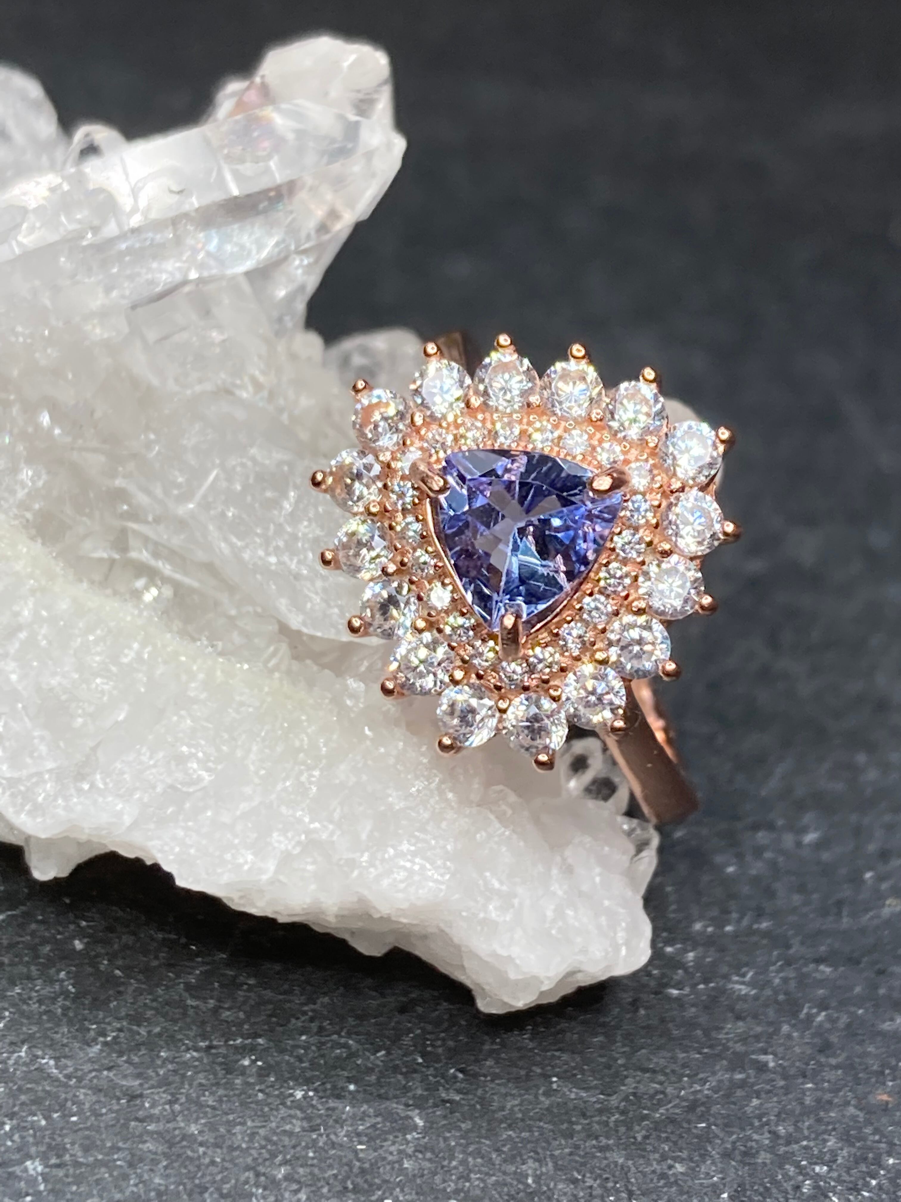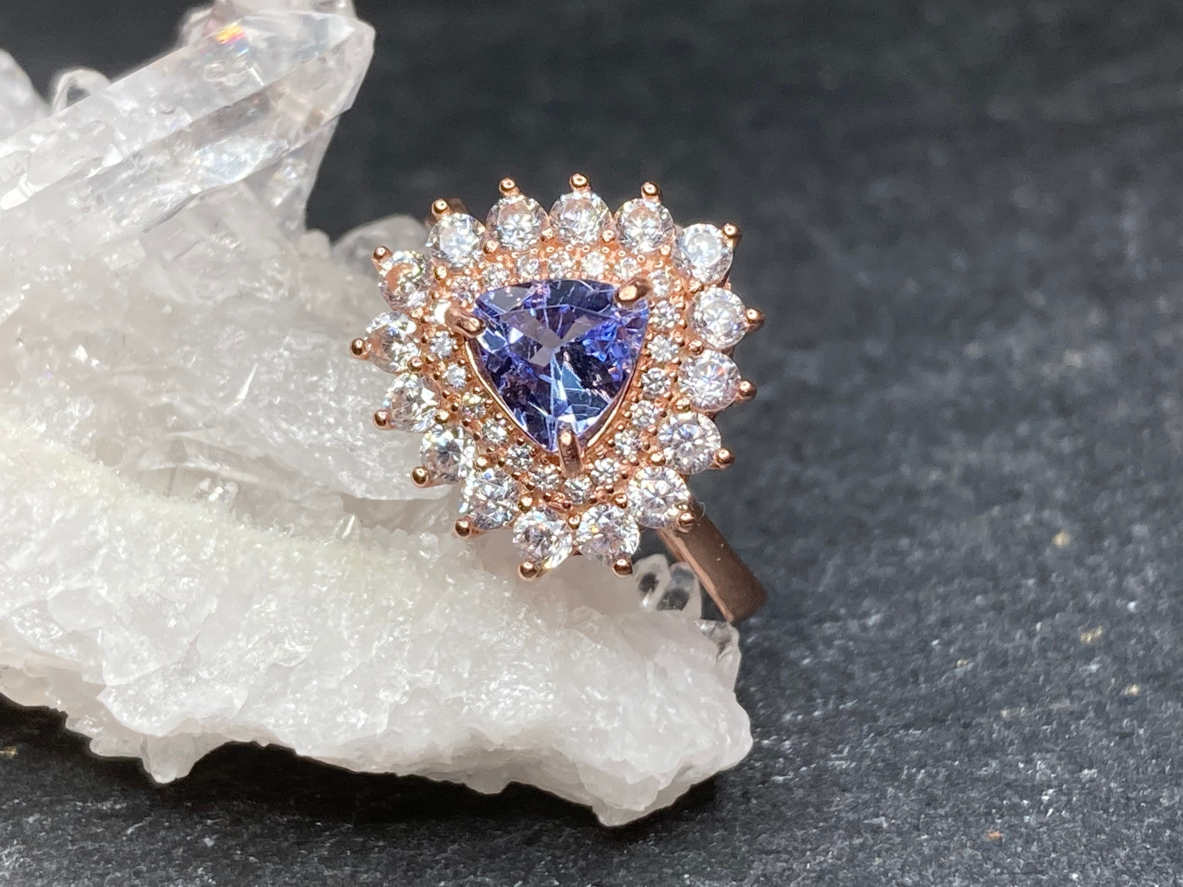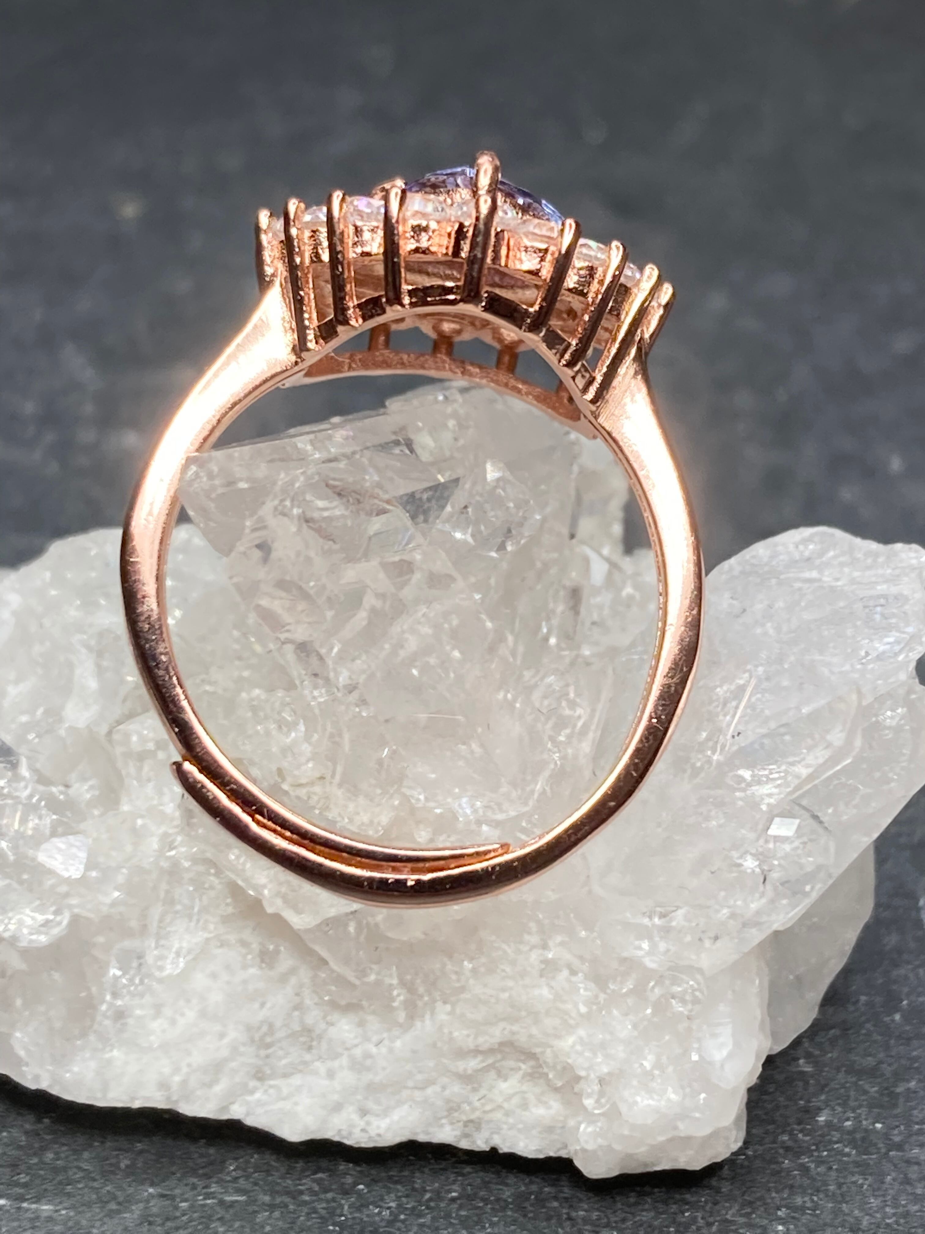 煌びやかに散るジルコニアの中央に佇む、淡めパープルが美しいゾイサイトのリングです。