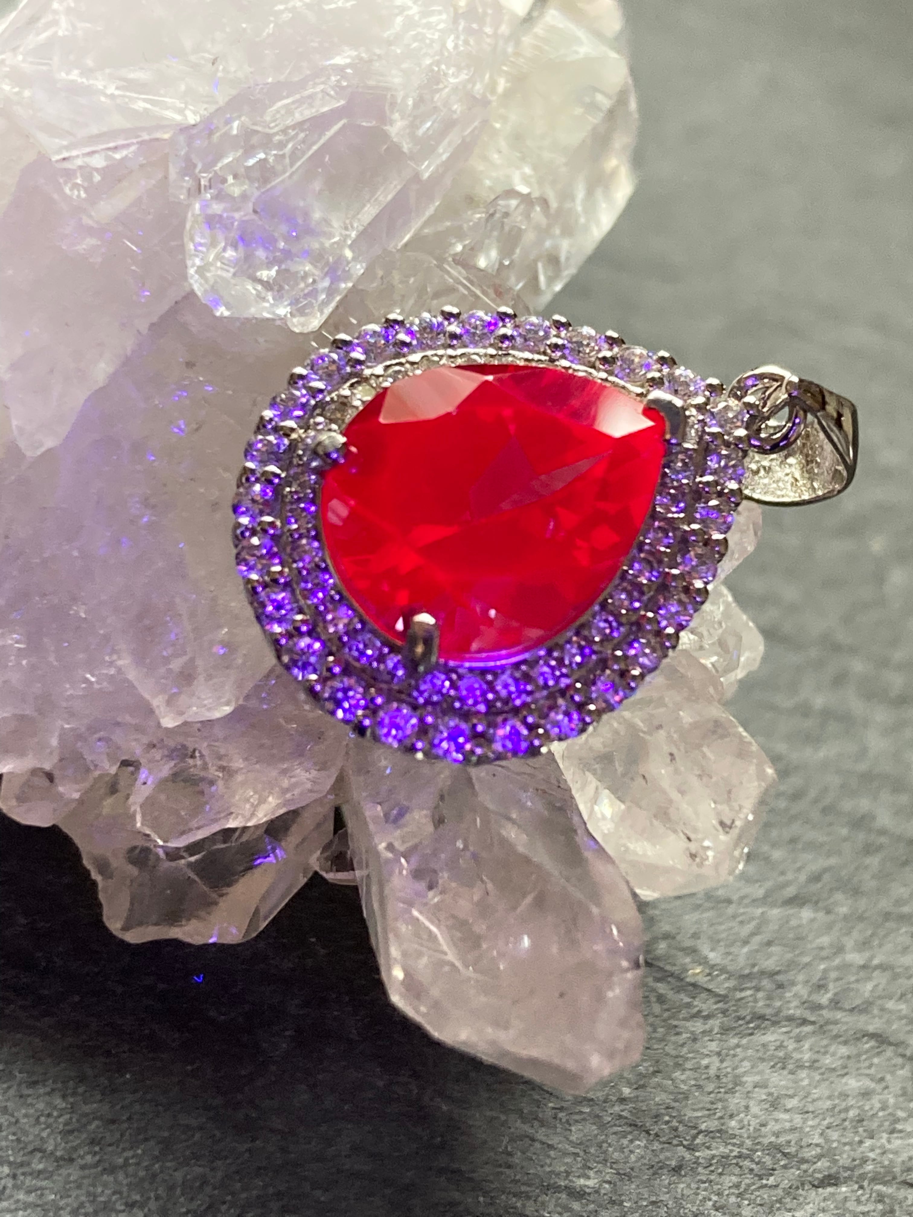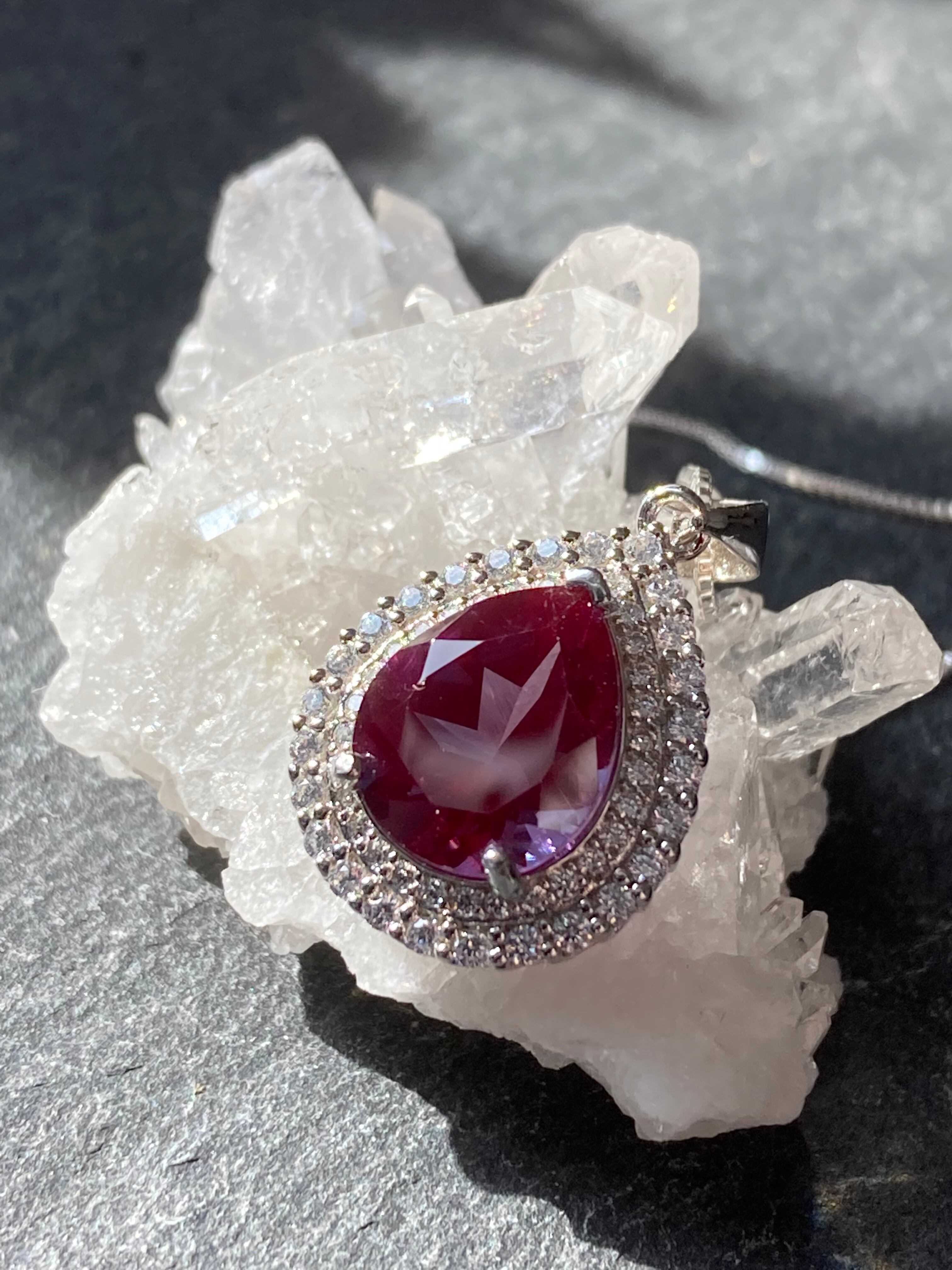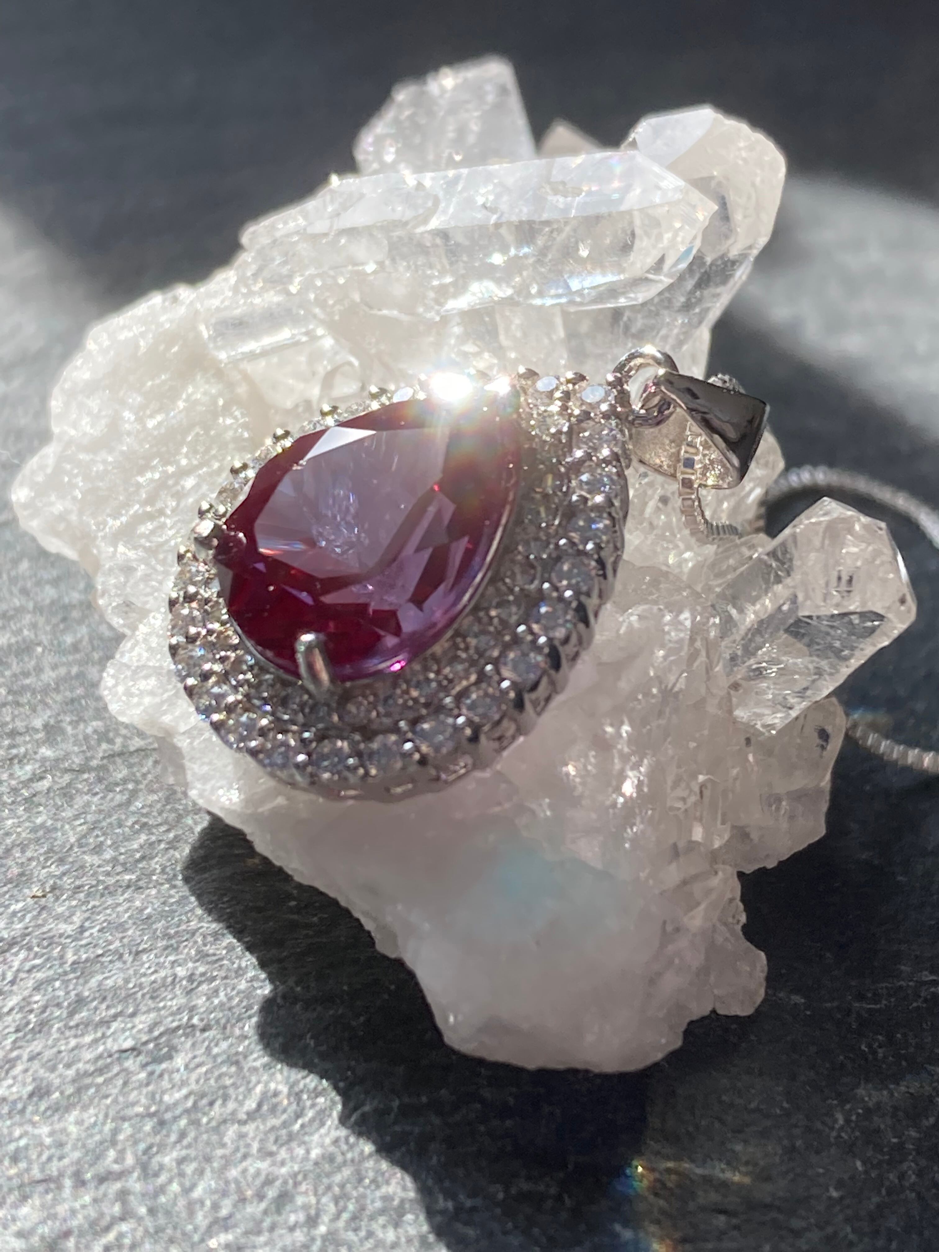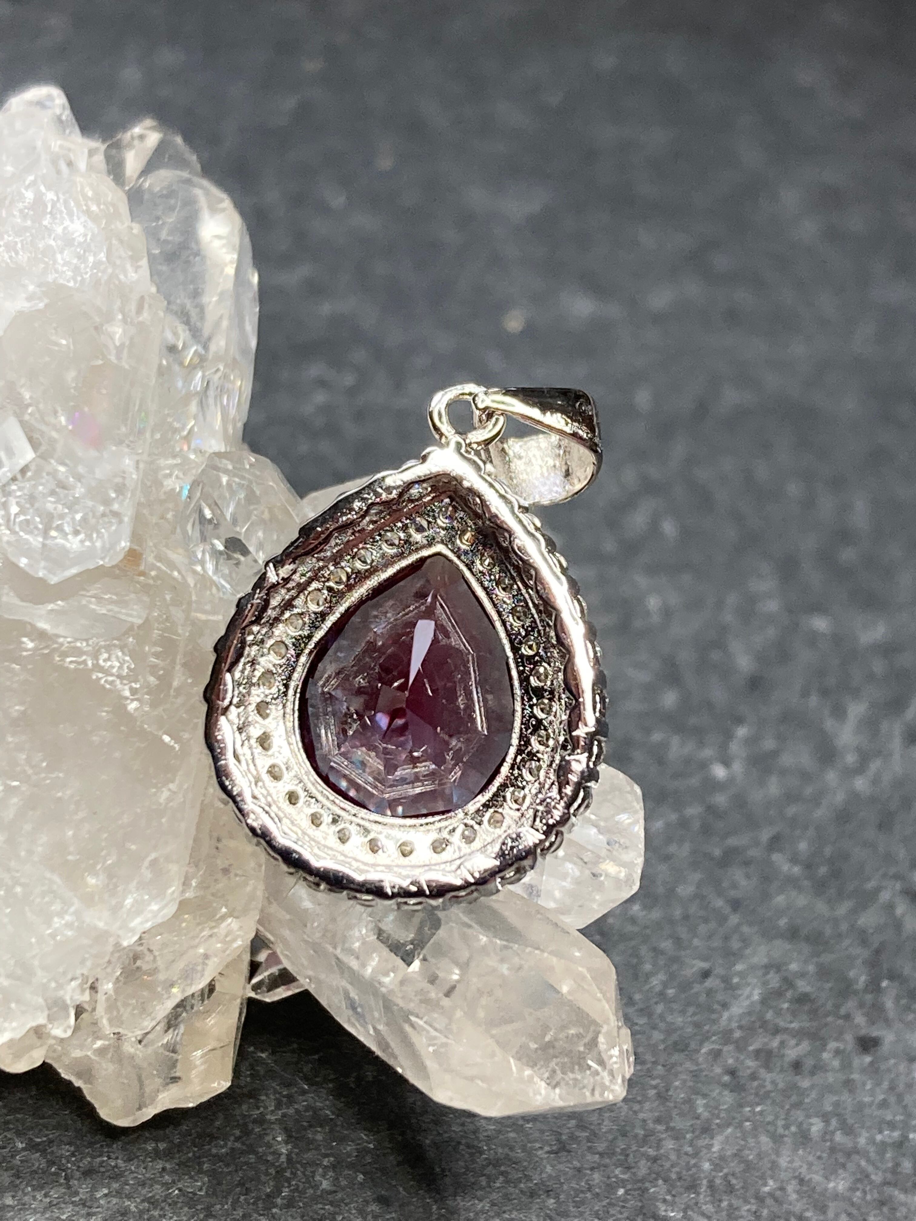 煌びやかに散るジルコニアの中央に佇む、深いパープルが美しい合成アレキサンドライトのペンダントです。