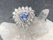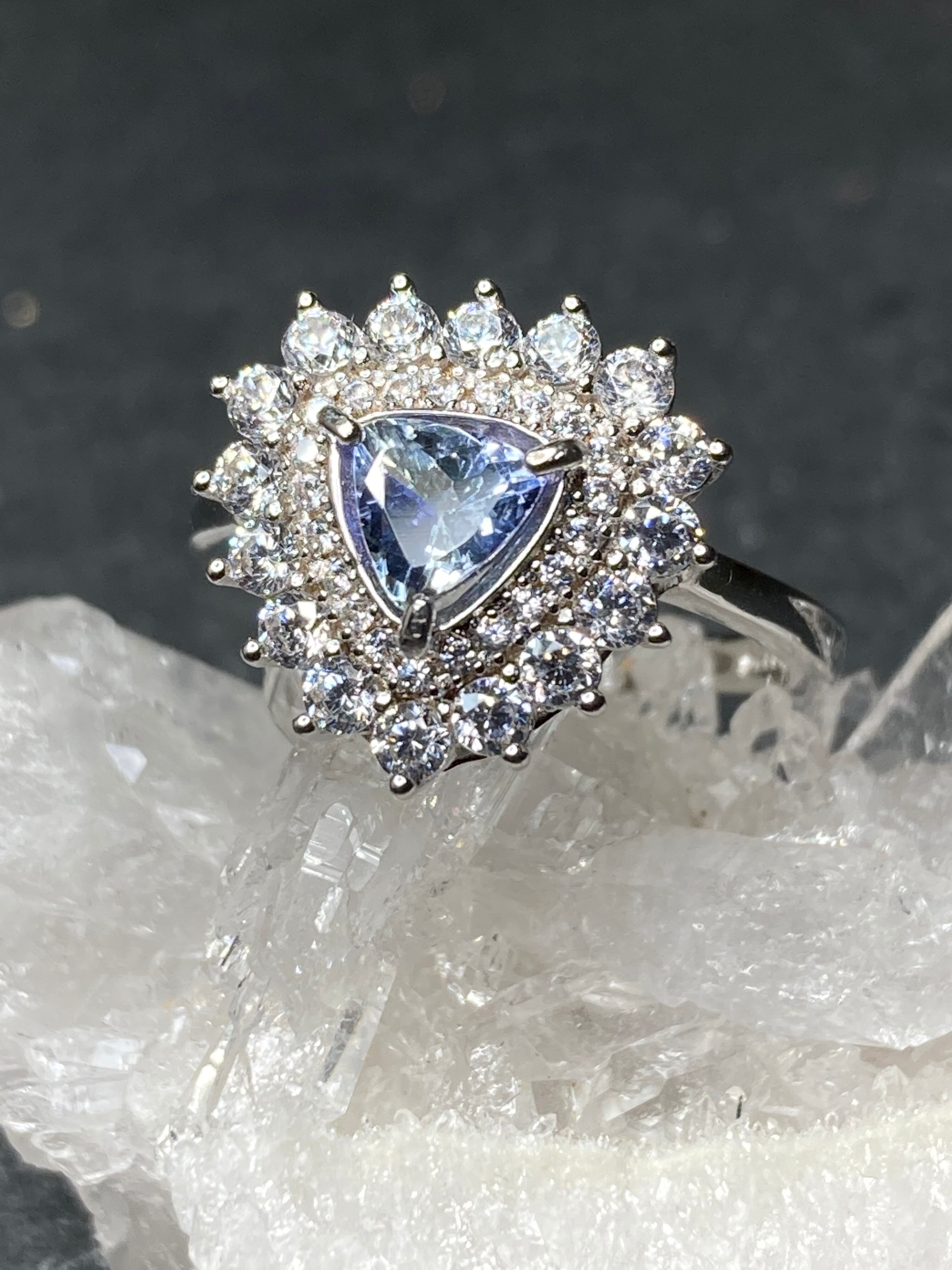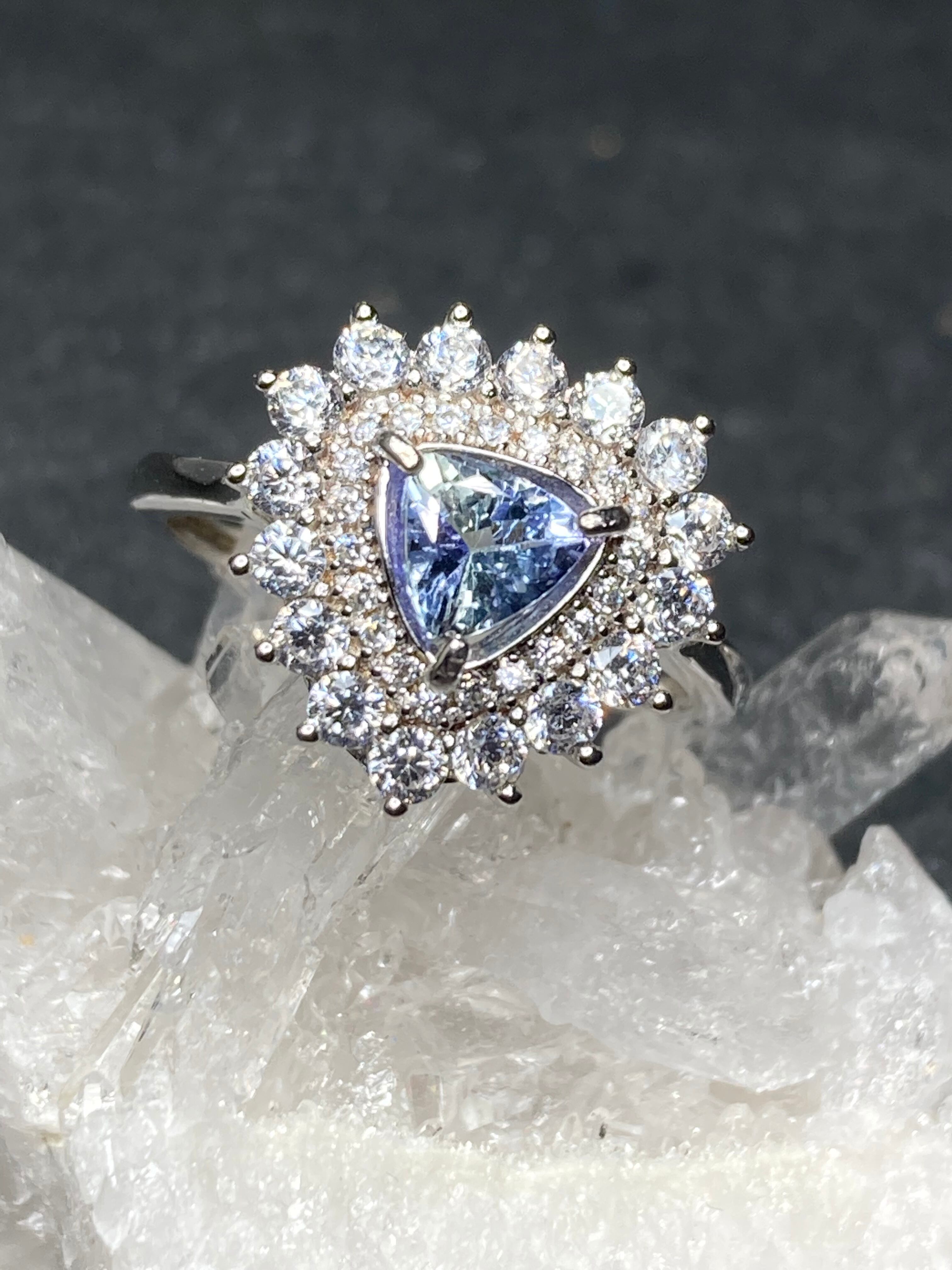 煌びやかに散るジルコニアの中央に佇む、淡めブルーが美しいゾイサイトのリングです。
