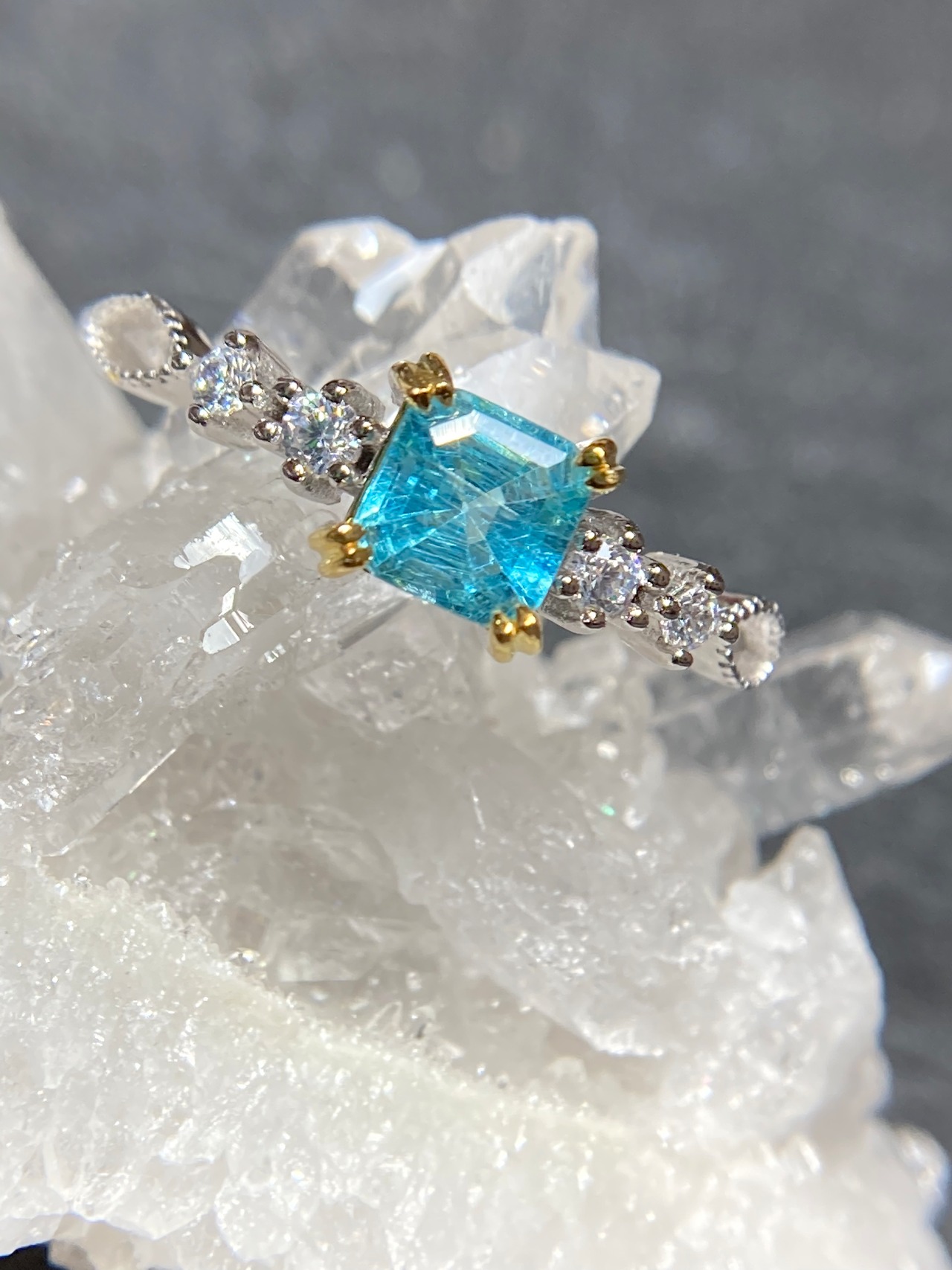 サイドに並んだジルコニアたちがキラキラと輝き、アパタイトの美しさを引き立てます。