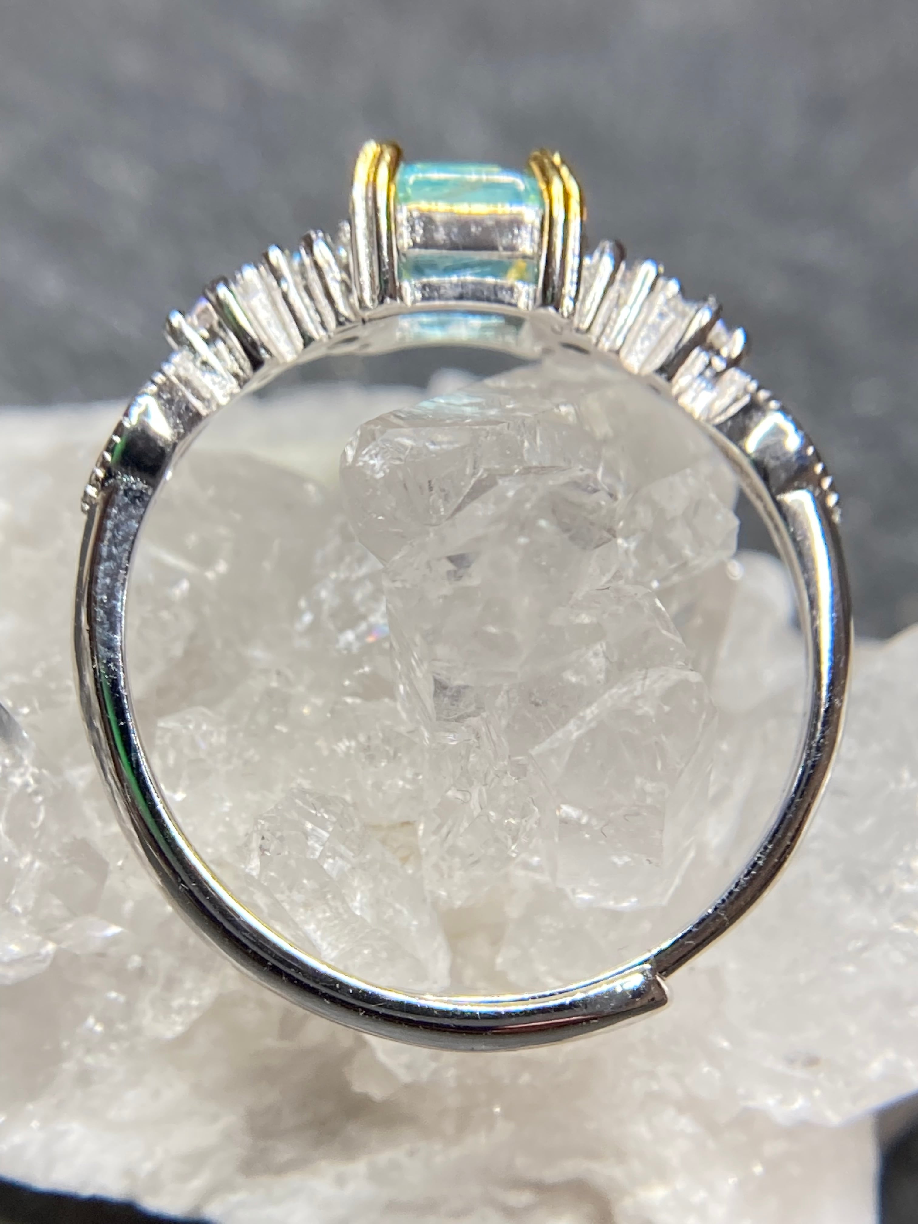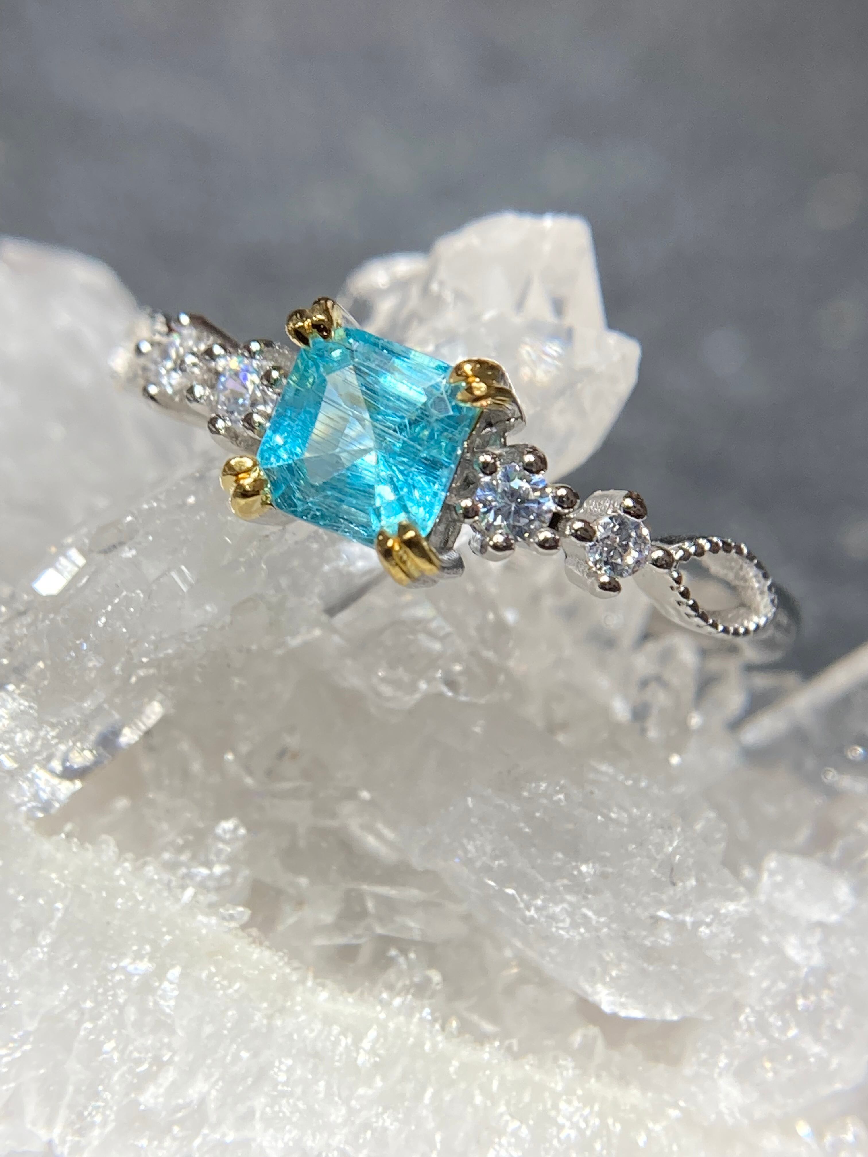 スクエアカットの中に流星群のように美しいインクルージョンが見えるアパタイトのリングです。
