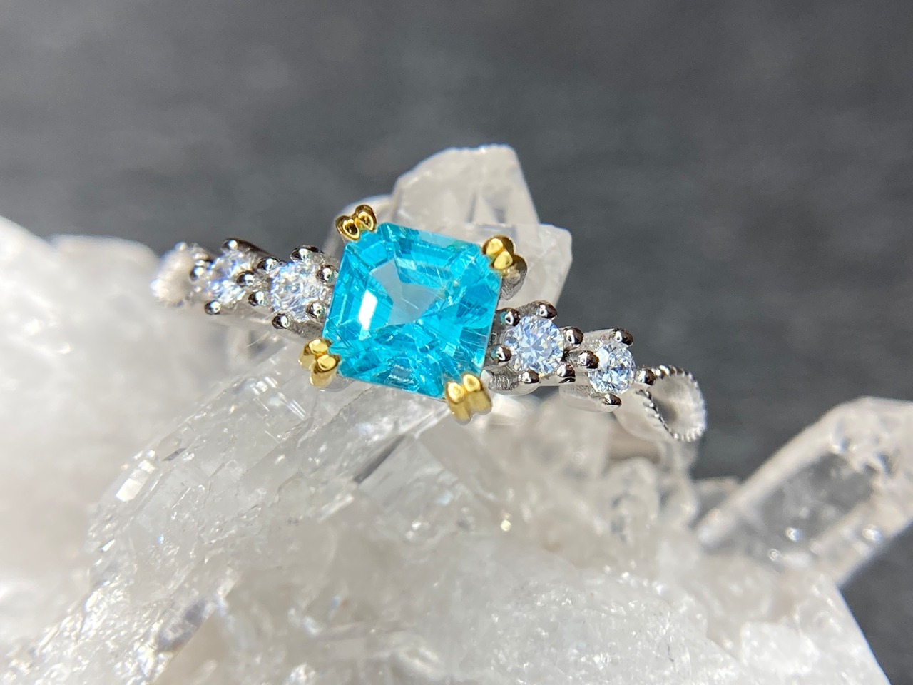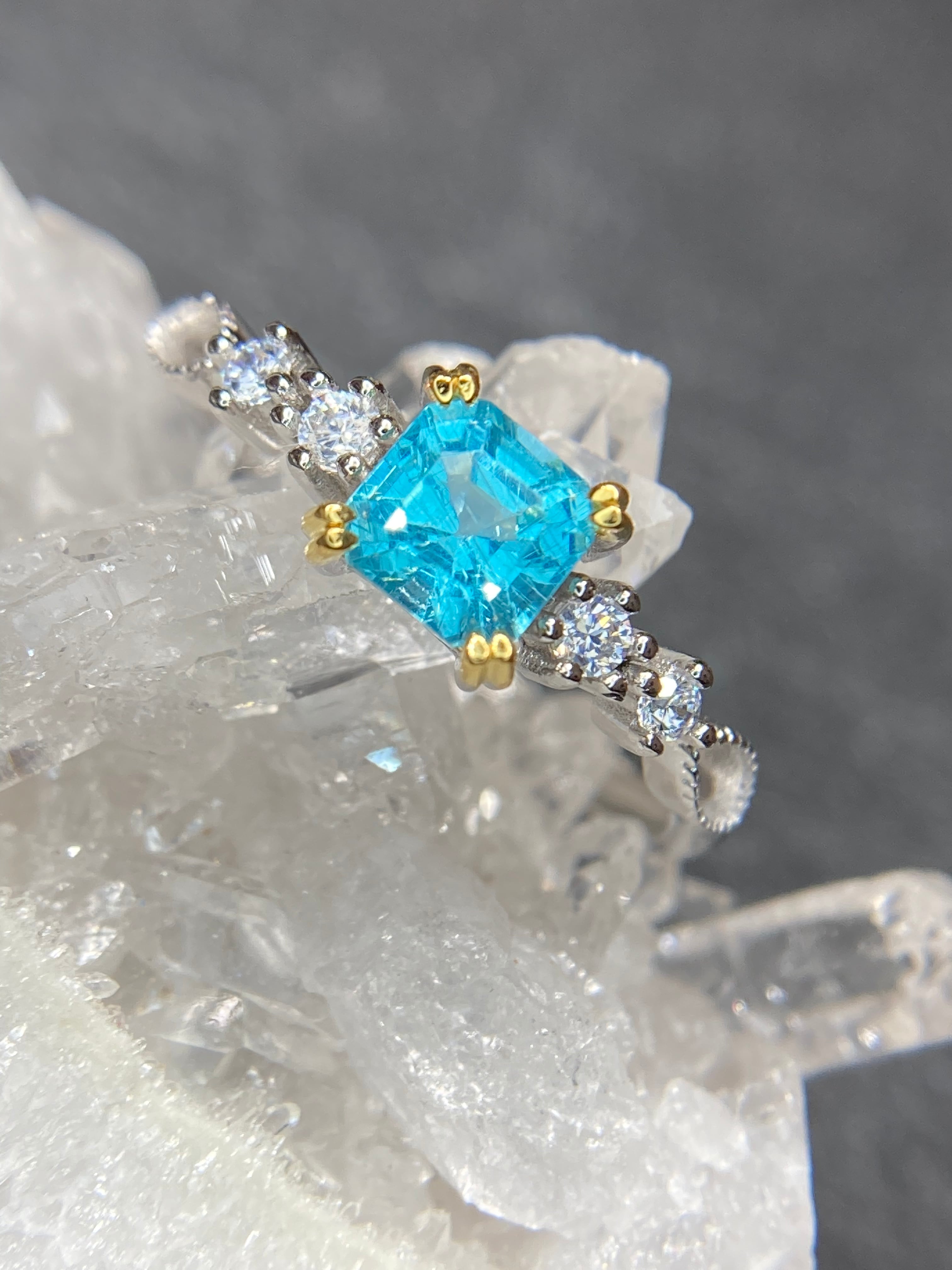 サイドに並んだジルコニアたちがキラキラと輝き、アパタイトの美しさを引き立てます。